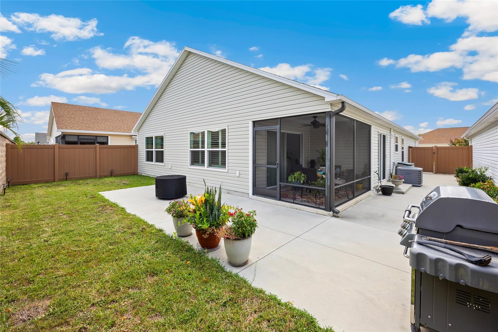 PRICE IMPROVED!! Welcome to this beautifully appointed Melrose model villa nestled in the highly sought-after Village of DeSoto in The Villages, Florida! This exceptional 3-bedroom, 2-bath home combines comfort, quality, and convenience—perfect for those ready to start enjoying The Villages lifestyle immediately. Every inch of this home has been meticulously maintained and thoughtfully upgraded to create a truly move-in-ready residence. From the moment you arrive, you’ll notice the home’s excellent curb appeal. The exterior showcases enhanced landscaping with decorative stone, mulch borders, and manicured plantings, beautifully highlighted by LED soffit lighting that adds charm and security in the evenings. A screened front lanai with dual ceiling fans creates a welcoming first impression and a perfect place to sit back and enjoy your morning coffee or greet neighbors. Step inside and you’re immediately greeted by a spacious open-concept floor plan designed for both everyday comfort and effortless entertaining. The main living area features vaulted ceilings, crown molding, plantation shutters, designer lighting, and ceiling fans in every bedroom and living space for year-round comfort. Large sliders open to a screened rear lanai, which overlooks a private fenced yard—ideal for pet owners, outdoor dining, or simply relaxing in peace and privacy. The home has been freshly painted in tasteful designer colors, adding to its bright, airy, and modern feel. The kitchen is the heart of the home and a true highlight. It boasts gas appliances, a walk-in pantry, plentiful cabinetry and counter space, and an open bar area perfect for casual dining or entertaining guests. Whether you’re preparing family meals or hosting friends, this kitchen offers both functionality and style. The adjacent dining area flows seamlessly into the living room, creating a warm and inviting environment ideal for gatherings and conversation. The primary suite is a private retreat featuring a tray ceiling with crown molding and accent color, a spacious walk-in closet, and a luxurious en suite bath. The bath includes a Roman walk-in shower, double vanity sinks, and elegant finishes that make it feel like a personal spa. Guests will feel right at home in the two additional bedrooms. One guest room features a custom built-in office workstation, offering flexible use as a home office, hobby room, or cozy den. The third bedroom is perfect for visitors, and both share access to a beautifully finished second full bath conveniently located off the hallway. Additional highlights include natural gas heating, a full two-car garage with ample storage, dual ceiling fans on both the front and rear lanais, and low-maintenance exterior finishes designed to keep upkeep simple. Living in the Village of DeSoto means you’re in one of the most desirable and active areas of The Villages—just minutes from Magnolia Plaza, Brownwood Paddock Square, and the new Eastport Town Square currently under development. You’ll be near shopping, restaurants, recreation centers, walking trails, golf courses, and more. This exceptional home truly represents the perfect blend of beauty, functionality, and low-maintenance living, offering the ultimate opportunity to enjoy everything The Villages has to offer. Schedule your private showing today and see why this Melrose model villa stands out above the rest. Realtor is the owner.