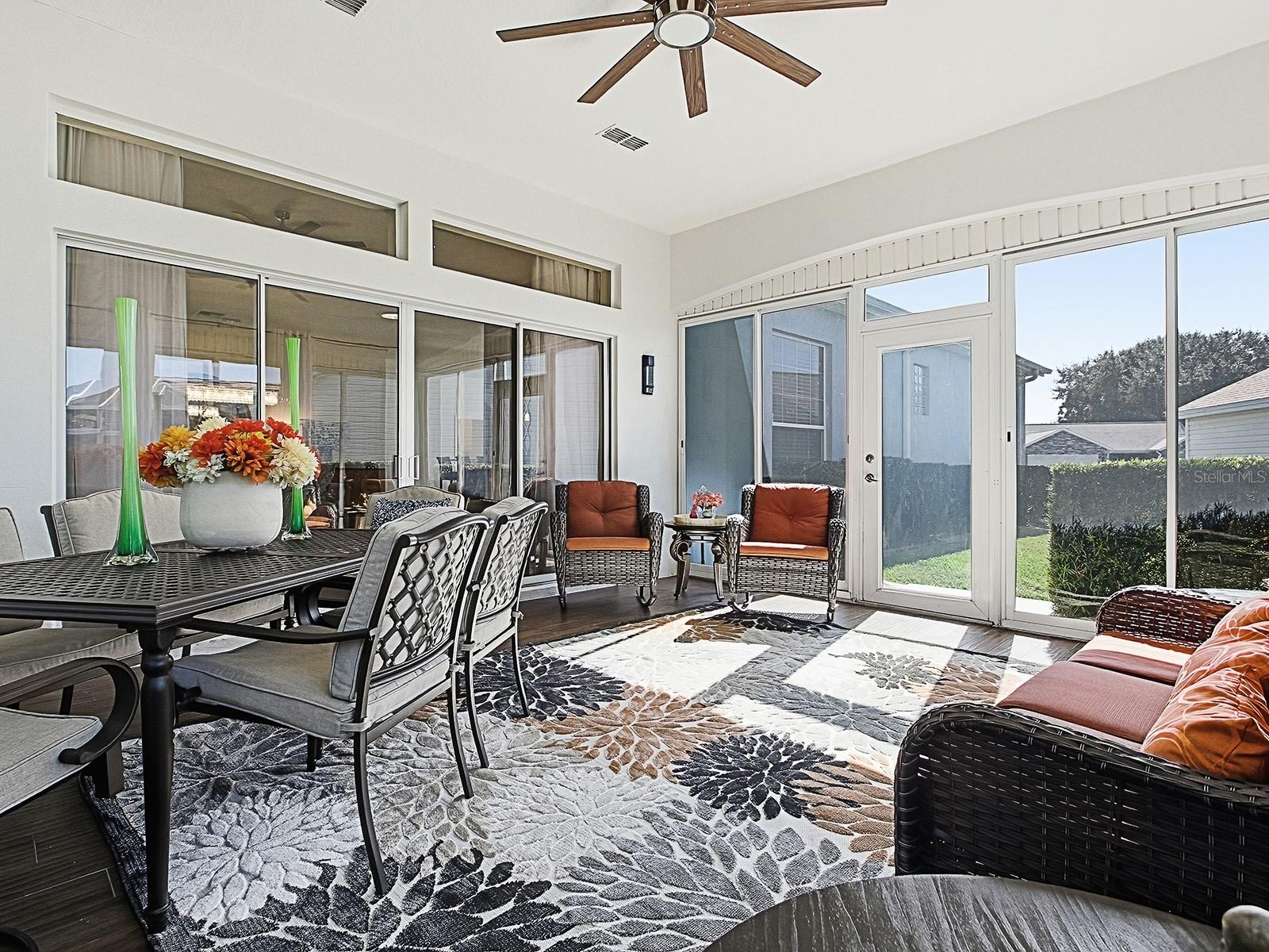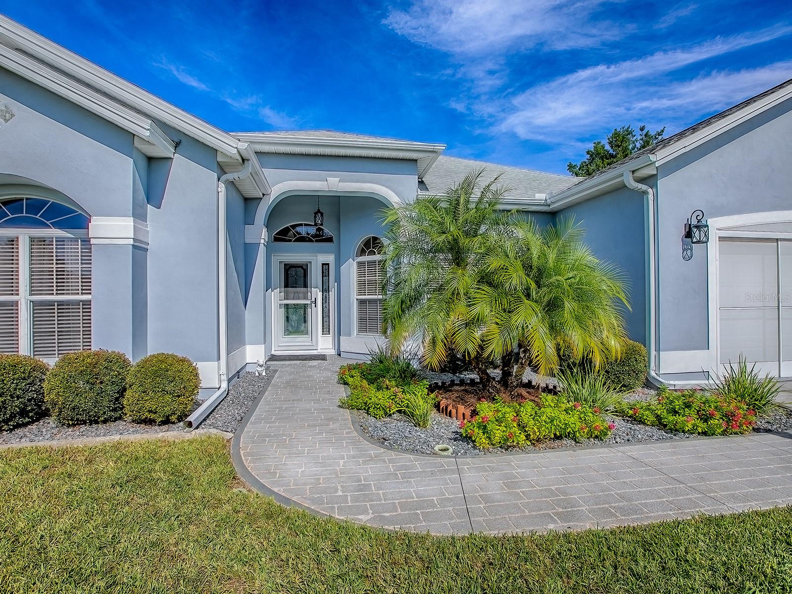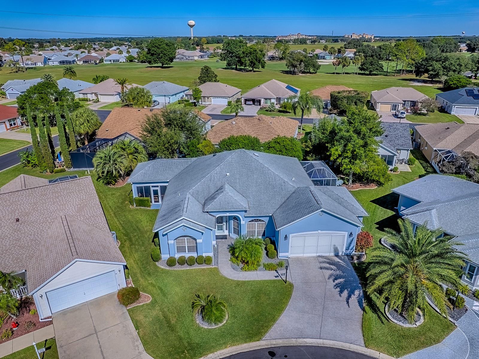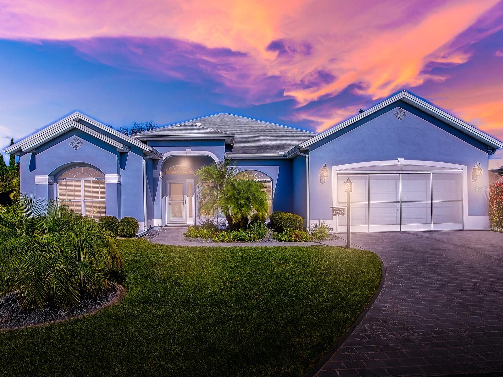 Bond Paid! This beautifully maintained Rancho Mirage Premier home is perfectly positioned on a quiet cul-de-sac in the desirable Village of Palo Alto. Step inside to discover neutral tones, HIGH CEILINGS throughout, and elegant tray ceilings in both the living room and primary suite. Thoughtful updates include NEW fans and lighting, luxury vinyl plank flooring (NO CARPET), and a built-in electric fireplace for cozy ambiance. The newly updated kitchen impresses with QUARTZ countertops, white stair-step cabinetry, a tile backsplash, newer appliances, and an open layout that flows seamlessly into the living and dining areas. A solar tube between the dining and living rooms fills the space with beautiful natural light. Just off the spacious living room, enjoy the ENCLOSED LANAI with heat and air and wood-look tile flooring, perfect for relaxing year-round. The spacious primary suite features dual closets, a private BIRDCAGED PATIO, and a luxurious ensuite bath with GRANITE countertops, a tiled shower with seamless glass door, and a river rock floor. The stretched garage provides ample room for two cars and a golf cart, featuring painted floors, a screen door, pull-down attic stairs, and an extra storage closet with a utility sink. The second bedroom is located at the front of the home (currently without a closet but with space to add one) and is presently being used as a den. The third guest bedroom is spacious and has a double-door closet. The guest bathroom has been updated with GRANITE countertop and tub/shower combo with glass door. The laundry room is equipped with storage cabinets and a front-load washer and dryer on pedestals. Other updates include: Roof (2020), HVAC (2015). This home has a VA assumable loan at a low interest rate. (Preapproval required) Conveniently located between Spanish Springs Town Square and Lake Sumter Landing Market Square, close to Tierra Del Sol Country Club and Championship Golf Course, Hacienda Regional Recreation Center, The Villages Regional Hospital, 441/27 Shopping Corridor, and 466. Come fall in love with this lovely home!