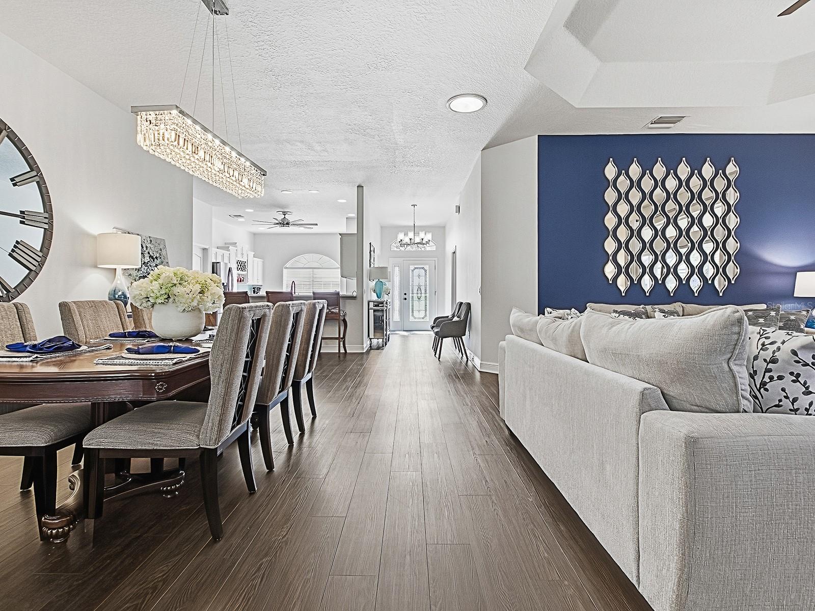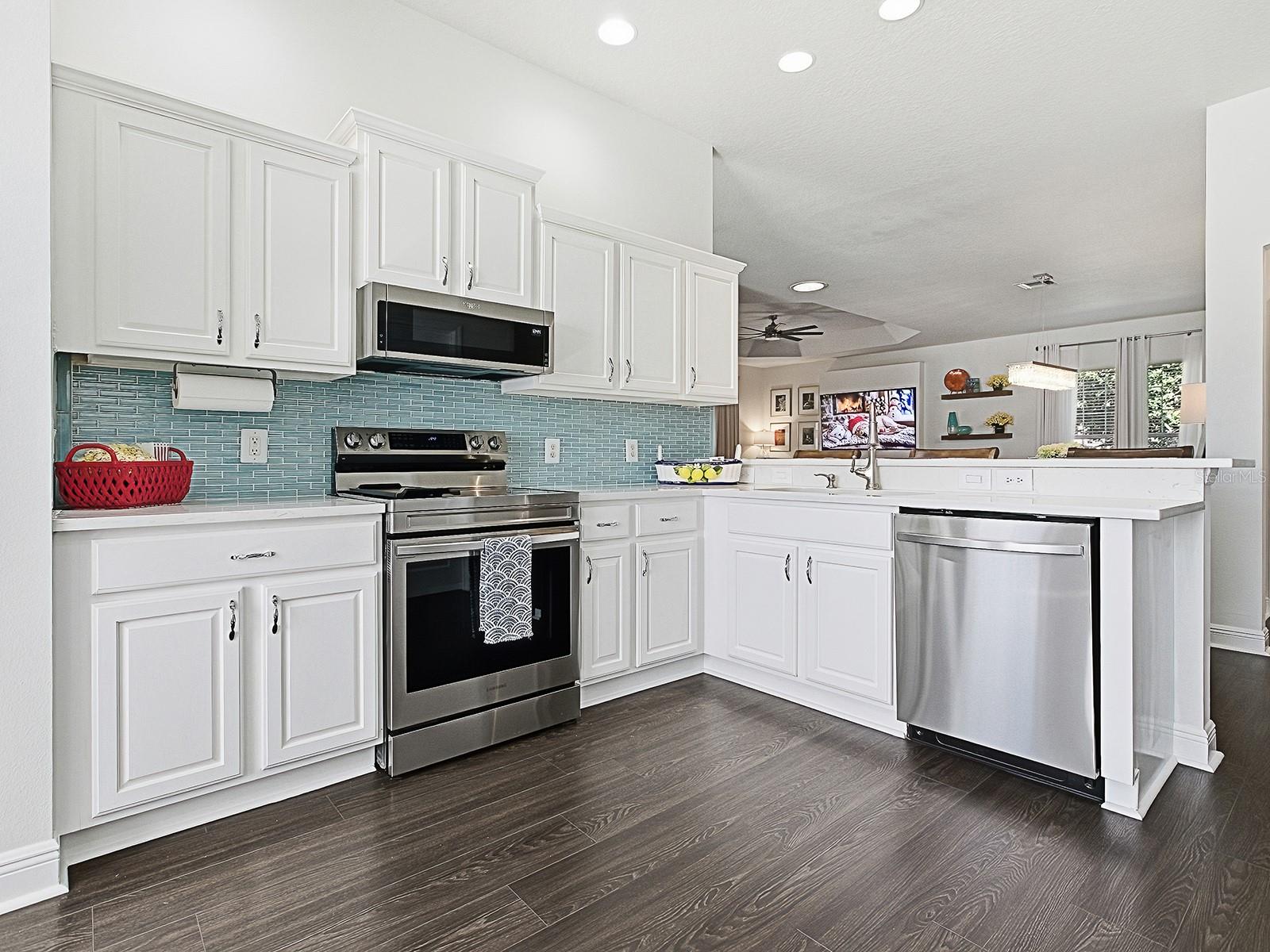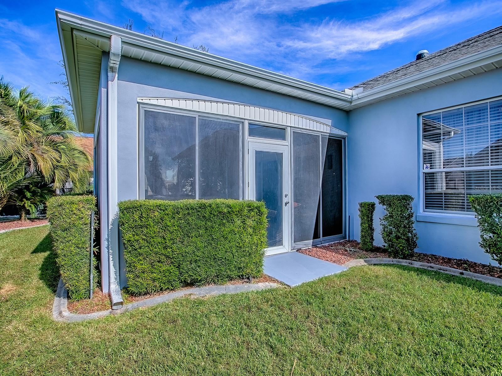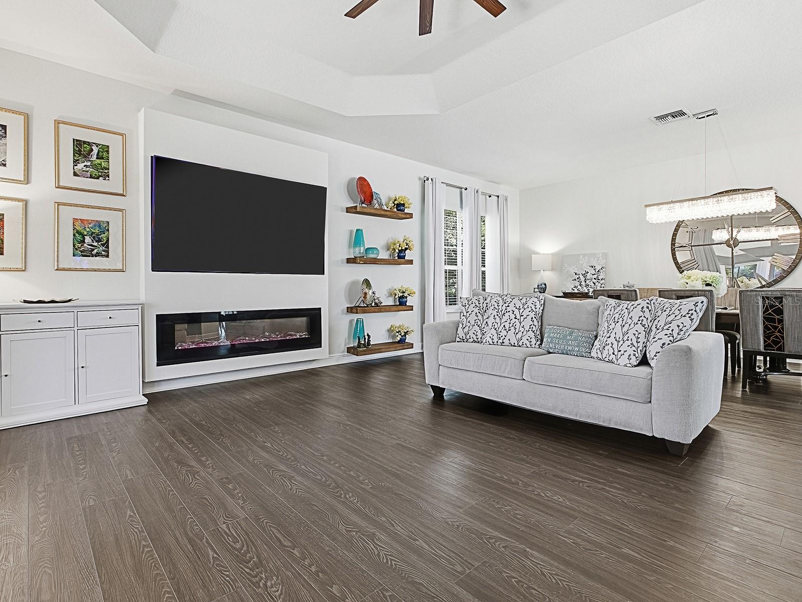 Bond Paid! This beautifully maintained Rancho Mirage Premier home is perfectly positioned on a quiet cul-de-sac in the desirable Village of Palo Alto. Step inside to discover neutral tones, HIGH CEILINGS throughout, and elegant tray ceilings in both the living room and primary suite. Thoughtful updates include NEW fans and lighting, luxury vinyl plank flooring (NO CARPET), and a built-in electric fireplace for cozy ambiance. The newly updated kitchen impresses with QUARTZ countertops, white stair-step cabinetry, a tile backsplash, newer appliances, and an open layout that flows seamlessly into the living and dining areas. A solar tube between the dining and living rooms fills the space with beautiful natural light. Just off the spacious living room, enjoy the ENCLOSED LANAI with heat and air and wood-look tile flooring, perfect for relaxing year-round. The spacious primary suite features dual closets, a private BIRDCAGED PATIO, and a luxurious ensuite bath with GRANITE countertops, a tiled shower with seamless glass door, and a river rock floor. The stretched garage provides ample room for two cars and a golf cart, featuring painted floors, a screen door, pull-down attic stairs, and an extra storage closet with a utility sink. The second bedroom is located at the front of the home (currently without a closet but with space to add one) and is presently being used as a den. The third guest bedroom is spacious and has a double-door closet. The guest bathroom has been updated with GRANITE countertop and tub/shower combo with glass door. The laundry room is equipped with storage cabinets and a front-load washer and dryer on pedestals. Other updates include: Roof (2020), HVAC (2015). This home has a VA assumable loan at a low interest rate. (Preapproval required) Conveniently located between Spanish Springs Town Square and Lake Sumter Landing Market Square, close to Tierra Del Sol Country Club and Championship Golf Course, Hacienda Regional Recreation Center, The Villages Regional Hospital, 441/27 Shopping Corridor, and 466. Come fall in love with this lovely home!