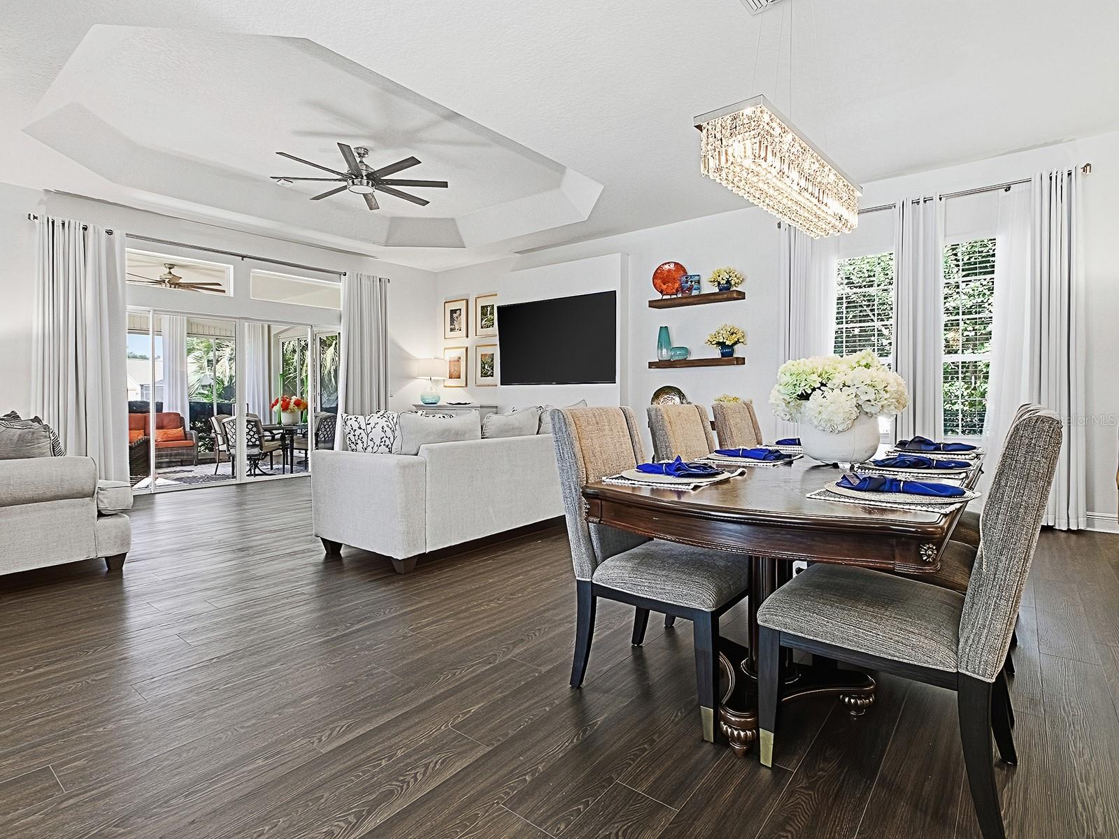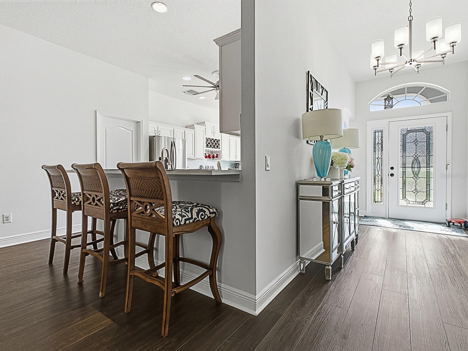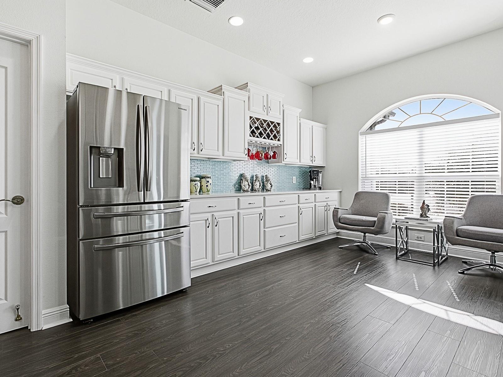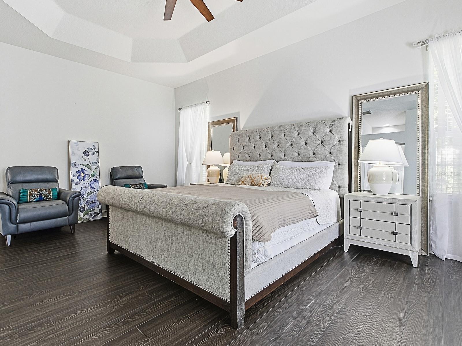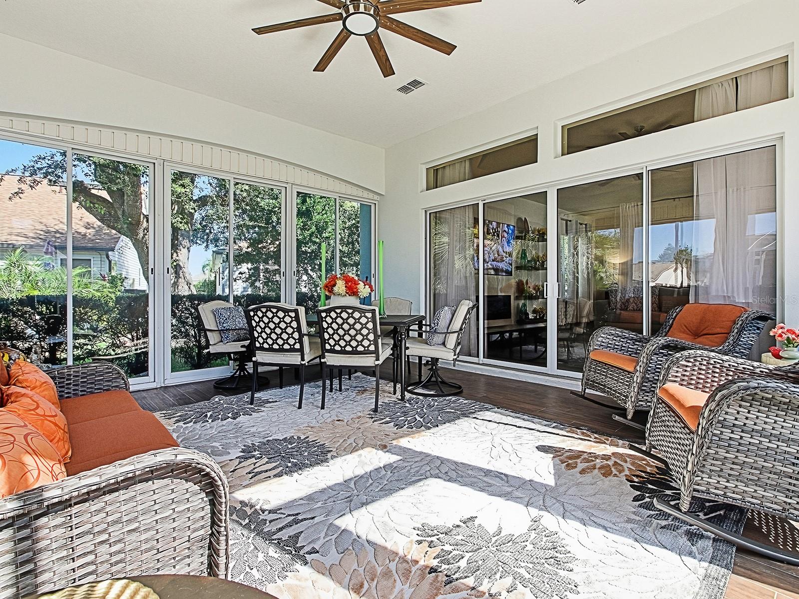 Bond Paid! This beautifully maintained Rancho Mirage Premier home is perfectly positioned on a quiet cul-de-sac in the desirable Village of Palo Alto. Step inside to discover neutral tones, HIGH CEILINGS throughout, and elegant tray ceilings in both the living room and primary suite. Thoughtful updates include NEW fans and lighting, luxury vinyl plank flooring (NO CARPET), and a built-in electric fireplace for cozy ambiance. The newly updated kitchen impresses with QUARTZ countertops, white stair-step cabinetry, a tile backsplash, newer appliances, and an open layout that flows seamlessly into the living and dining areas. A solar tube between the dining and living rooms fills the space with beautiful natural light. Just off the spacious living room, enjoy the ENCLOSED LANAI with heat and air and wood-look tile flooring, perfect for relaxing year-round. The spacious primary suite features dual closets, a private BIRDCAGED PATIO, and a luxurious ensuite bath with GRANITE countertops, a tiled shower with seamless glass door, and a river rock floor. The stretched garage provides ample room for two cars and a golf cart, featuring painted floors, a screen door, pull-down attic stairs, and an extra storage closet with a utility sink. The second bedroom is located at the front of the home (currently without a closet but with space to add one) and is presently being used as a den. The third guest bedroom is spacious and has a double-door closet. The guest bathroom has been updated with GRANITE countertop and tub/shower combo with glass door. The laundry room is equipped with storage cabinets and a front-load washer and dryer on pedestals. Other updates include: Roof (2020), HVAC (2015). This home has a VA assumable loan at a low interest rate. (Preapproval required) Conveniently located between Spanish Springs Town Square and Lake Sumter Landing Market Square, close to Tierra Del Sol Country Club and Championship Golf Course, Hacienda Regional Recreation Center, The Villages Regional Hospital, 441/27 Shopping Corridor, and 466. Come fall in love with this lovely home!