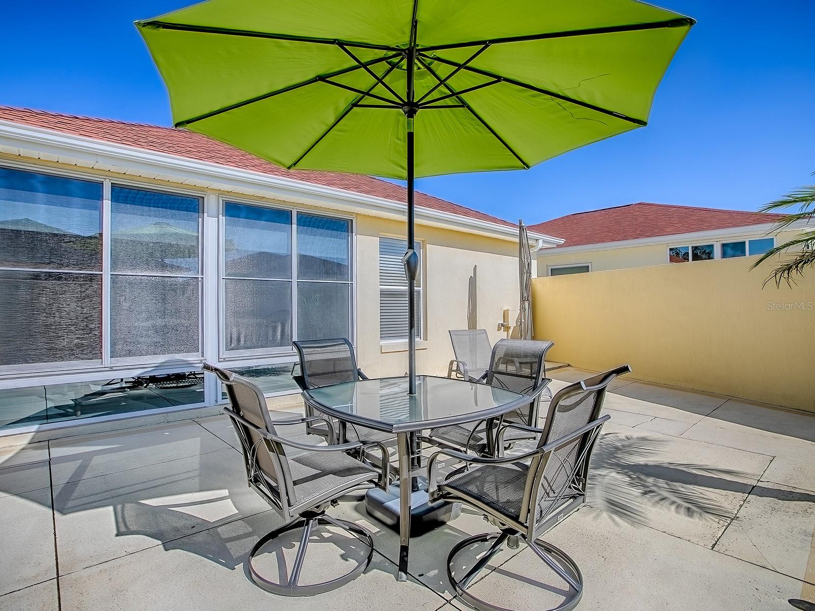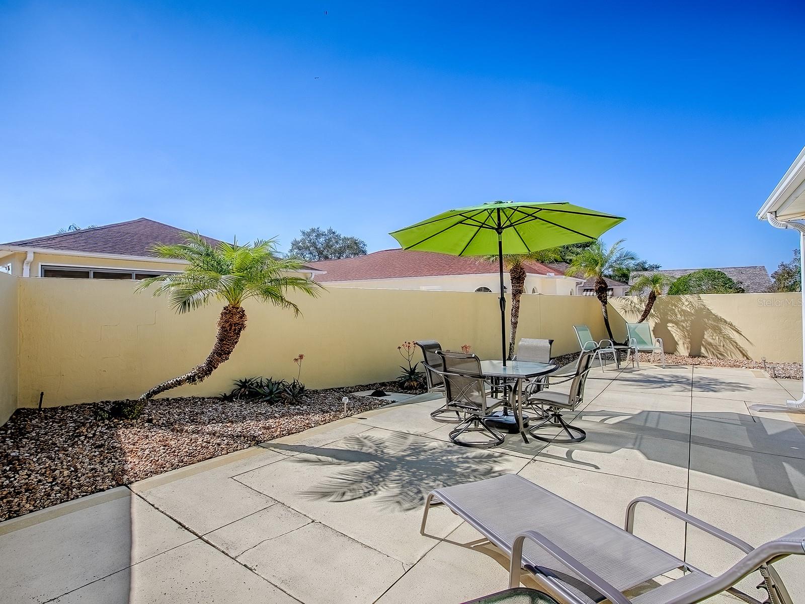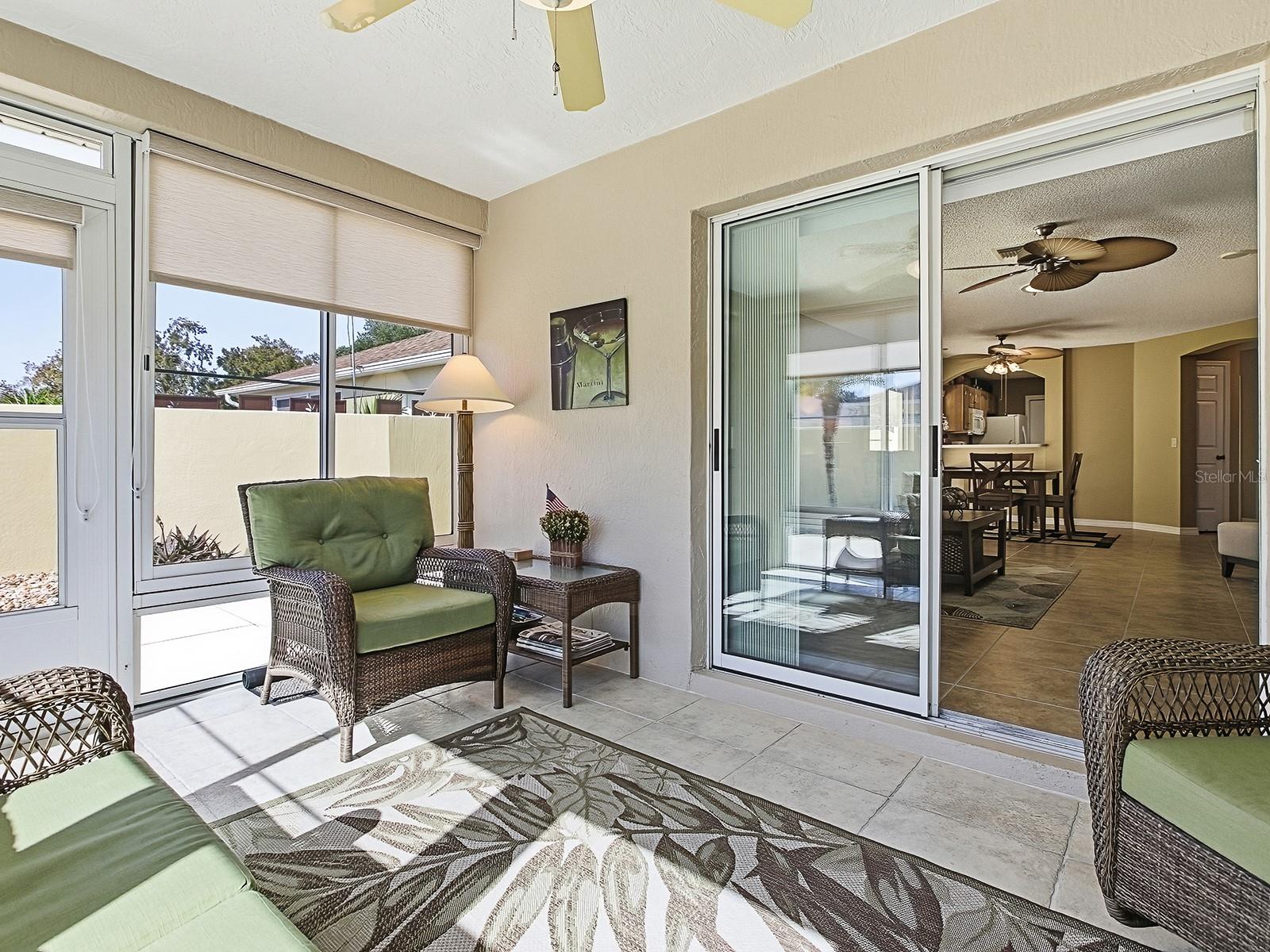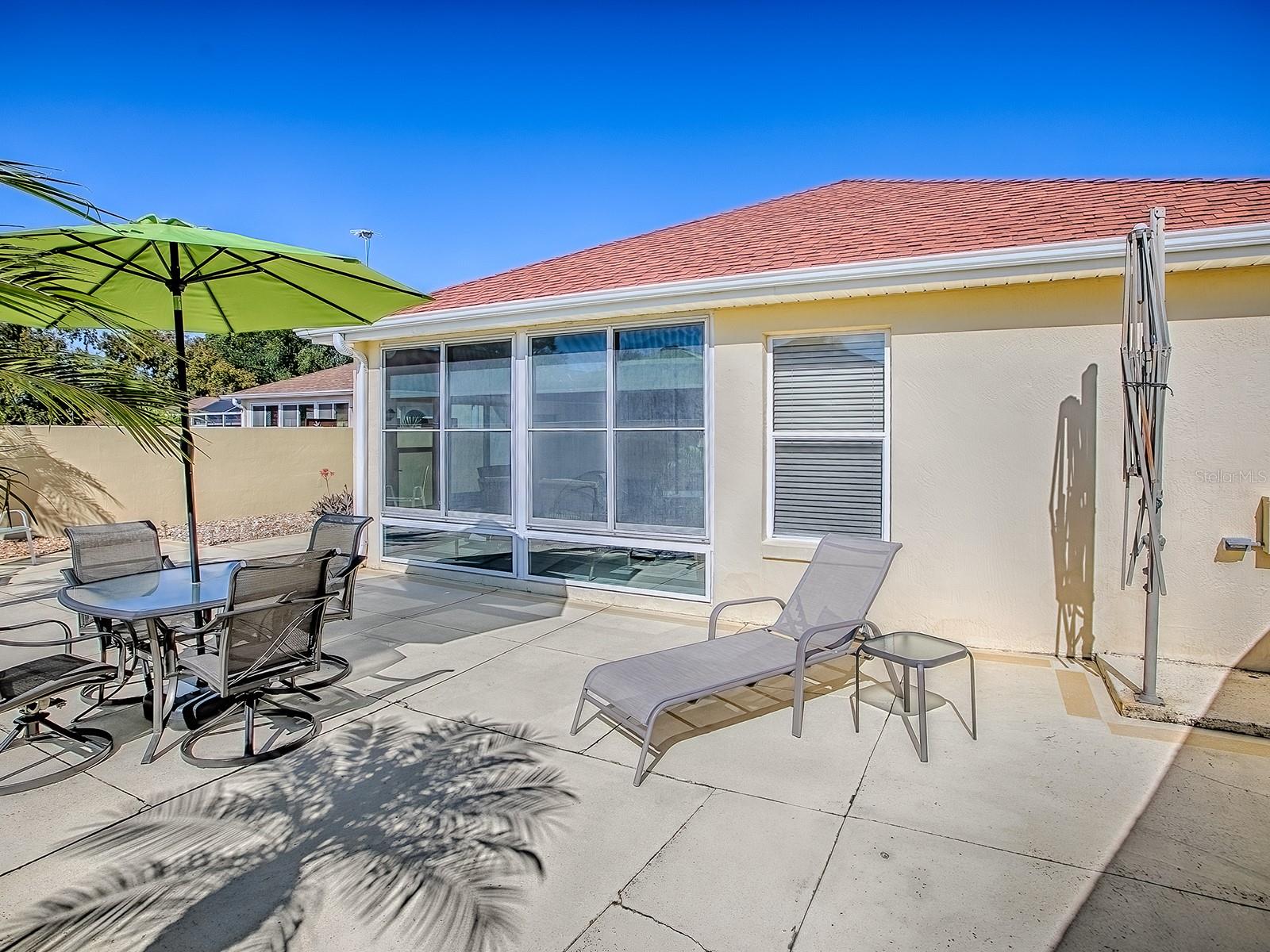 BOND PAID! This delightful 2/2 San Pedro Courtyard Villa is perfectly positioned in the Rio Grande Villas, offering comfort, charm, and an inviting low-maintenance lifestyle. Attractive rock-and-shrub landscaping leads to a welcoming glass storm door with side lite. Inside, the kitchen impresses with a SOLAR TUBE, like-new appliances, high-definition countertops, a closet pantry, and a convenient pass-through to the dining room. The INSIDE LAUNDRY is tucked neatly behind double doors within the kitchen. Porcelain tile flooring enhances the home’s open layout, creating a bright, airy setting ideal for everyday living or entertaining. The dining room also features a SOLAR TUBE, where NEW PELLA SLIDING GLASS DOORS with built-in blinds open to the side patio with a retractable awning, perfect for outdoor relaxation. The OPEN FLOORPLAN flows seamlessly from the kitchen into the living room lead to the FULLY ENCLOSED LANAI. This wonderful extension of living space includes new roll-down shades for privacy and temperature control. The primary bedroom is a peaceful retreat with direct lanai access and a custom WALK-IN CLOSET. Its en-suite bath offers a SOLAR TUBE, walk-in shower linen closet, and high-definition countertops. The guest bedroom, also enhanced by a SOLAR TUBE, is perfect for visitors or use as an office, with the guest bath featuring a convenient tub/shower combo. The garage adds practicality with a screen, SOLAR TUBE, and extra storage. Additional updates include added insulation, a hot-tub hookup in the courtyard, and a hot-water circulation pump. NEW ROOF COMING DECEMBER 2025! Ideally located just minutes from Spanish Springs Square and Lake Sumter Landing, and close to Santiago Recreation Center, Tierra Del Sol Country Club, five executive golf courses, Savannah Center. Shopping, dining, and medical facilities are also nearby. Don’t miss the chance to make this charming villa your private sanctuary in The Villages!