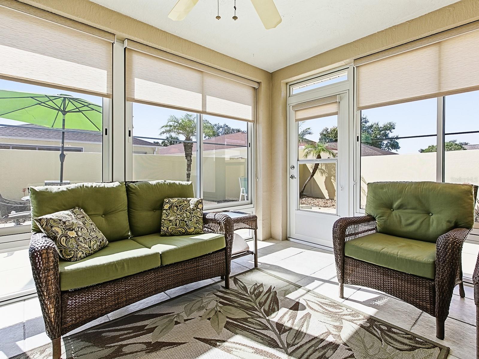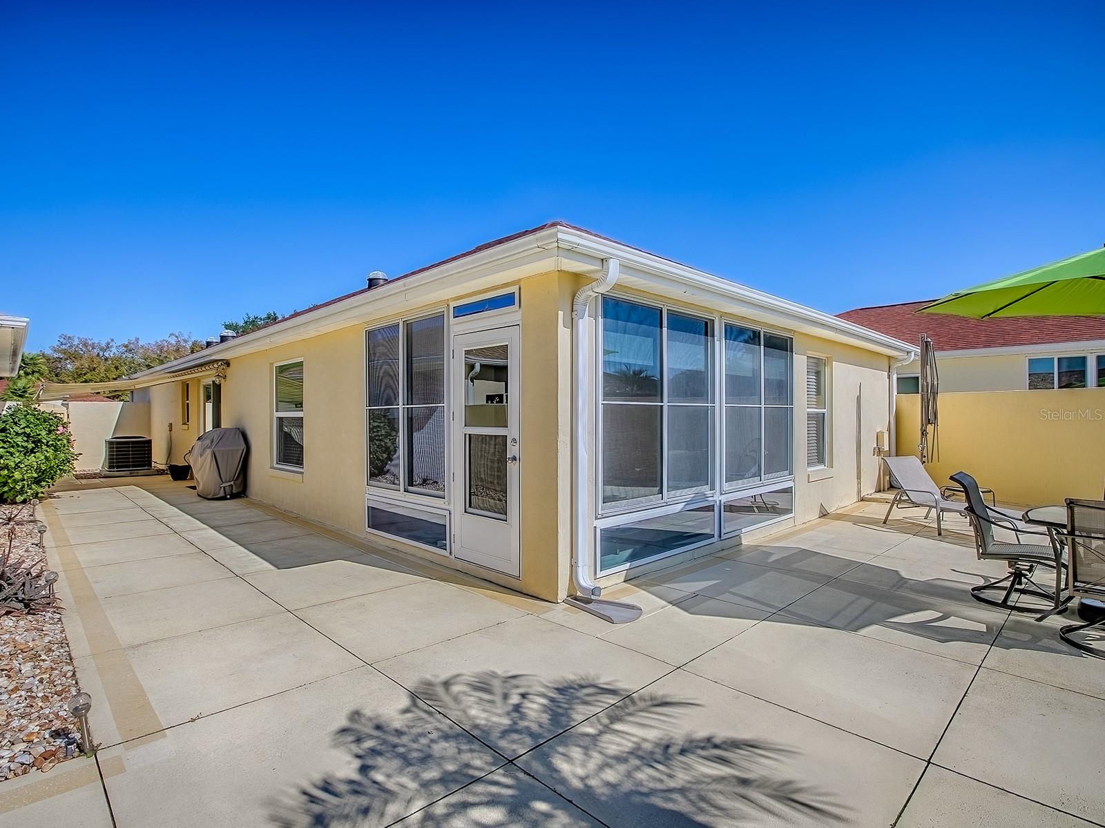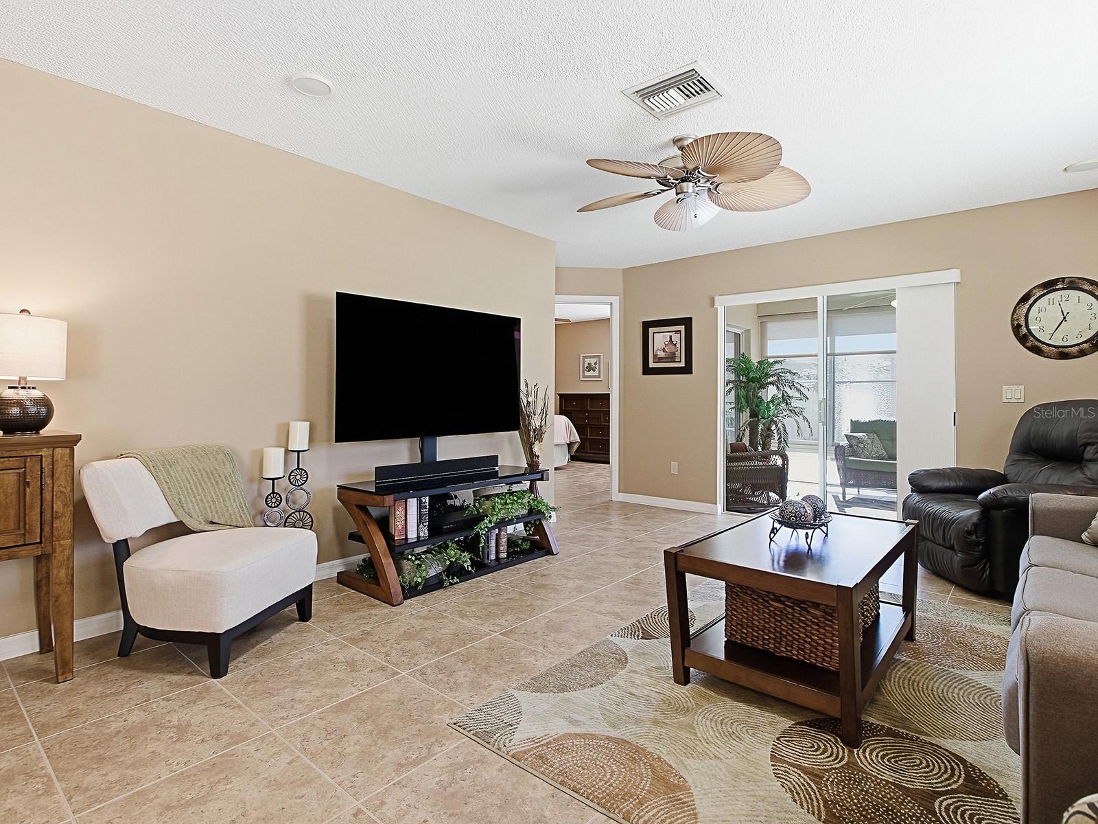 BOND PAID! This delightful 2/2 San Pedro Courtyard Villa is perfectly positioned in the Rio Grande Villas, offering comfort, charm, and an inviting low-maintenance lifestyle. Attractive rock-and-shrub landscaping leads to a welcoming glass storm door with side lite. Inside, the kitchen impresses with a SOLAR TUBE, like-new appliances, high-definition countertops, a closet pantry, and a convenient pass-through to the dining room. The INSIDE LAUNDRY is tucked neatly behind double doors within the kitchen. Porcelain tile flooring enhances the home’s open layout, creating a bright, airy setting ideal for everyday living or entertaining. The dining room also features a SOLAR TUBE, where NEW PELLA SLIDING GLASS DOORS with built-in blinds open to the side patio with a retractable awning, perfect for outdoor relaxation. The OPEN FLOORPLAN flows seamlessly from the kitchen into the living room lead to the FULLY ENCLOSED LANAI. This wonderful extension of living space includes new roll-down shades for privacy and temperature control. The primary bedroom is a peaceful retreat with direct lanai access and a custom WALK-IN CLOSET. Its en-suite bath offers a SOLAR TUBE, walk-in shower linen closet, and high-definition countertops. The guest bedroom, also enhanced by a SOLAR TUBE, is perfect for visitors or use as an office, with the guest bath featuring a convenient tub/shower combo. The garage adds practicality with a screen, SOLAR TUBE, and extra storage. Additional updates include added insulation, a hot-tub hookup in the courtyard, and a hot-water circulation pump. NEW ROOF COMING DECEMBER 2025! Ideally located just minutes from Spanish Springs Square and Lake Sumter Landing, and close to Santiago Recreation Center, Tierra Del Sol Country Club, five executive golf courses, Savannah Center. Shopping, dining, and medical facilities are also nearby. Don’t miss the chance to make this charming villa your private sanctuary in The Villages!