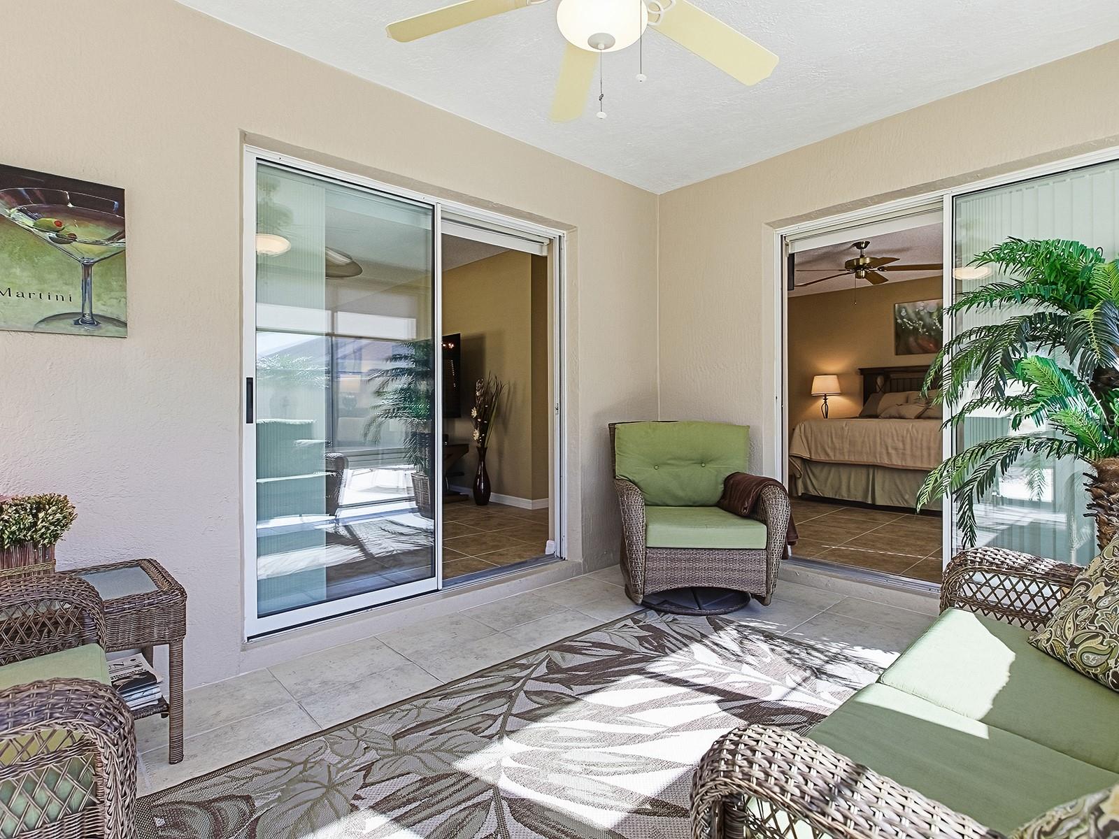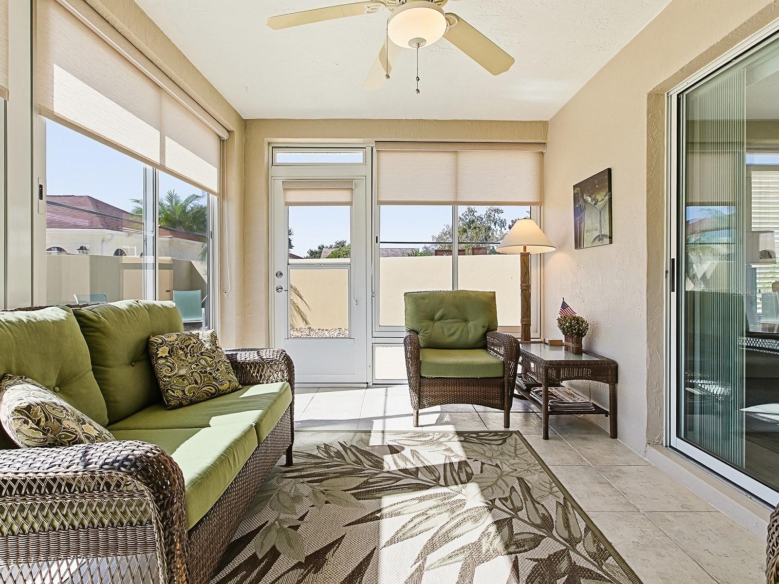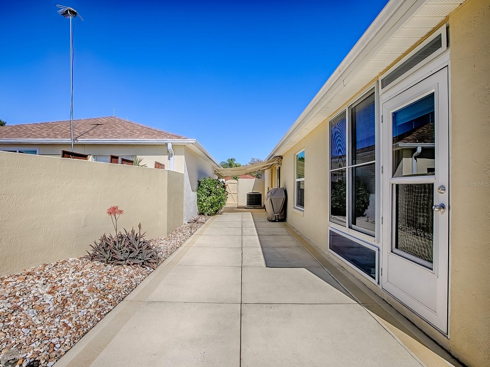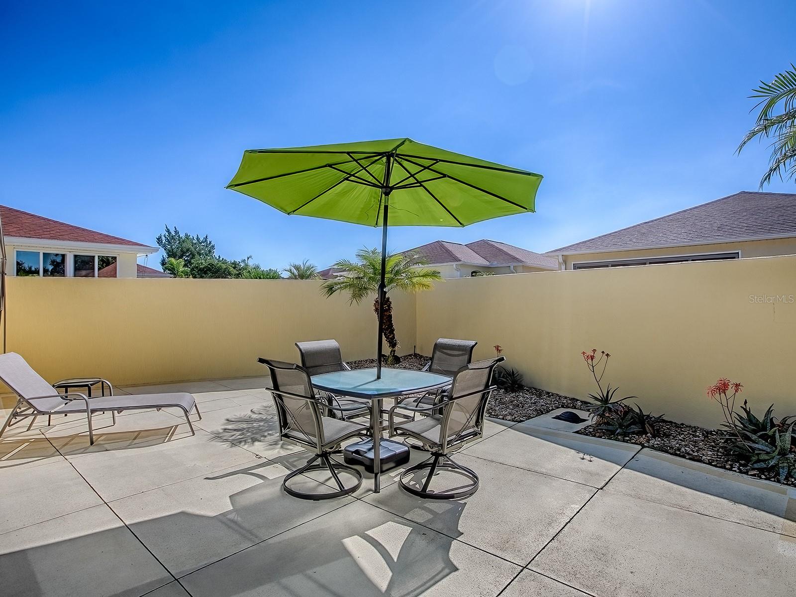 BOND PAID! This delightful 2/2 San Pedro Courtyard Villa is perfectly positioned in the Rio Grande Villas, offering comfort, charm, and an inviting low-maintenance lifestyle. Attractive rock-and-shrub landscaping leads to a welcoming glass storm door with side lite. Inside, the kitchen impresses with a SOLAR TUBE, like-new appliances, high-definition countertops, a closet pantry, and a convenient pass-through to the dining room. The INSIDE LAUNDRY is tucked neatly behind double doors within the kitchen. Porcelain tile flooring enhances the home’s open layout, creating a bright, airy setting ideal for everyday living or entertaining. The dining room also features a SOLAR TUBE, where NEW PELLA SLIDING GLASS DOORS with built-in blinds open to the side patio with a retractable awning, perfect for outdoor relaxation. The OPEN FLOORPLAN flows seamlessly from the kitchen into the living room lead to the FULLY ENCLOSED LANAI. This wonderful extension of living space includes new roll-down shades for privacy and temperature control. The primary bedroom is a peaceful retreat with direct lanai access and a custom WALK-IN CLOSET. Its en-suite bath offers a SOLAR TUBE, walk-in shower linen closet, and high-definition countertops. The guest bedroom, also enhanced by a SOLAR TUBE, is perfect for visitors or use as an office, with the guest bath featuring a convenient tub/shower combo. The garage adds practicality with a screen, SOLAR TUBE, and extra storage. Additional updates include added insulation, a hot-tub hookup in the courtyard, and a hot-water circulation pump. NEW ROOF COMING DECEMBER 2025! Ideally located just minutes from Spanish Springs Square and Lake Sumter Landing, and close to Santiago Recreation Center, Tierra Del Sol Country Club, five executive golf courses, Savannah Center. Shopping, dining, and medical facilities are also nearby. Don’t miss the chance to make this charming villa your private sanctuary in The Villages!