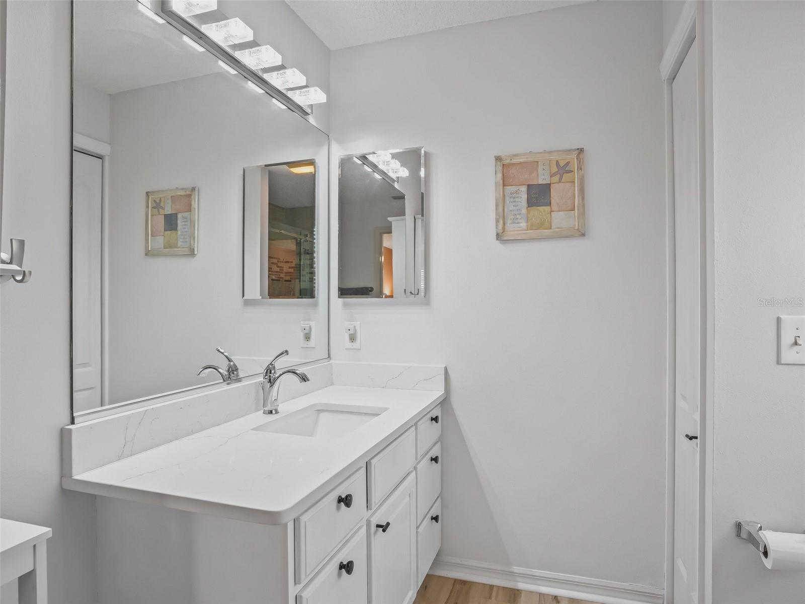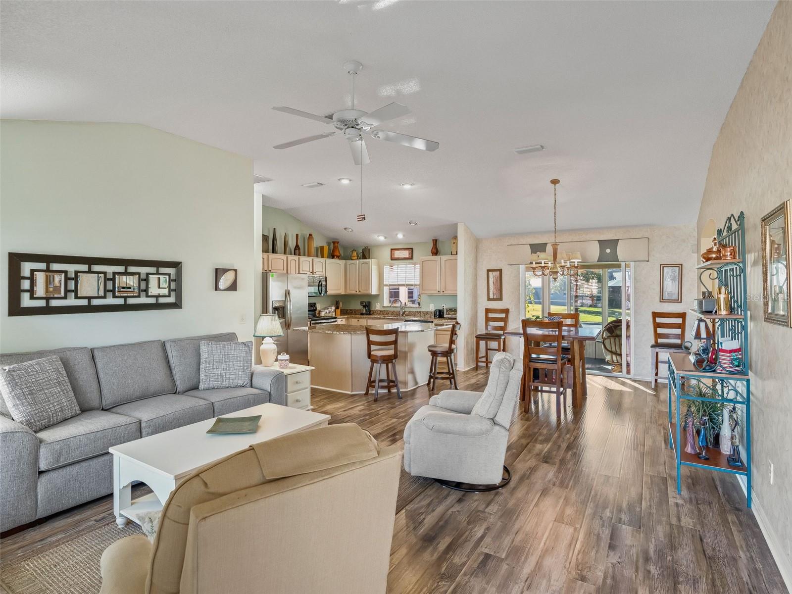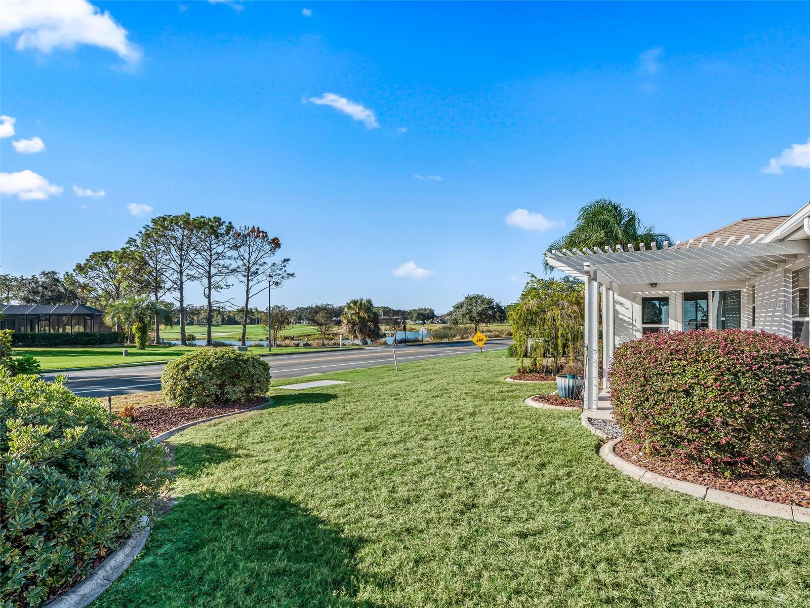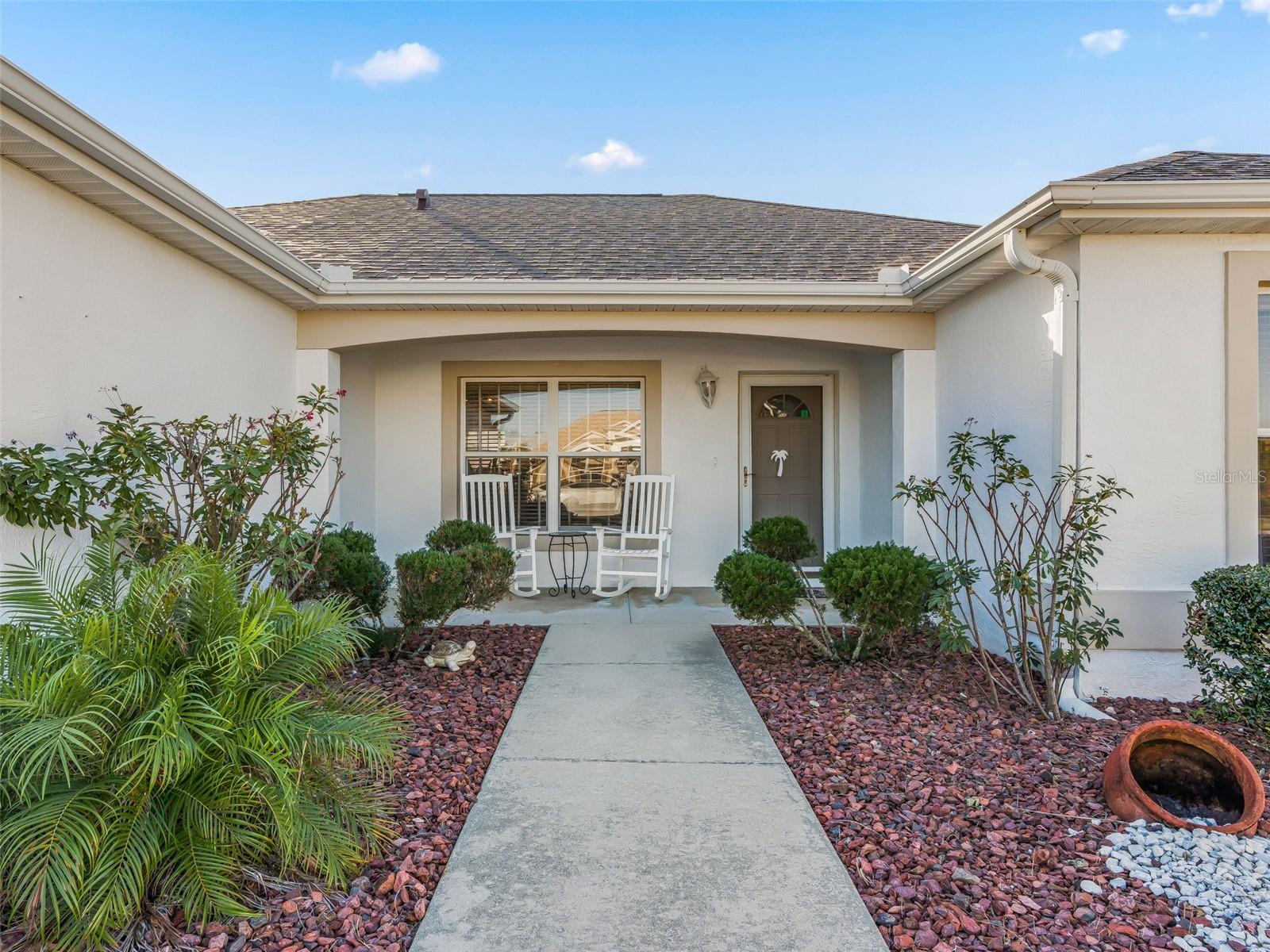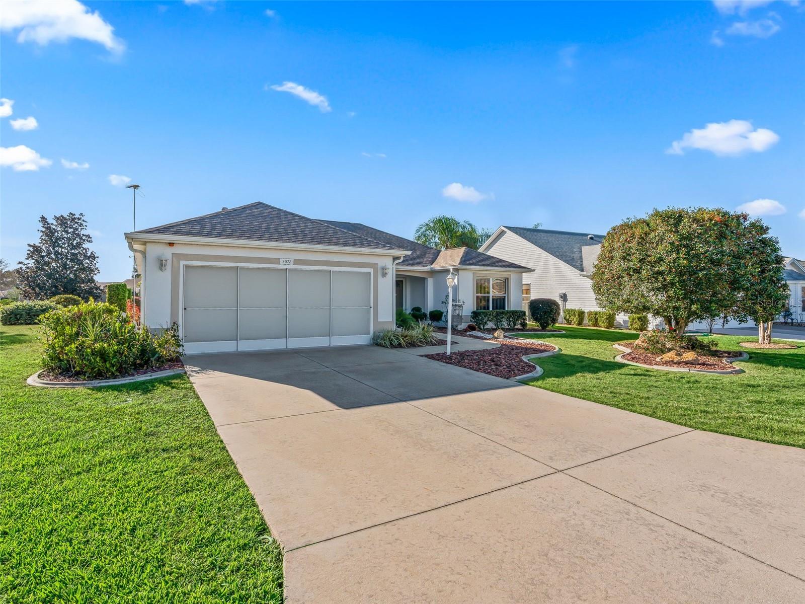 Stunning Custom 2/2 + Den Concrete Block and Stucco Sun Kissed model with a 2 Car Garage, Golf Course, and Pond View in the sought after location of the Village on Glenbrook, conveniently situation minutes from Lake Sumter Landing, and Spanish Springs Town Square, where you can enjoy nightly Entertainment 365 days a year! BOND PAID! This Exceptional home offers a Charming 16 x 6 Covered Front Porch, an Open and Split Floor plan, Vaulted ceilings, Whole House Water Softener, a Den with Archway entrance off the Dining area, and a Glass Enclosed Lanai. Upon entering this lovely home, you are greeted by the Living and Dining area combination featuring Vaulted ceilings, and Gorgeous Newer Luxury Vinyl Plank flooring! The Open Concept Floor Plan creates a Spacious Gathering area, Perfect for Entertaining Family and Friends! The Dining area flows seamlessly through sliding doors to the Glass Enclosed Lanai adding a Fantastic Additional Living Space flooded with Natural Light, and accesses the nice size Pergola Covered Back Patio, Enhancing the Outdoor Living Experience! The Open Kitchen showcases Granite countertops, Cabinets with Pullouts, Stainless appliances, New Dishwasher 2025, Refrigerator & Stove 2021, Pantry closet, and a Generous Breakfast Bar! The Split Floor plan offers Maximum Privacy for both the Owners and their Guest, with the Primary Suite commanding one side of the home, while the guest bedroom, Den, and bathroom are located on the opposite side of the home. The Luxurious Primary suite offers a Large Walk in Closet, and an En Suite bathroom. The En Suite bathroom features a New Marble Vanity, and a New Walk in Shower. The 22 x 20 Two Car Garage provides plenty of room for storage! Roof 2018 by Sacks Roofing, HVAC 2018 by Munns, This Charming Sun Kissed model is conveniently located near the Savannah Sports Pool and Regional Recreation Center, Hilltop Executive Golf Course, Glenview Country Club, El Santiago Executive Golf Course, and various recreational facilities, including Adult and Family Pools. In addition, you'll find plenty of Shopping Centers, Banking, Restaurants, The Villages Hospital, and the VA Center all just minutes away!