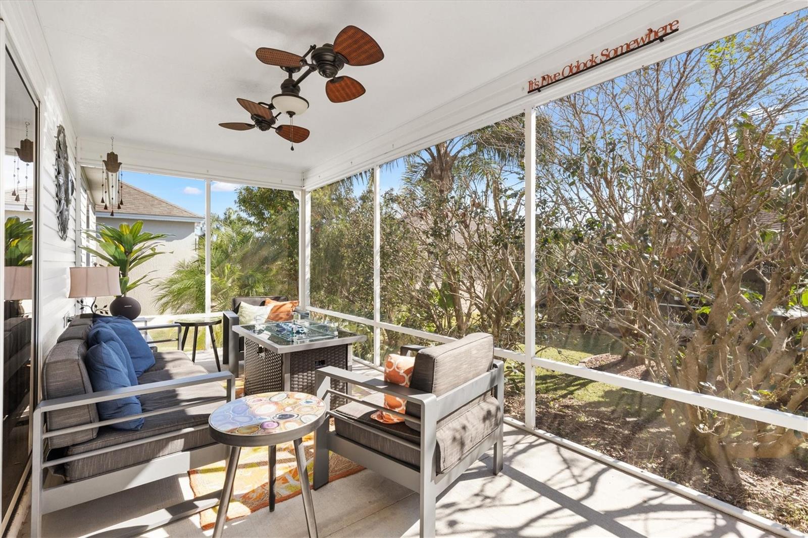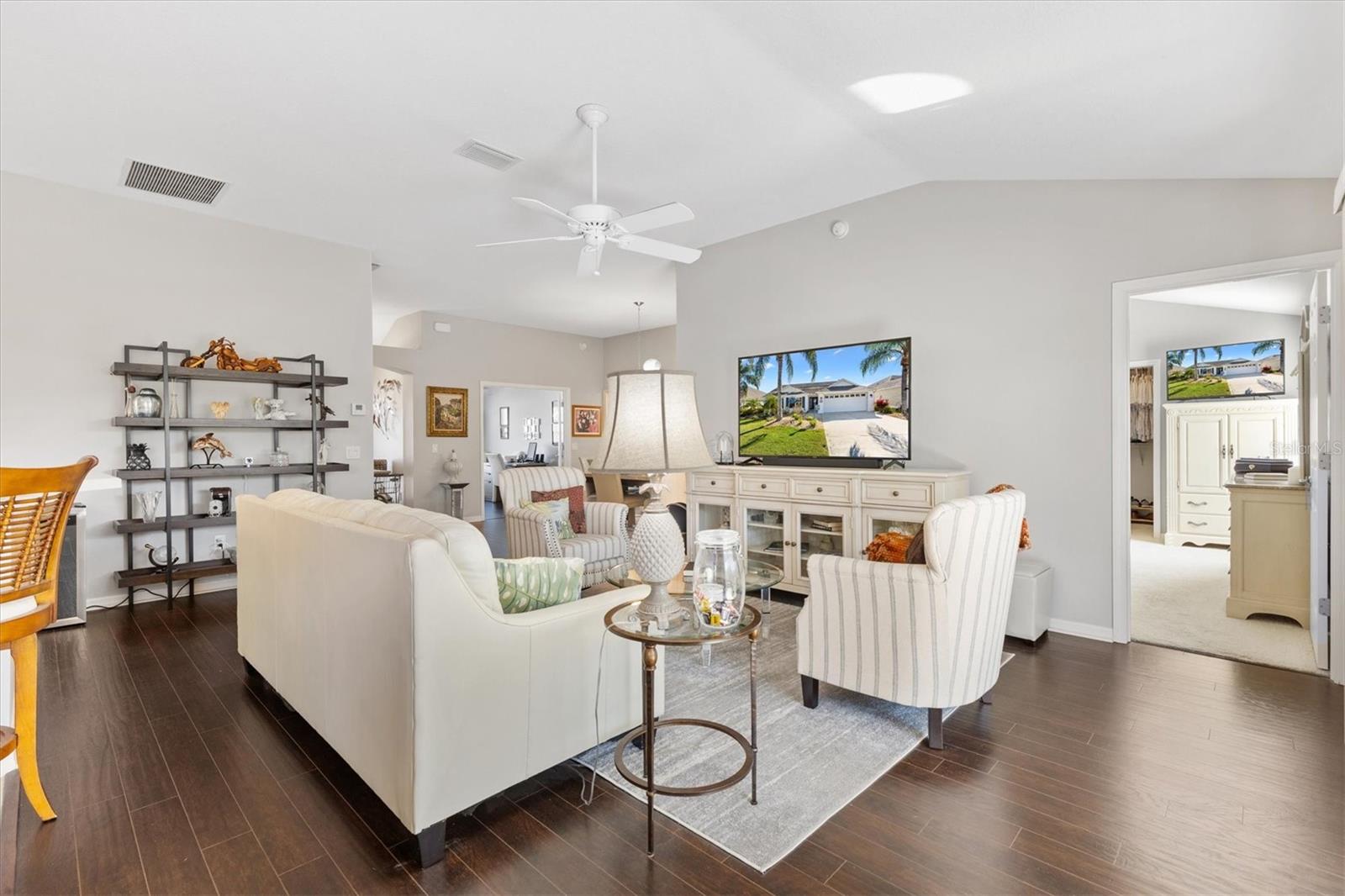 GREAT LOCATION between Lake Sumter Landing and Brownwood Town Squares. Stunning 3/2 Whispering Pines Designer home. You'll appreciate the seamless flow of the open floor plan, highlighted by wood-look luxury vinyl plank flooring that adds warmth and character. Ceiling fans throughout keep the home comfortable in every season. At the heart of the home, the spacious kitchen is both functional and inviting. It features stainless steel appliances, Pull-out shelves, a pantry closet, a generous breakfast bar with elegant pendant lighting. The sunlit dinette is perfect for casual meals with views of the backyard. The home boasts beautiful custom built-in cabinets in the eat in kitchen. The master suite is a peaceful sanctuary, offering an ensuite bath with dual vanities and a walk-in shower with a built-in bench, and a large walk-in closet. A guest bedroom is adjacent to a full bath with tub shower combo with a pocket door to allow visitors privacy and comfort. The third bedroom, without a closet, is ideal for a home office, craft room, reading room, or den. Step outside to experience true Florida living. The screened-in lanai is perfect for creating a cozy and inviting setting for morning coffee or evening entertaining. Just beyond, an outdoor patio provides the perfect space for grilling. Low-maintenance updated landscaping enhance the home’s curb appeal and add charm to the exterior. The interior laundry room offers plenty of storage and a mud sink, along with new washer and dryer for modern convenience. Additional features include an attic stair kit, and a spacious two-car garage with an electronic roll-down screen. Furniture Package available separately, Some décor available separately. Be sure to watch our virtual tour of this wonderful home and schedule your appointment to see it today so you can start living The Villages dream.