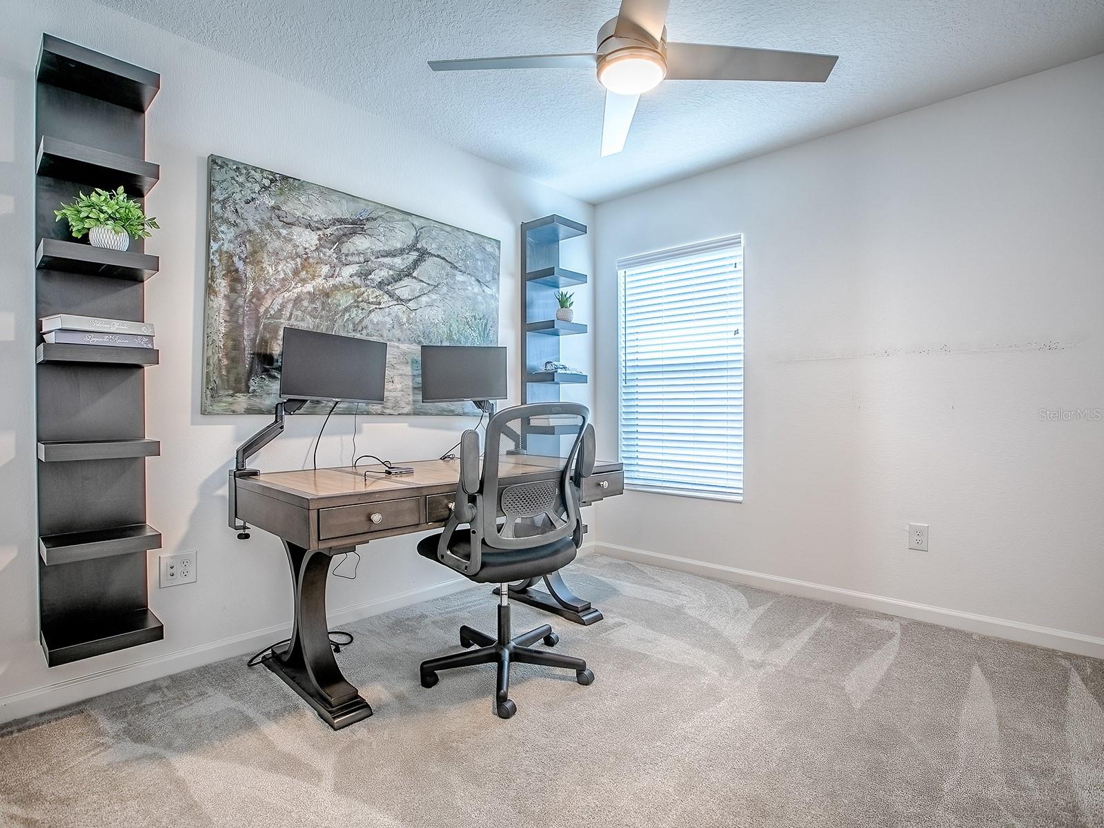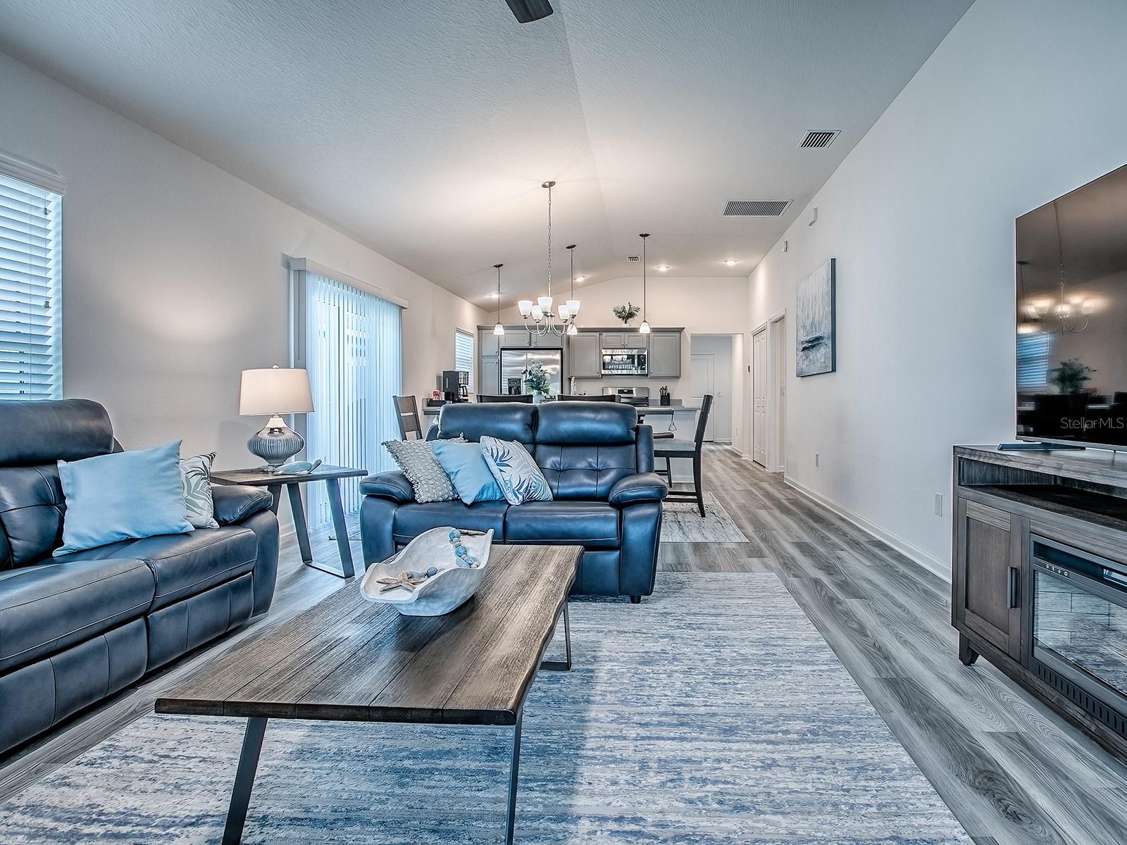 Are you ready to start living the Village Lifestyle in your own beautiful, turn-key Charlotte model with a private backyard for relaxation. This home boasts room for a swim spa, pool) or an expanded screen enclosed gathering area for expanded outdoor living. You have adjacent recreation centers, multiple town squares, and numerous breathtaking nature trails and outdoor exercise opportunities. Your location in paradise allows you to hop on your bicycle or golf cart as you meander through endless paths, swim at pools at nearby recreation centers, and grab a bite to eat or listen to music at Eastport, Sawgrass Grove and the restaurant filled Middleton squares. As you pull into your new home, you'll find charming landscaping leading to your front porch furnished with chairs and table for relaxing coffee or cocktail moments with neighbors. Once you walk in, you'll find a beautifully furnished 3 bedroom, 2-bathroom, split floor plan, complete with luxury vinyl flooring in all active areas and carpeting in the bedrooms. The kitchen boasts quartz countertops, designer grey cabinets and stainless-steel appliances and a dining table for 6 or eat at the bar. In the back overlooking your private, spacious backyard is your beautifully decorated primary bedroom, with a king-sized bed, dresser, dual nightstands, and a large walk-in closet. The primary bathroom has an open walk-in shower and dual sinks and private toilet area. There is a large laundry room with washer and dryer included. Unwind on your back lanai as you enjoy the gorgeous Florida weather. The fenced-in backyard provides privacy or ample space for games and room for fur babies to frolic and a side patio to BBQ located just off the kitchen through a large sliding glass door with sturdy, cleanable verticals. The garage boasts plenty of storage for all of your needs. Schedule your private showing now!