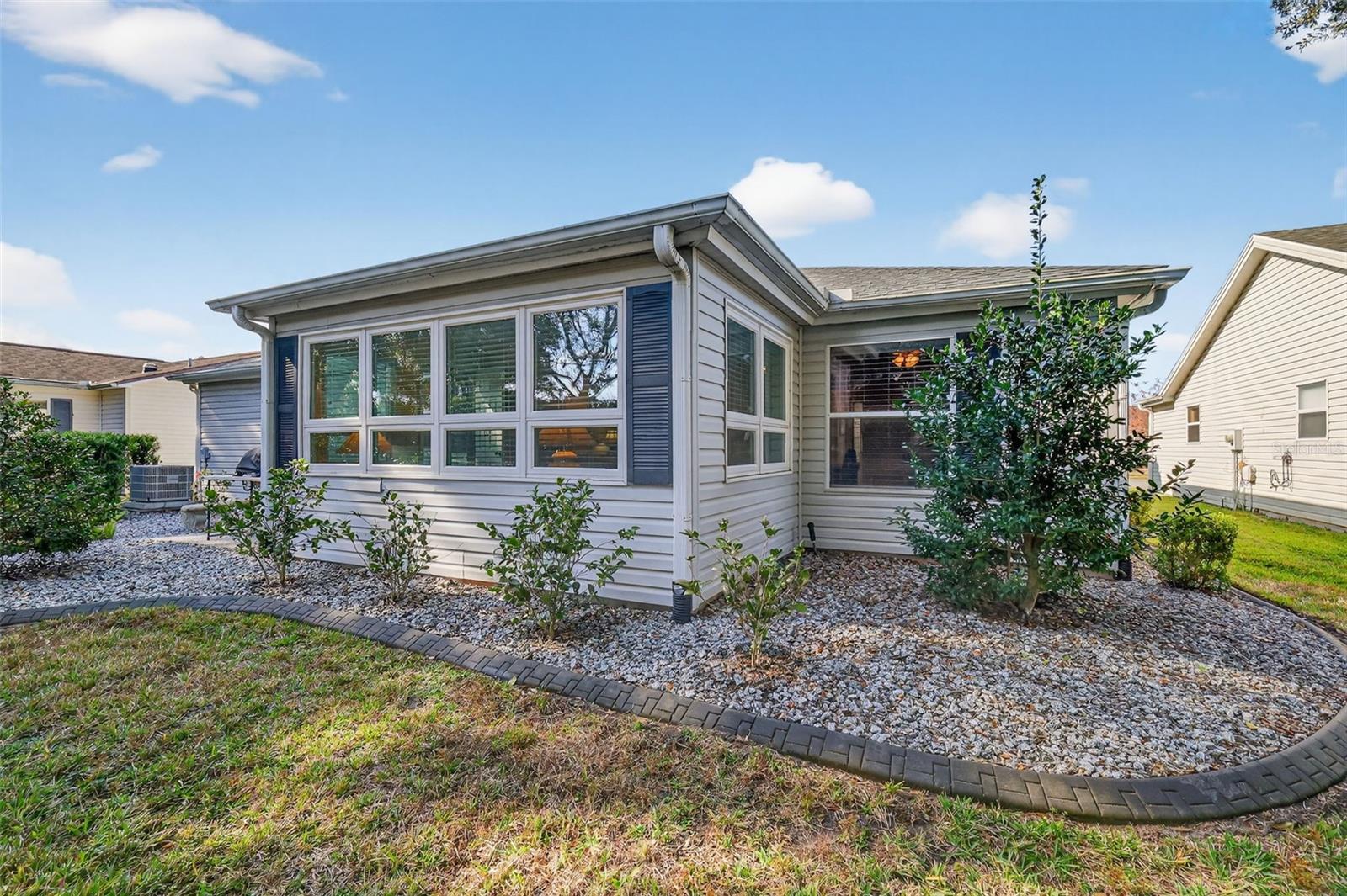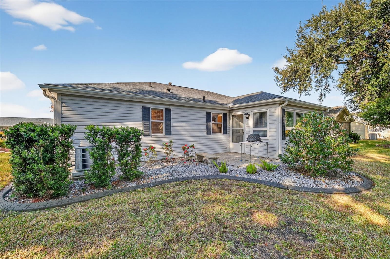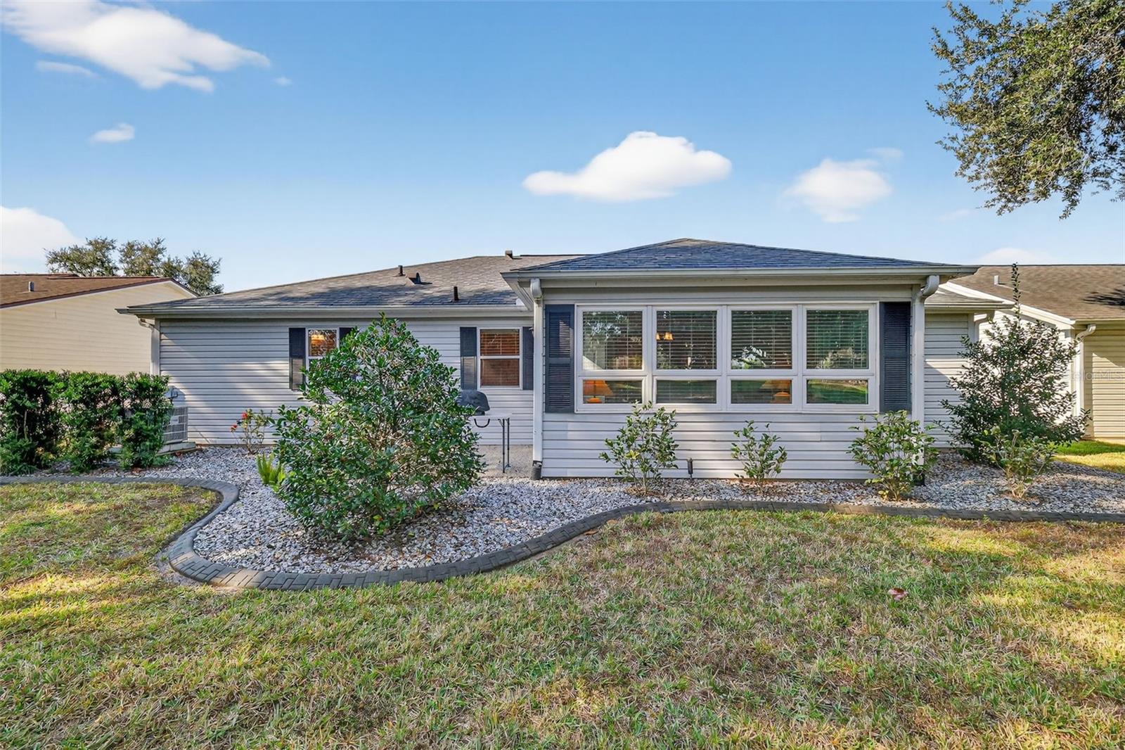 FABULOUS 3/2 Bougainvillea Designer featuring a SPACIOUS FLORIDA ROOM and REAR CHATTAHOOCHEE PAVER PATIO with professional and MATURE PRIVACY LANDSCAPING - CONVENIENTLY LOCATED near BOTH Spanish Springs Town Square and Lake Sumter Landing in the highly sought after Village of Rio Ranchero! BOND PAID! ROOF (2017), HVAC (2025) A quaint SCREENED FRONT PORCH with Chattahoochee flooring welcomes you in to this wonderful home! Step inside to discover VAULTED ceilings and the SPACIOUS, OPEN CONCEPT FLOOR PLAN of the living, dining and kitchen areas. The GORGEOUS, UPDATED kitchen showcases WHITE SHAKER cabinetry, MODERN CARRARA look counter tops, a generously sized CENTER ISLAND with DOUBLE sided cabinetry and a BUILT-IN PANTRY for ABUNDANT STORAGE. Directly behind the dining room, you will discover an AMAZING under-air Florida room with a plethora of windows that allows for an ABUNDANCE of NATURAL LIGHT. This VERSATILE, MULTI-PURPOSE ROOM offers the ideal space for a den, media room, or home office. There’s also an exterior door to the adjacent patio featuring Chattahoochee flooring for grilling or simply enjoying the beautiful Florida weather! Back inside, the primary bedroom boasts a GENEROUS WALK-IN closet and large window. It’s NEWLY REMODELED, EN-SUITE bathroom boasts LIGHT WOOD PLANK TILE flooring, WHITE SHAKER cabinetry with QUARTZ countertop and DUAL sinks, SPACIOUS, CARRARA TILED WALK-IN shower, and a LINEN closet. Designed for privacy, the SPLIT FLOOR PLAN creates a SEPARATE GUEST WING with two additional bedrooms and a second bathroom across the home. Bedroom two features DOUBLE windows and a BUILT-IN closet. The NEWLY REMODELED second bathroom is thoughtfully appointed with a WHITE SHAKER vanity, LIGHT WOOD PLANK TILE flooring, MARBLE countertop, and a tub and shower combination with CARRARA TILE. The third bedroom features a built-in closet and a large window. Additionally, a BONUS linen-closet in the hallway. A centrally located INTERIOR LAUNDRY ROOM with a UTILITY SINK and light WOOD cabinetry leads you to the two-car garage offering a SLIDING SCREEN PANEL and plenty of room for parking and storage! Another bonus - UPGRADED rain gutters that FLOW UNDERGROUND! DON’T MISS YOUR OPPORTUNITY to make this INCREDIBLE HOME YOUR OWN! The Village of Rio Ranchero is IDEALLY LOCATED near three large Regional Recreation Centers: Laurel Manor, Savannah Center, and La Hacienda; several Country Clubs and Championship Golf Courses: Tierra Del Sol, Hacienda Hills, Orange Blossom Hills; and multiple pools, golf, and pickle ball! ONLY MINUTES to County Road 466 with with an abundance of shopping, restaurants, banks, medical and more! PLEASE WATCH OUR WALKTHROUGH VIDEO of this FANTASTIC HOME in an AMAZING LOCATION and CALL TODAY to schedule your Private Showing or Virtual Tour! **Some furniture, decor, and Other Items Available Separately**