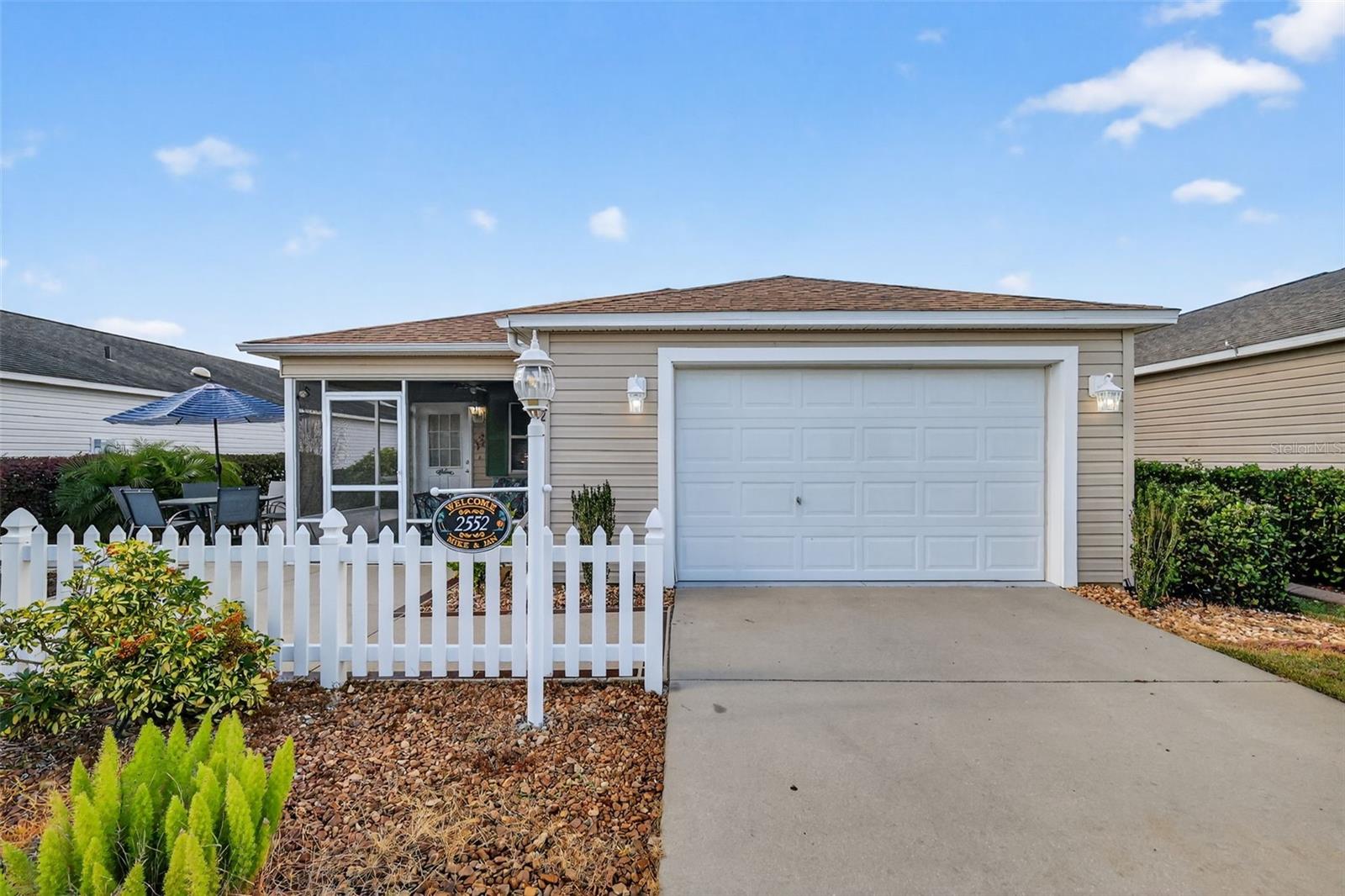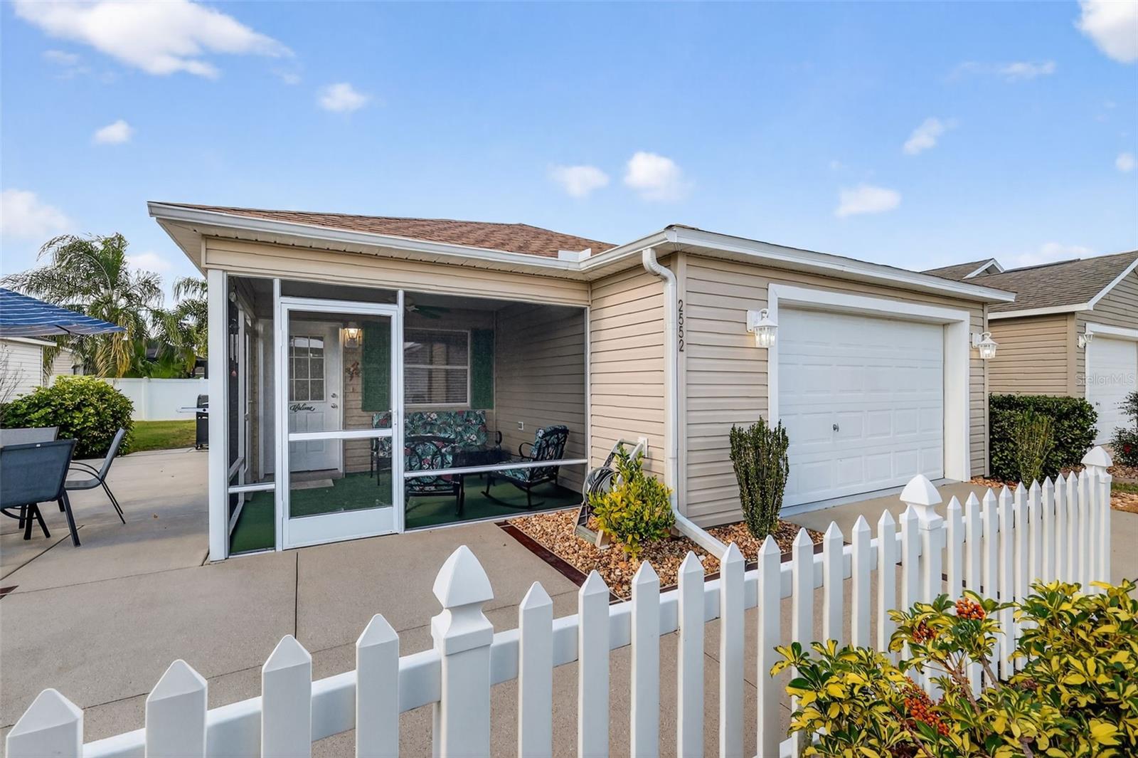 Enjoy the ease of Florida living in this FANTASTIC 2/2 Colony Patio Villa featuring SPACIOUS FRONT and SIDE PATIOS and an INTERIOR LAUNDRY - IDEALLY LOCATED - between County Roads 466 and 466A and JUST MINUTES to LAKE SUMTER LANDING with shopping, dining, and live nightly entertainment! BOND PAID! As you approach this WONDERFUL home, you can’t help but notice the CHARMING white picket fence, LOW-MAINTENANCE STONED landscaping beds, DECORATIVELY PAINTED drive and walkways, and SPACIOUS FRONT and SIDE PATIOS — Ideal for RELAXING in the Florida sunshine or ENJOYING fun-filled OUTDOOR ENTERTAINING with friends and family! From the patio, step into the SCREENED LANAI featuring a ceiling fan and PAINTED floor creating the PERFECT spot to RELAX with your morning coffee, evening cocktail, or a good book! Enter through the front French door into the OPEN CONCEPT layout of the living, dining, and kitchen. Throughout the home you will find RICH, WOOD-GRAIN LUXURY VINYL PLANK - NO CARPET! The SPACIOUS main living area offers two LARGE windows and a set of sliding glass doors for ABUNDANT NATURAL LIGHT. The kitchen is a chef’s delight showcasing WHITE cabinetry with PULL-OUTS, NEUTRAL countertops, PANTRY closet, and an EAT-IN breakfast bar. The primary suite features a GENEROUS WALK-IN closet and a well-appointed en-suite bathroom with WHITE cabinetry, NEUTRAL countertop, and a WALK-IN shower. Bedroom two offers a built-in closet, while the second bathroom features a WHITE vanity with NEUTRAL top, tub and shower combination, and a hallway LINEN closet. A CONVENIENT, INTERIOR LAUNDRY closet offers additional shelving for EXTRA STORAGE needs. Completing the package is an 18’x22’ one and a half car garage with a UTILITY SINK and PLENTY of space for a car and golf cart! DON’T MISS YOUR OPPORTUNITY TO MAKE THIS WONDERFUL HOME YOUR OWN! The Village of Hemingway is nestled in the heart of the Villages between Lake Sumter Landing and Brownwood Paddock Squares; Havana and Bonita Golf and Country Clubs; Sarasota Golf Academy Practice Center; Truman, Seabreeze, and Colony Cottage Recreation Centers; Hemingway Pool along with multiple pools and pickle ball courts; and CR466A and CR466 with an abundance of shopping, restaurants, banks, medical, and more! PLEASE WATCH OUR WALKTHROUGH VIDEO of this INCREDIBLE HOME in a FANTASTIC LOCATION and call today to schedule your Private Showing or Virtual Tour!
