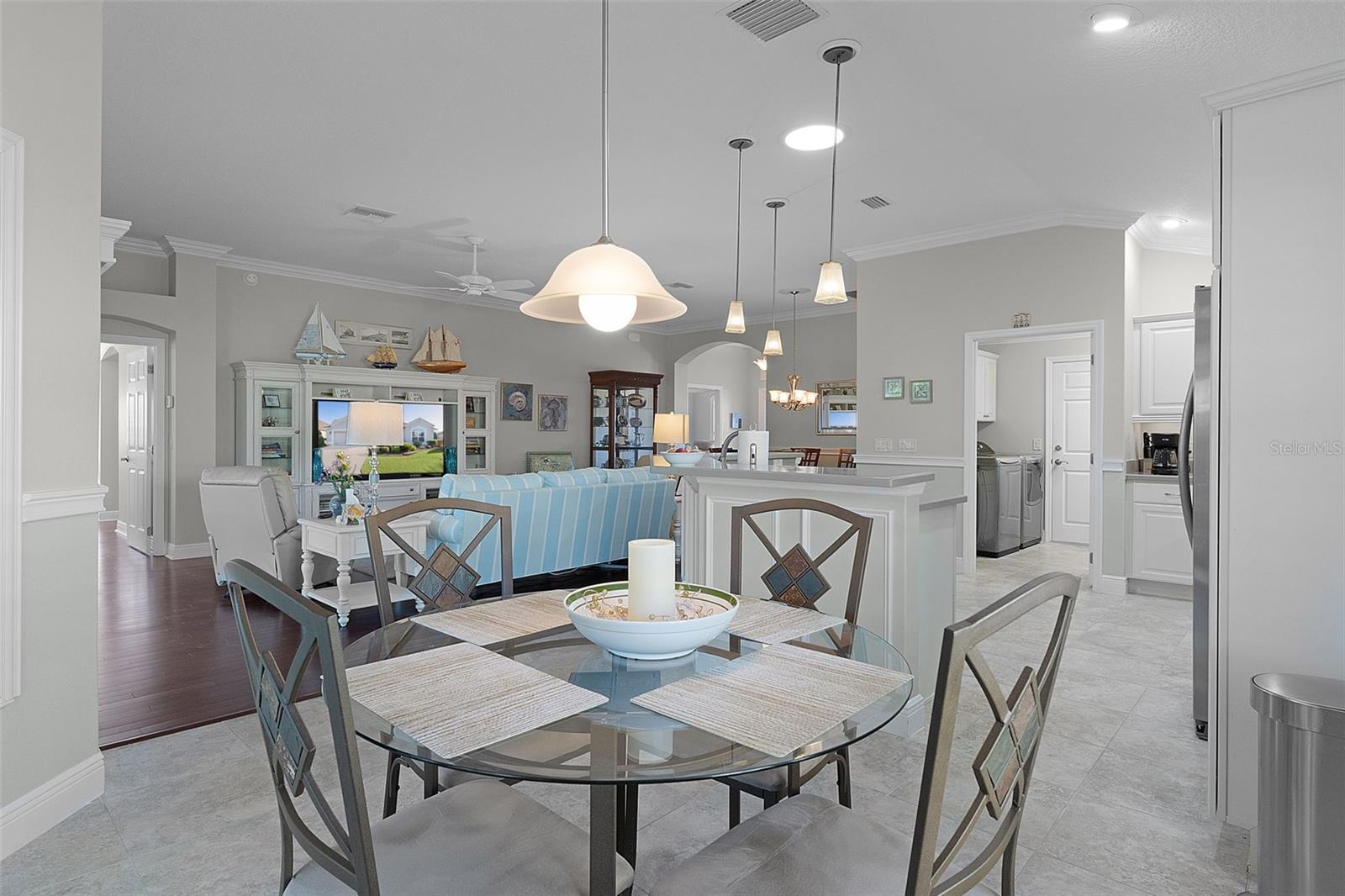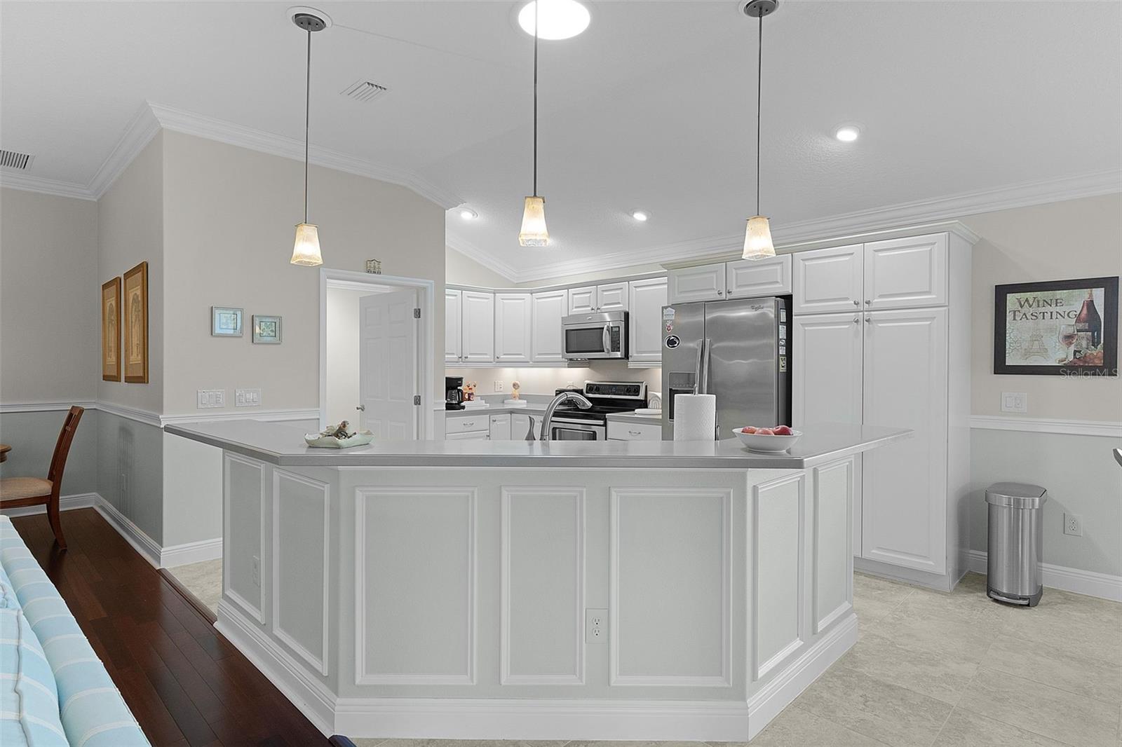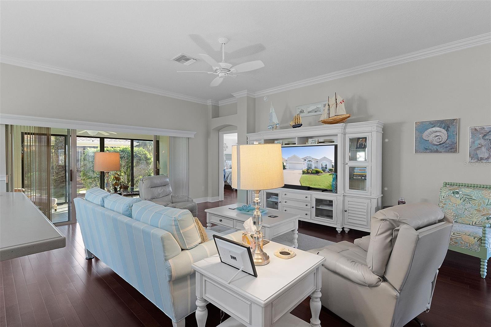 ~NEW ROOF COMING 2026~ ~CORNER LOT~ ~CROWN MOLDING THROUGHOUT~ ~FRESH EXTERIOR PAINT~ ~ TURNKEY & GOLF CART PACKAGE AVAILABLE SEPARATELY~ Welcome to this beautifully maintained EXPANDED LILY located in the sought-after Village of SANIBEL. Situated on a desirable CORNER LOT, this home brings both comfort and style throughout. Step through the full glass front door into a welcoming entry with CERAMIC tile and elegant CROWN MOLDING. The spacious living room showcases ENGINEERED HARDWOOD flooring, HIGH CEILINGS, and a ceiling fan, creating an open and airy feel. The kitchen is thoughtfully designed with CERAMIC tile flooring, CORIAN countertops, STAINLESS STEEL appliances, PLANTATION SHUTTERS, rollout lower cabinets, upgraded lighting, and a SOLAR TUBE for added natural light. An inviting eat-in area and breakfast bar with 3 pendant lights make this space ideal for both everyday living and entertaining. The dining room continues the upscale feel with ENGINEERED HARDWOOD, CROWN MOLDING, high ceilings, and a chair rail. The primary suite is a retreat featuring ENGINEERED HARDWOOD flooring, CROWN MOLDING, PLANTATION SHUTTERS, updated lighting, a ceiling fan, and high TRAY CEILINGS, along with an oversized walk-in closet. The en-suite bath offers CERAMIC tile, a TILED ROMAN SHOWER, DOUBLE sinks, separate commode, CORIAN countertops, comfort-height vanities, and a convenient makeup table. Guests will appreciate the well-appointed 2nd bedroom with ENGINEERED HARDWOOD flooring, CROWN MOLDING, PLANTATION SHUTTERS, vaulted ceilings, a ceiling fan, and a built-in closet. The guest bath includes CERAMIC tile, a tile shower/tub combination, CORIAN countertops, and comfort-height vanity. The 3rd bedroom features ENGINEERED HARDWOOD floors, CROWN MOLDING, PLANTATION SHUTTERS, a ceiling fan, a built-in closet, and a Murphy bed, offering flexible use as a guest room or office. The inside laundry room includes CERAMIC tile flooring, WHIRLPOOL appliances, a desk area, laundry tub, and ample cabinetry. Relax year-round in the GLASS-ENCLOSED LANAI with CERAMIC tile, 2 ceiling fans, and telescoping sliders, overlooking a mostly private backyard—perfect for enjoying Florida living. The 2-car garage features attic stairs, EPOXY FLOORING, and an ELECTRIC GARAGE DOOR SCREEN, and a NEW ROOF IS COMING, adding peace of mind for the next owner. The HVAC and Hot Water Heater are 2011. Additional highlights include a freshly painted exterior. This exceptional home blends functionality, style, and location—ready for you to move in and start enjoying The Villages lifestyle with proximity to shopping and dining along CR 466A. You will be a short golf cart ride away to Brownwood Paddock Square, Bonifay Country Club, Evans Prairie Country Club along with numerous Executive golf courses and recreation centers.