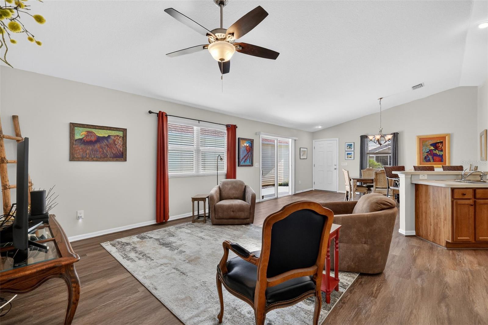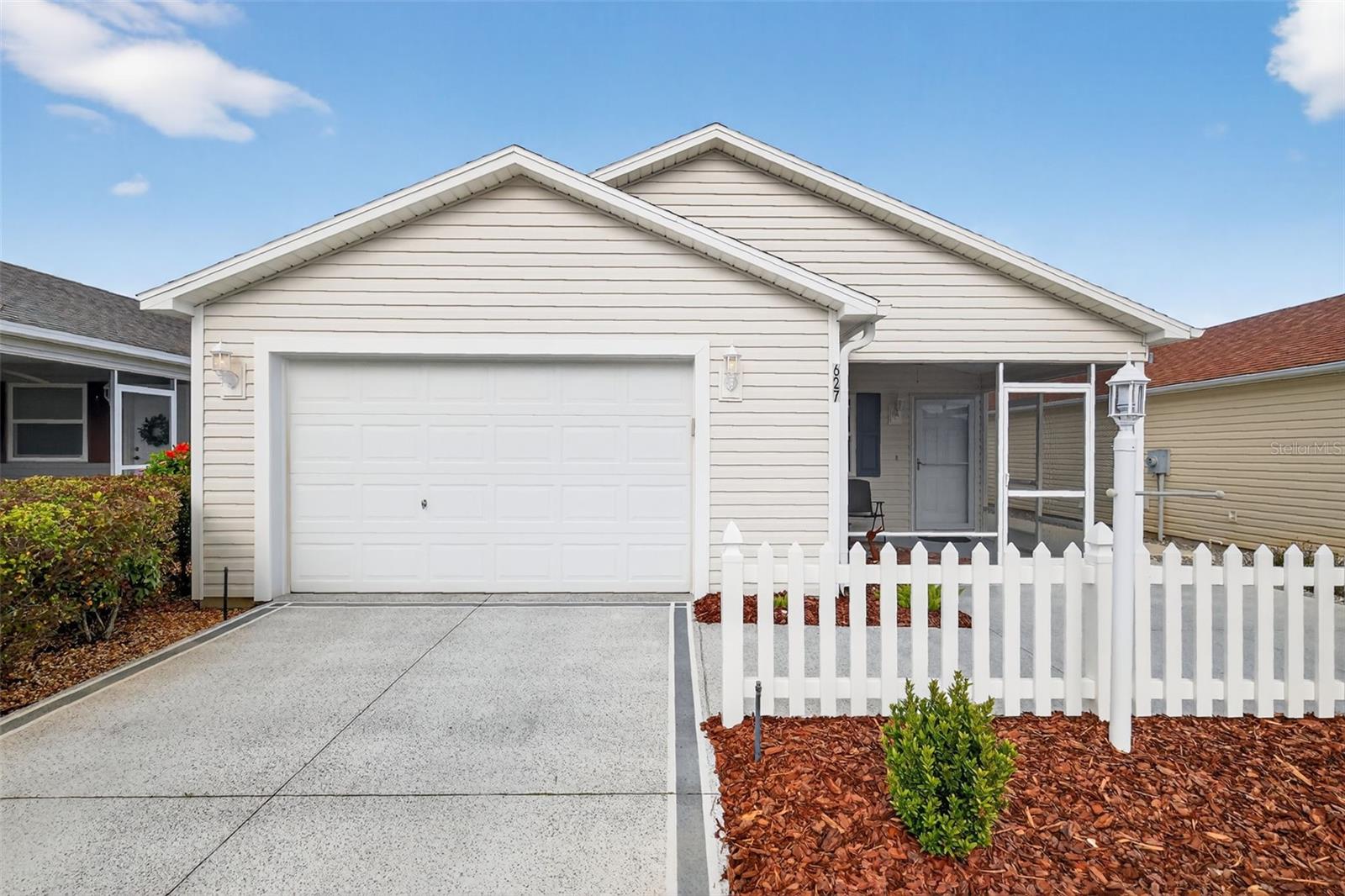 Enjoy the ease of Florida living in this FABULOUS, partially FURNISHED 2/2 Cabot Cove Patio Villa featuring SPACIOUS FRONT and SIDE PATIOS and an INTERIOR LAUNDRY ROOM - IDEALLY LOCATED in the highly sought after Village of Osceola Hills! As you arrive at this METICULOUSLY-MAINTAINED home, you are immediately greeted by its CHARMING white picket fence, DECORATIVELY PAINTED drive and walkways, and recently updated, LOW MAINTENANCE stone and mulched landscaping beds. The SPACIOUS front and side patios provide the perfect setting to relax in the Florida sunshine or host memorable outdoor gatherings with friends and family! From the patio, step into the screened lanai, complete with a ceiling fan and PAINTED floor, creating an inviting space to enjoy your morning coffee, unwind with an evening cocktail, or settle in with a good book. A NEW storm door welcomes you into an OPEN CONCEPT living, dining, and kitchen area, offering a bright, spacious, and airy main living space. Throughout the home, you’ll find GORGEOUS, WOOD-GRAIN LUXURY VINYL PLANK flooring - NO CARPET! Two LARGE windows and sliding glass doors in the living and dining areas flood the space with an ABUNDANCE of NATURAL LIGHT, enhancing the home’s warm and inviting feel. The chef-inspired kitchen features WOOD cabinetry with PULL-OUT shelving, NEUTRAL countertops, STAINLESS steel appliances, a LARGE PANTRY closet, and an EAT-IN breakfast bar - ideal for casual dining and entertaining. The primary suite boasts VAULTED ceilings, a generous WALK-IN closet, and a well-appointed en-suite bathroom with WOOD cabinetry, NEUTRAL countertops, and a MODERN WALK-IN shower accented with picket-fence TILE and a CONVENIENT folding bamboo shower seat. Bedroom two also offers a VAULTED ceiling and built-in closet. The second bathroom includes a WOOD vanity with NEUTRAL countertop, a tub and shower combination, and a hall LINEN closet. For added convenience, the centrally located INTERIOR laundry room is discreetly tucked behind a POCKET DOOR near the kitchen. Completing this IMPRESSIVE home is an 18’ x 22’ one-and-a-half-car garage featuring EPOXIED floors, a NEW garage door opener, and AMPLE space for both a vehicle and golf cart! DON’T MISS YOUR OPPORTUNITY TO MAKE THIS WONDERFUL VILLA YOUR OWN! The Village of Osceola Hills is IDEALLY LOCATED close to Brownwood Paddock Square with shopping, dining, and live nightly entertainment! Osceola Hills, Rohan, and Burnsed Recreational Centers; Belle Glade 27-hole Championship Golf Course and Country Club; Tequesta and Calusa Executive Golf Courses; Sharon Rose Wiechens Preserve and the Eleanor Lee Wiechens Wildlife Corridor; Atlas Dog Park; and County Road 466A with abundant shopping, restaurants, banks, and more! PLEASE WATCH OUR WALKTHROUGH VIDEO of this INCREDIBLE HOME and call today to schedule your Private Showing or Virtual Tour!