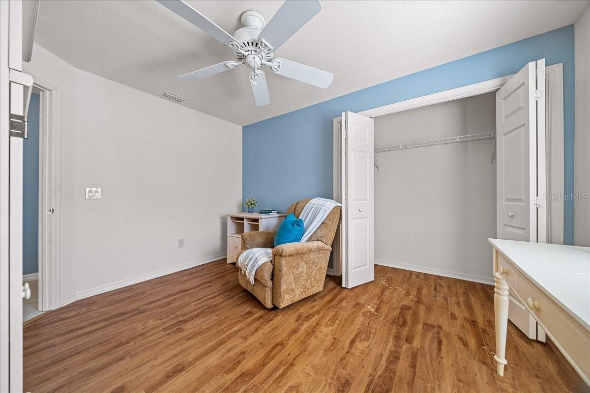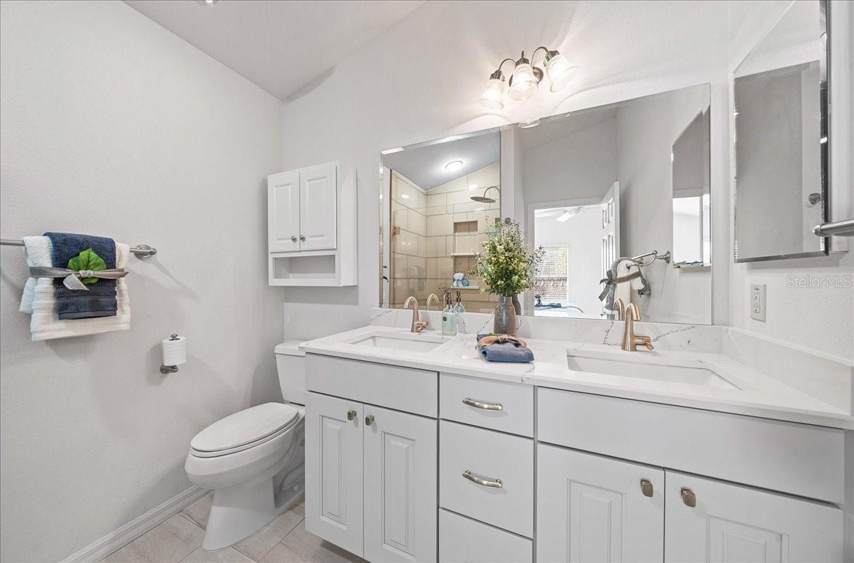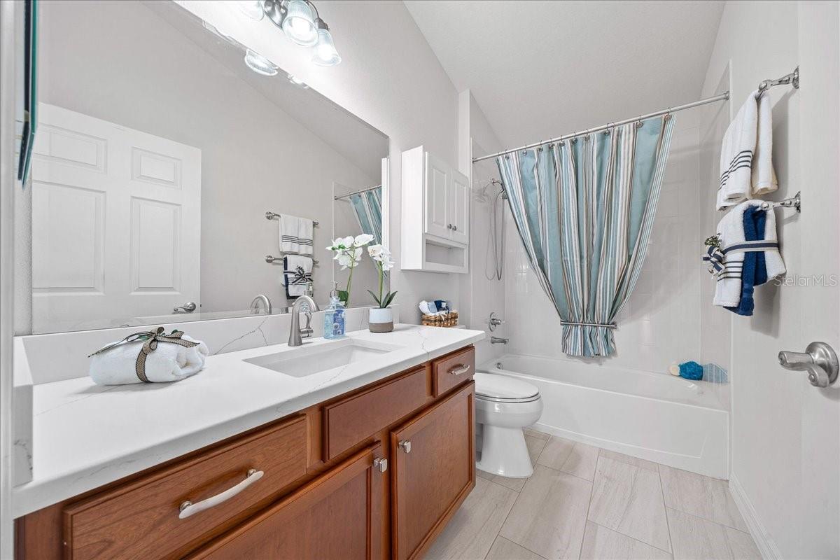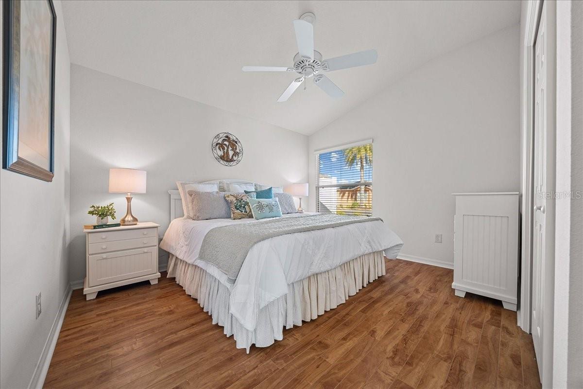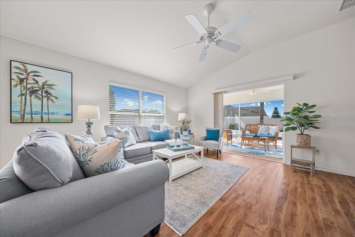 Welcome to this beautifully updated BLOCK & STUCCO FOXGLOVE Courtyard Villa in the highly desirable VILLAGE OF BONITA, offering 3 bedrooms, 2 full baths and a thoughtfully expanded layout thanks to the GLASS-ENCLOSED LANAI that has been opened to the main living area — adding valuable square footage and creating a bright Florida room overlooking your PALM TREE shaded backyard for cool afternoon enjoyment and relaxing outdoor living, on the FRESHLY PAINTED PATIO. Step inside to soaring VAULTED CEILINGS in the main living space and a flowing, open layout perfect for entertaining. The kitchen features white QUARTZ COUNTERTOPS, rich wood cabinetry with pull-out shelving, and a spacious one-level island with seating (not tiered!), providing exceptional counter space and functionality. Both bathrooms have been beautifully upgraded, and you’ll love the no-carpet design with BEAUTIFUL PORCELAIN TILE in the kitchen and wet areas, and engineered HIGH-GRADE LAMINATE FLOORING throughout the living room and bedrooms. The PRIMARY BEDROOM boasts VAULTED CEILINGS, a WALK-IN CLOSET, and a tastefully updated EN-SUITE, complete with QUARTZ COUNTERTOPS and a STYLISHLY UPDATED walk-in shower. The second BEDROOM features vaulted a ceiling, built-in closet, room for a king-size bed set, and easy access to the UPDATED guest bathroom with a SHOWER/ TUB COMBO, featuring QUARTZ COUNTERTOPS, and delightfully tucked away for privacy with a POCKET-DOOR. The 3rd Bedroom can easily be used as an office space or additional guest bedroom, with a large BUILT-IN CLOSET. Additional highlights include: • 1.5-car garage with EPOXY-COATED floor • LOW MAINTENANCE LANDSCAPING! • Large backyard patio ideal for morning coffee or evening gatherings • Open, light-filled living spaces with FLORIDA ROOM EXPANSION. Enjoy the convenience of being just minutes from shopping, dining, golf, pools, recreation centers, and all the lifestyle amenities that make The Villages so special, including the HAVANA CHAMPIONSHIP GOLF COURSE, the BACALL & AMBERWOOD EXECUTIVE COURSES, and the HAVANA COUNTRY CLUB RESTAURANT right at your fingertips! You're centrally located in the heart of The Villages! NEW ROOF December 2023, giving you peace of mind! This move-in-ready home blends comfort, style, and smart upgrades — schedule your private showing today!