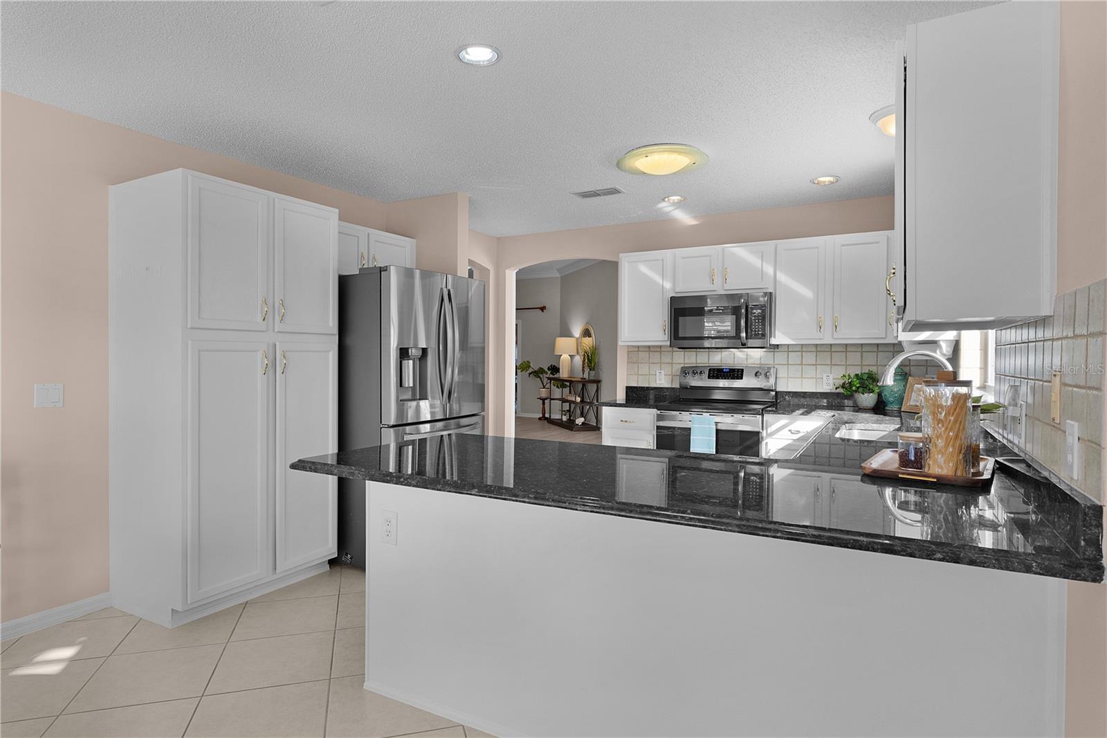 Bond Paid. Perfectly positioned near Spanish Springs and Lake Sumter Landing, this exceptional residence delivers refined Villages living with a rare sense of privacy and natural beauty. Set on an oversized homesite in Sumter County, the property unfolds as a tranquil garden sanctuary, where vibrant flowering plants, mature landscaping, and visiting butterflies create an elegant, resort-like backdrop. Inside, soaring 10’ ceilings, gorgeous millwork, crown molding, and a light, neutral palette enhance the home’s open and inviting feel. Wood laminate flooring flows through the main living areas, while the thoughtfully updated kitchen features granite countertops, tile backsplash, light cabinetry, enhanced appliances, and a pantry. A sun-filled breakfast nook with a graceful bay window offers the perfect space for morning coffee, while the formal dining room provides an elevated setting for holiday gatherings and entertaining. Designed for seamless indoor-outdoor living, the glass-enclosed lanai is wrapped in sun-drenched windows with pull-down shades and added A/C vents, allowing year-round enjoyment while overlooking the beautifully landscaped yard. The enclosed glass lanai with newer screens offers an additional outdoor retreat—ideal for relaxing after a day on the golf course or bask beneath your birdcage and enjoy Florida’s breezy afternoons. The split floor plan ensures privacy, with a spacious primary suite featuring a large walk-in closet, updated bathroom with dual granite vanities, and a walk-in shower with new doors. Two guest bedrooms share a well-appointed second bath, and an interior laundry room includes washer and dryer for added convenience. Notable upgrades include a 2021 roof, 2015 HVAC, 2022 hot water heater, new water filtration, new dishwasher and refrigerator, plantation shutters, full guttering with gutter guards, irrigation system, brick paved front patio and driveway, hardscaping and mature trees. The 2-car garage with added depth is equally impressive with an epoxy-finished floor, attic pull-down stairs, storage cabinetry, and garage door opener for added convenience on this block stucco home. Just 5 minutes by golf car to Spanish Springs and 10 minutes to Lake Sumter Landing, with easy access to shopping, dining, and the hospital, this home offers an elevated lifestyle in one of The Villages’ most convenient locations—where every day feels like a getaway.