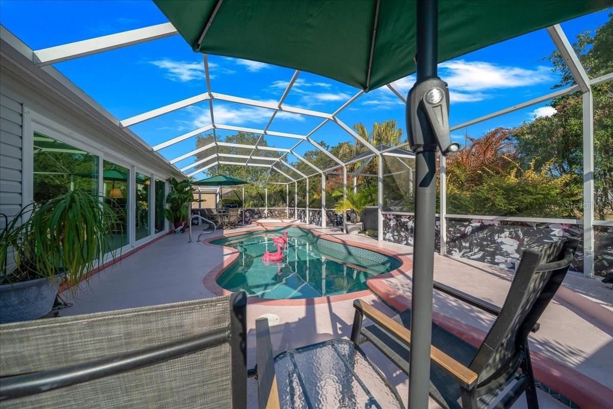 A true tropical oasis awaits in this beautifully customized SAN MARINO model, offered TURNKEY, situated on an OVER-SIZED LOT in The Village of Hacienda — complete with a PRIVATE HEATED SALTWATER POOL & SPA, BONUS DOUBLE GOLF CART GARAGE, and a thoughtfully designed home expansion. From the moment you step inside, you’ll be drawn to the stunning ENCLOSED 45.5' x 28.3' LANAI, 23.10' X 7.7' pool, and separate spa, surrounded by lush tropical landscaping that creates an exceptionally private retreat — perfect for relaxing in the sun or unwinding under the covered outdoor living area. With no neighboring sightlines, this pool area offers rare seclusion — enjoy your own slice of paradise in total comfort and privacy. The private pool is dual heated with SOLAR & ELECTRIC. The interior features a split floor plan, VOLUME CEILINGS, porcelain ITALIAN TILE and soft carpet, and multiple sliding glass doors that flood the home with natural light and provide seamless indoor-outdoor living. The EAT-IN kitchen offers white bay cabinets, a double-door pantry, PULL-OUTS, NEW DISHWAHER (2025) & NEWER MICROWAVE (2023) and generous counter space complete with GRANITE COUNTEROPS & TILE BACKSPLASH, flowing into the bright and open dining and living areas. The spacious primary suite features sliding doors to the lanai, DUAL CLOSETS, VOLUME CEILINGS, and a private ensuite with dual cultured marble vanities and a WALK-IN SHOWER with a BUILT-IN BENCH. A standout upgrade is the LAUNDRY ROOM addition, conveniently located just off the primary bedroom — offering ample cabinetry, a folding counter, and generous space. Guest bedrooms are well-sized each with a built-in closet, with the guest bathroom conveniently located in between featuring a tub/shower combo and solar tube, plus additional hallway storage including a large linen closet and coat closet. The 2-car 19' X 24' garage includes built-in storage cabinets, pull-down attic access, and a remote-controlled screen door, PLUS a NEWLY ADDED GOLF CART GARAGE that can accommodate TWO golf carts! * BOND PAID * GOLF CART INCLUDED * Oversized Lot * Extra Attic Storage Space * ROOF 2018 This home offers the perfect blend of privacy, functionality, and Villages lifestyle living — ideal for full-time residents or a luxury seasonal retreat. Close to the SAVANNAH CENTER, CORDOBA REC CENTER, TIERRA DEL SOL, HACIENDA HILLS GOLF & COUNTRY CLUB, DE LA VIST EXECUTIVE COURSE, and SPANISH SPRINGS TOWN SQUARE. Offered TURNKEY, just bring your suitcase and come home today!