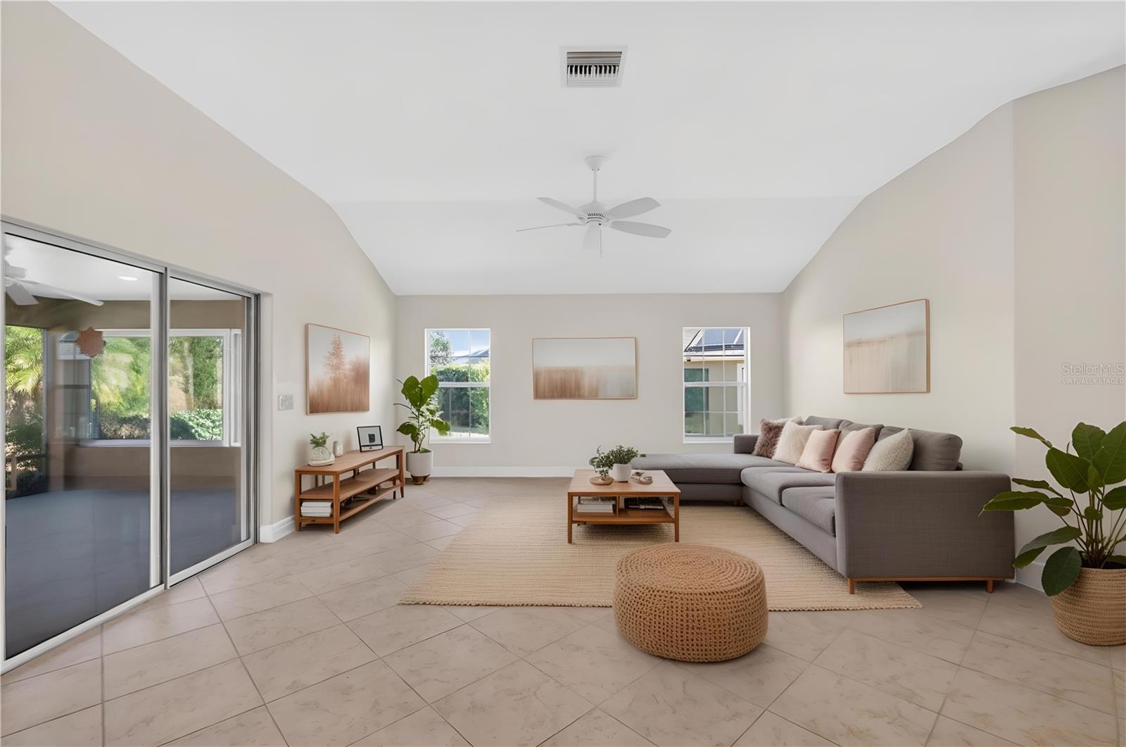 Nestled within a quiet CUL-DE-SAC in the highly coveted village of LAKE DEATON, this SPECTACULAR 3/2 BLOCK and STUCCO Gardenia model boasting an IMMENSE 30’x15’ SCREENED LANAI with adjoining STONE PATIO, LARGE REAR YARD with PRIVACY WALL and ROOM FOR A POOL, and an EXPANSIVE, OVERSIZED 583SF TWO CAR + GOLF CART garage is a MUST SEE! NEW ROOF (2025) and HVAC (2025)! TROPICAL landscaping with PAVER-edged beds, PAINTED drive and walkway, SCREENED entry, and a LEADED-GLASS door with sidelight and transom window welcome you in to a well-lit and GENEROUS foyer. UPGRADES include THREE SOLAR TUBES and HIGH baseboards throughout. The EXPANSIVE OPEN CONCEPT living, dining, kitchen, and dinette features GORGEOUS diagonally TILED flooring and HIGH VAULTED CEILINGS creating a SPACIOUS and voluminous main living area. The STUNNING kitchen showcases staggered, cinnamon-toned, WOOD cabinetry; GRANITE countertops; STAINLESS appliances; and UNDER-CABINET lighting. A built-in PANTRY with ROLL-OUTS and a convenient EAT-IN breakfast bar complete this culinary haven. For casual dining, the dinette area, sits adjacent to the kitchen with DOUBLE windows and transom inviting plenty of NATURAL LIGHT. A DOUBLE SET of sliding glass doors, from the living and dining rooms, opens to an IMMENSE 30’ x 15’ screened lanai. This EXCEPTIONAL outdoor living space features a painted floor, two ceiling fans, side GLASS windows, and an exterior door leading to the REAR STONE PATIO and LARGE backyard, ideal for gardening and outdoor enjoyment. This AMAZING space offers a REAR PRIVACY WALL and ample room for a FUTURE SWIMMING POOL, creating a truly FABULOUS setting for relaxation and entertaining! Back inside, the luxurious primary bedroom boasting a TRAY ceiling, TILE flooring, and TWO CUSTOMIZED WALK-IN closets. Its en-suite bathroom is a retreat in itself, featuring TILE flooring, TWO separate WOOD vanities with GRANITE tops, TILE ROMAN-STYLE WALK-IN shower, built-in LINEN closet with a hamper, and a separate water closet. Two additional bedrooms and a second bathroom are conveniently located near the front of the home, ensuring plenty of PRIVACY for guests or a quiet home office. Bedroom two features TILE flooring, a TRAY ceiling, and a large BAY window. The second bathroom is well-appointed with TILE floors, WOOD cabinetry, GRANITE countertop, TILED tub and shower combination, and a hallway linen closet. The third bedroom boasts a VAULTED ceiling and a built-in closet. A generous INTERIOR laundry room features TILE floors, a BUILT-IN utility sink with GRANITE top, shelving, and WOOD cabinetry for extra storage needs. The EXPANSIVE, OVERSIZED 29'x24' TWO-CAR + GOLF CART GARAGE offers EPOXIED flooring, WHITE STORAGE cabinets, attic insulation above, and a whole-house Nova water filtration system. DON’T MISS YOUR OPPORTUNITY TO MAKE THIS INCREDIBLE HOME YOUR OWN! The Village of Lake Deaton is conveniently located close to Brownwood Paddock Square, Evans Prairie Golf and Country Club, Bonifay Golf and Country Club, Belle Glade Golf and Country Club, Lake Deaton Pool and Recreation Center, Lake Okahumpka Park, Lake Deaton Plaza, Freedom Plaza, Colony Plaza, and an abundance of shopping, restaurants, banks, medical, and more! PLEASE WATCH OUR WALKTHROUGH VIDEO OF THIS MAGNIFICENT HOME with ROOM FOR A POOL and call today to schedule your Private Showing or Virtual Tour!
