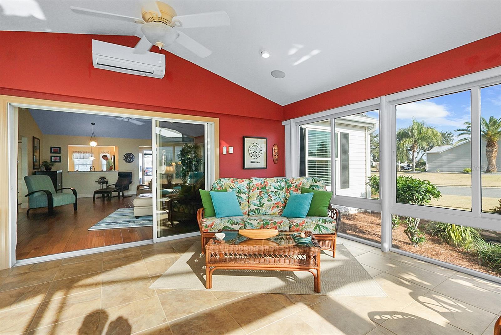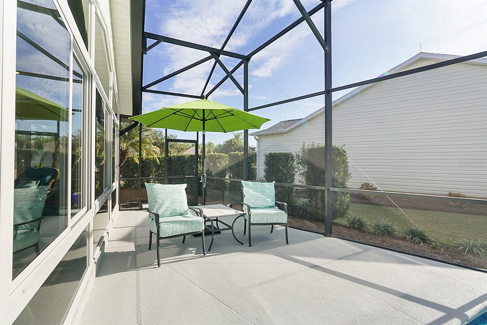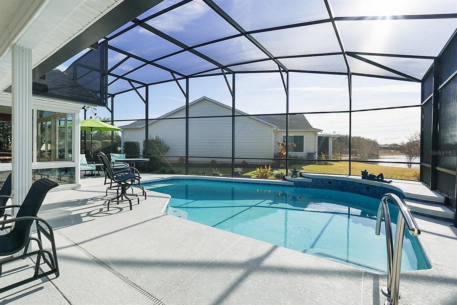 This one of a kind designer home is what many envision when dreaming about retirement! Featuring a 2 car, plus golf cart garage this residence blends intelligent upgrades with resort-style living in one of the most desirable areas near Lake Sumter Landing. The home makes a strong first impression w/ a decorative concrete driveway, enhanced landscaping, & towering palm trees that create exceptional curb appeal. Inside, the home has been professionally painted, contributing to a clean, polished look that allows the architectural details and views to take center stage. A major highlight is the all season glassed-in sunroom, designed w/ Low-E sliding glass windows, pull-down shades, tile flooring, & a dedicated mini-split HVAC system, allowing year round enjoyment of the expansive water views. This space is further enhanced with flush mount speakers, which also extend to the exterior lanai—ideal for entertaining or relaxing with music while enjoying the outdoor setting. The kitchen is both functional and refined, featuring custom pull-out drawers, granite countertops & Blanco granite sink, tile backsplash, & stainless kitchen appliances (2015), including a French door refrigerator & a gas range, a highly sought-after feature for those who enjoy cooking. In 2019, the home underwent a substantial custom addition, elevating it well beyond a typical designer property. Improvements include an expanded laundry room with folding counter, cabinetry, & hanging system, enhanced storage, & a beautifully updated primary suite. The primary bath features dual vanities & a spacious Roman shower with custom tile work, including gray subway tile, creating a spa-like retreat. The living space was extended w/ a tray ceiling and seamlessly connects to the outdoor living area, where a summer kitchen and additional half bath make entertaining effortless. Overlooking the water is the show-stopping 11,500-gallon swimming pool (2019)—solar heated w/ gas backup, auto-fill system, Pentair filtration, & Dolphin robotic cleaner—fully enclosed and positioned to maximize the incredible water views. An additional storage room and thoughtfully designed outdoor spaces reinforce that this home was built to be enjoyed. From a systems standpoint, the home has been meticulously maintained and upgraded, including a new whole-house HVAC system (2016), new roof (2019), new hot water heater (2018), replacement mini-split HVAC for the sunroom (2023), & servicing of the sunroom windows (2023). All house windows were replaced (2024), along w/ interior window blinds, improving energy efficiency. Additional updates include a new Pentair salt cell (2025), new pool enclosure screening (2025), two new garage door openers (2025), & updated smoke and CO2 alarms w/ 10-year batteries (2026). Beyond the home itself, the location offers the perfect balance of convenience & refinement—close to the square, yet positioned to enjoy tranquil water views, established surroundings, & easy golf cart access to dining, shopping, entertainment, & recreation. The home shows like a model, reflecting years of thoughtful care and strategic upgrades. Furnishings are available separately through the owners, allowing the next homeowner the opportunity to move right in or personalize the space. This is not just a home—it is a carefully engineered lifestyle property, offering panoramic water views, exceptional indoor-outdoor living, and a level of quality rarely found.