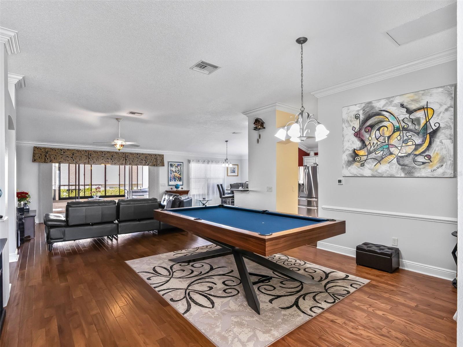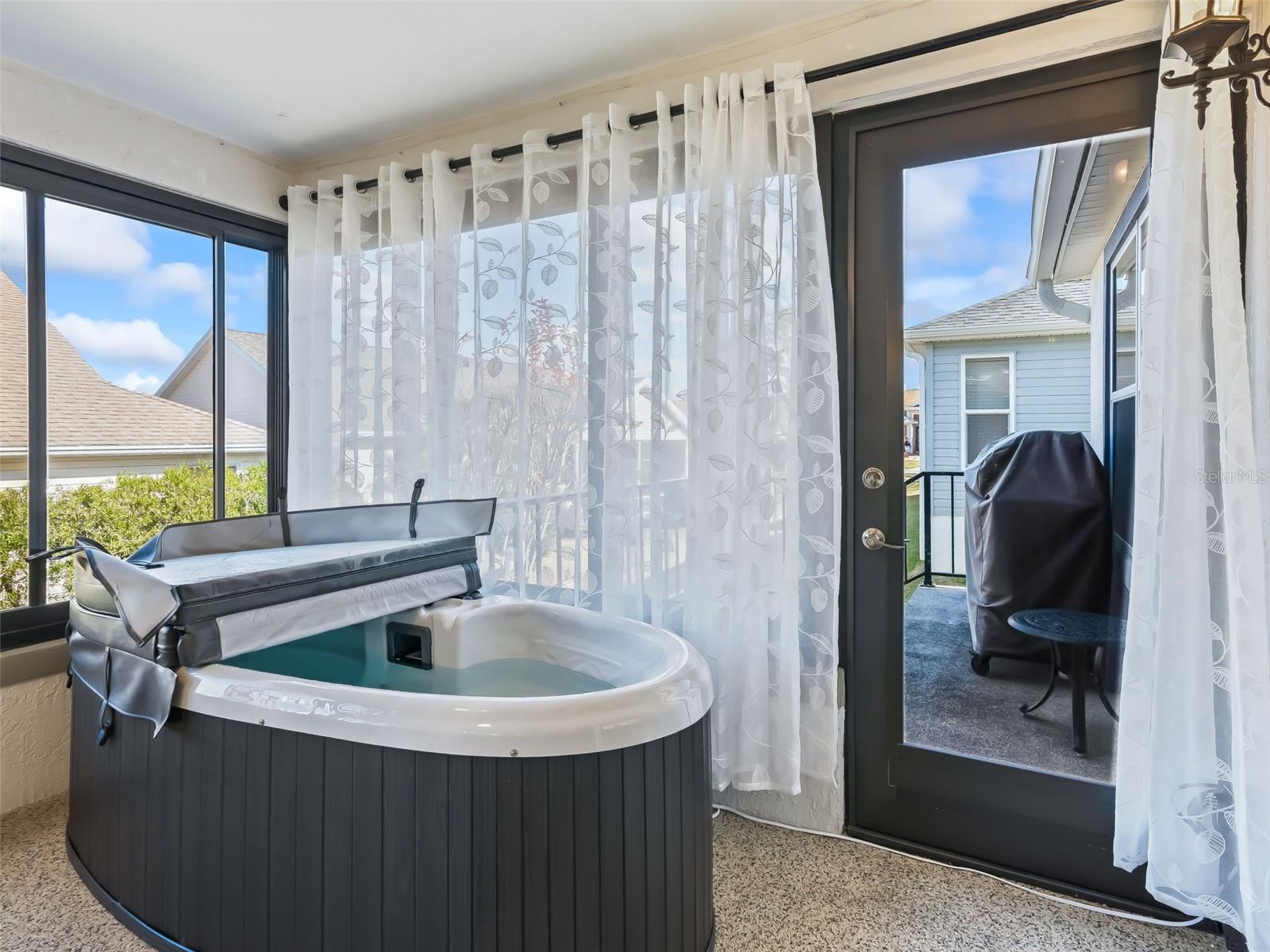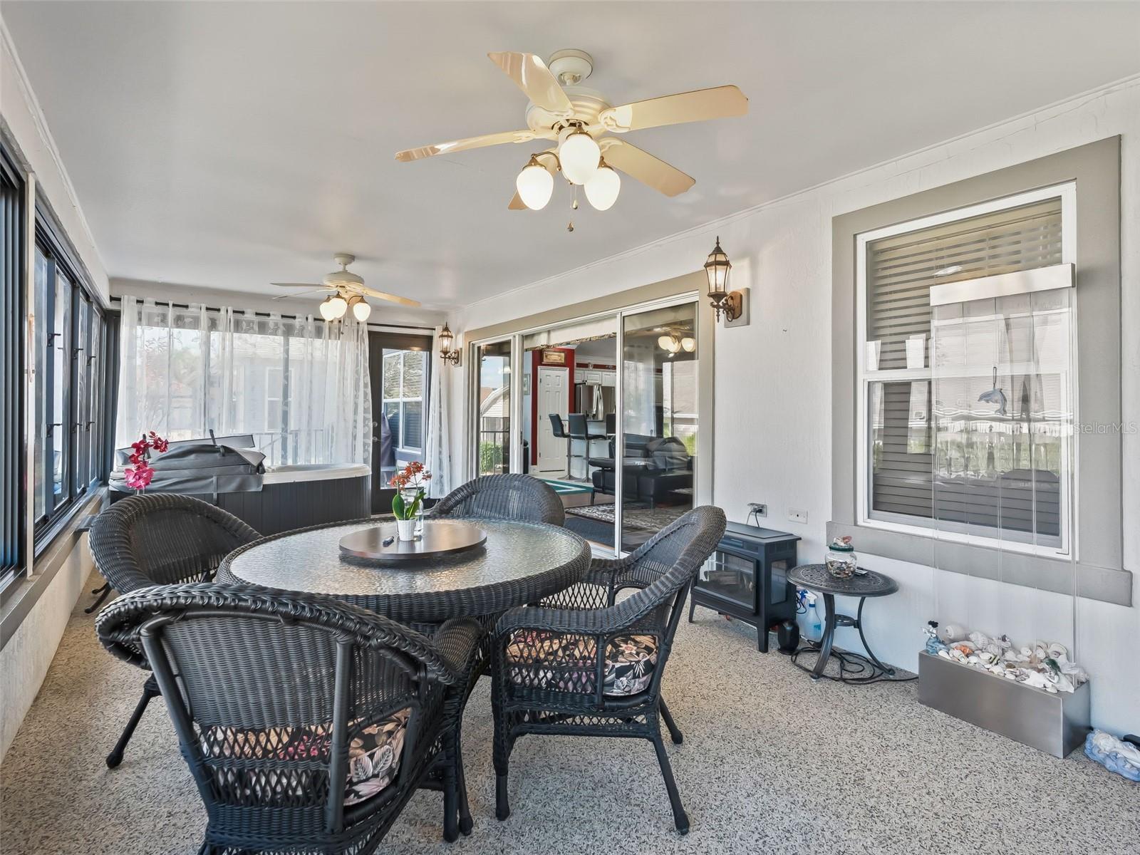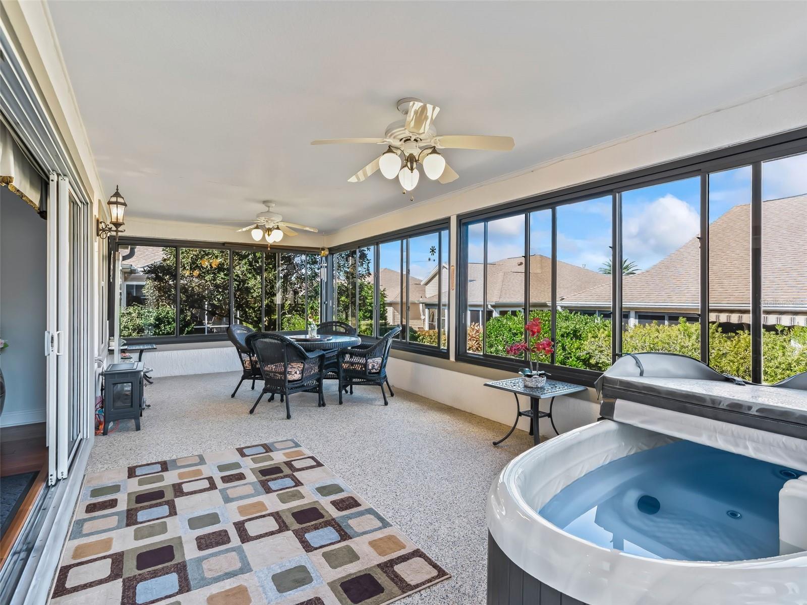 If you’ve been waiting for a home with the big-ticket updates already done—this is it. Enjoy peace of mind with the BOND PAID, NEWER ROOF (2021), HVAC (2020), and PAID-IN-FULL SOLAR PANELS (2021)! This upgraded Lantana/Juniper model is packed with value, including a Tesla EV charger in the garage, a NEW WIFI garage door opener (2024), and a 2-PERSON HOT TUB—and that’s just the beginning. This 3-bedroom, 2-bath home features volume ceilings, beautiful crown molding, wood floors in the living and dining areas, and an open layout designed for comfort and entertaining. A standout bonus: the pool table that converts into a dining table conveys with the home! The kitchen offers stone countertops and newer stainless steel appliances, including a refrigerator (2025), dishwasher, range, and microwave. It opens to the family room and breakfast area, making it ideal for gathering with friends and family. The inside utility room off the kitchen includes a washer and dryer and offers additional storage space. The private owner’s suite is located at the back of the home and includes a large walk-in closet, dual sinks, and volume ceilings. The guest area is thoughtfully placed near the front of the home and features a spacious guest bedroom with a bay window, a second guest bedroom, and a convenient guest bath. You’ll spend hours enjoying the huge enclosed lanai, offering plenty of room for dining and lounging, plus an additional open patio—perfect for grilling or soaking up the Florida sunshine. Major improvements continue with exterior paint (Jan 2023), an irrigation refresh with all heads replaced (Aug 2023), and the standout upgrade: July 2024 BUGOUT Attic & Insulation TAP® Pest Control treatment—designed to help control pests while offering added benefits such as being fire-resistant, environmentally friendly, energy-saving, sound-reducing, mold and mildew resistant, and backed by a warranty. Located on a quiet cul-de-sac street, this home is just 2.5 miles from Lake Sumter Landing and close to 466A, restaurants, shopping, and entertainment. Schedule your private showing today—this one has the updates buyers want most.