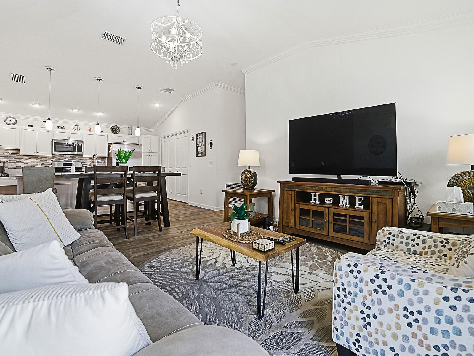 Welcome to this beautiful Topaz Model Villa in the highly desirable Village of DeLuna! Ideally located just a short golf cart ride to Brownwood Paddock Square, you’ll enjoy convenient access to shopping, dining, and nightly entertainment. Also nearby are Edna’s on the Green, the Magnolia Shopping Plaza, and the Water Lily Recreation Center, offering a family pool, outdoor exercise equipment, billiards, gathering rooms, and more. Golf lovers will appreciate the close proximity to the Lowlands Executive Golf Course on the southern end of the village. This thoughtfully designed villa showcases vaulted ceilings with Crown Molding and an inviting open floor plan, perfect for both everyday living and entertaining. The kitchen features white shaker cabinetry, tile backsplash, stainless steel appliances, gas utilities, a convenient desk area, and flows seamlessly into the main living space. The spacious primary suite is privately situated at the rear of the home and offers a large walk-in closet, dual sinks, and a step-in shower. Enjoy indoor-outdoor living with a private screened front lanai—ideal for peaceful mornings or hosting friends and family. Additional highlights include no homes behind, a generous side yard providing greenery and natural light, and a concrete side patio with a custom-built pergola, perfect for grilling and relaxing. A full two-car garage and interior laundry add to the home’s functionality. Whether you’re seeking a full-time residence or a seasonal retreat, this low-maintenance villa truly checks all the boxes for enjoying the best of The Villages lifestyle.