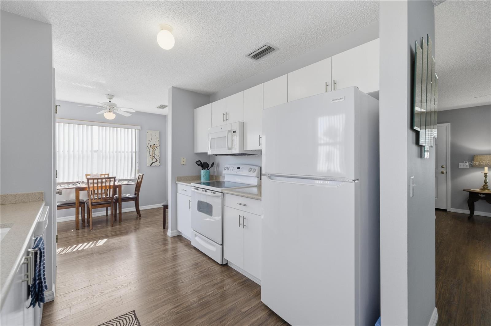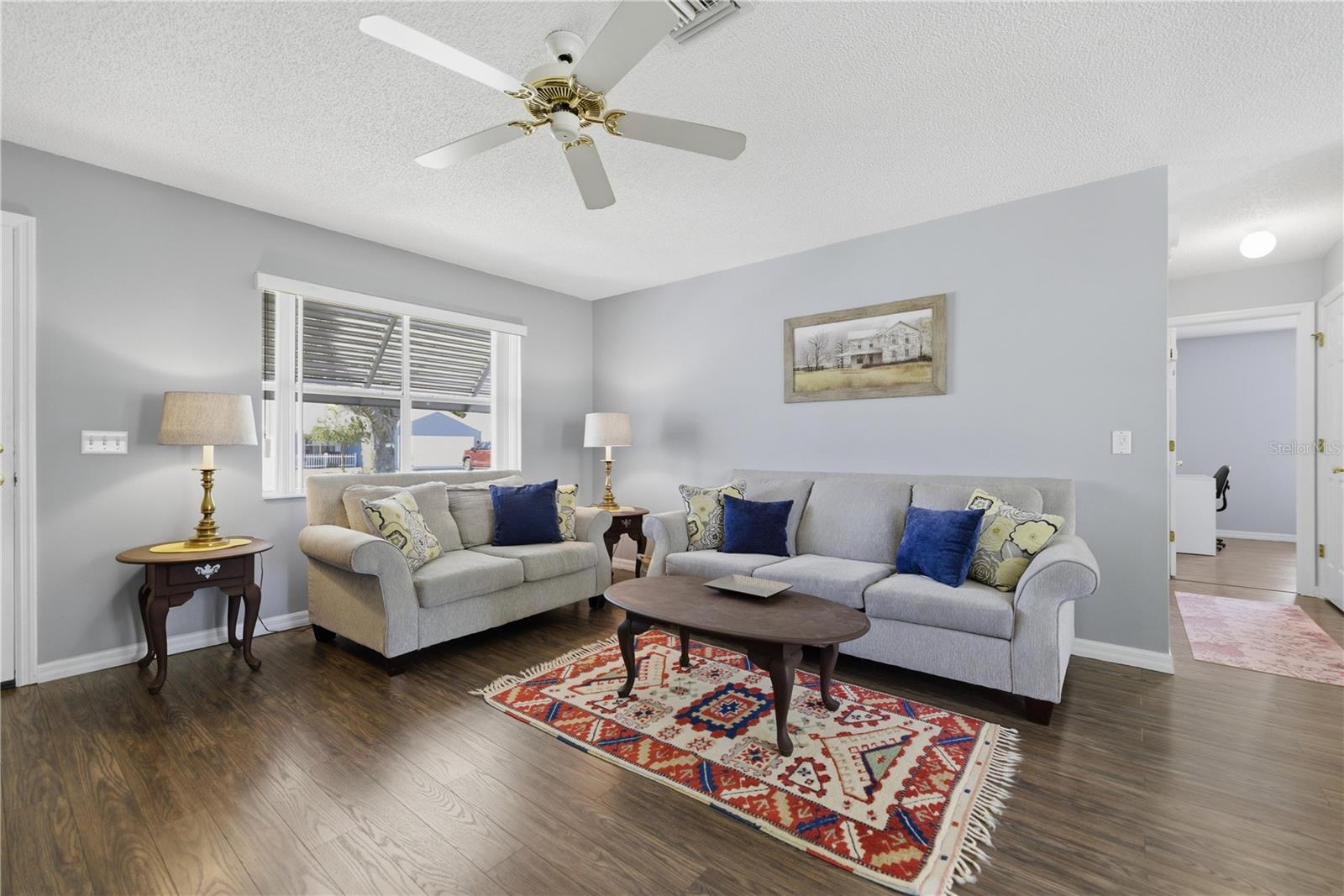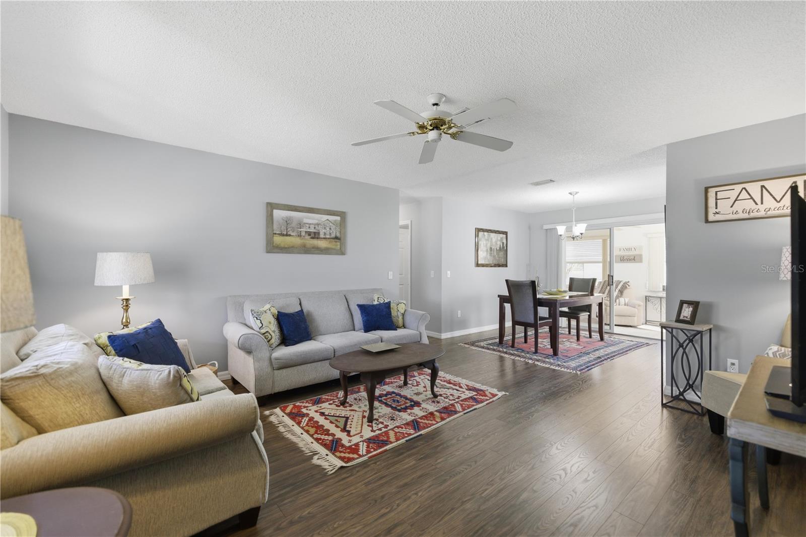 BOND PAID, ROOF 2025 and TRULY TURNKEY—Fully Furnished and READY TO ENJOY immediately. This is a fantastic opportunity to own a low-maintenance investment or second home in the sought-after Village of Mira Mesa. This charming two-bedroom, two-bath single-family home is well maintained, move-in ready, and thoughtfully designed for comfort and convenience. The warm, inviting interior features NO CARPET, with laminate wood flooring flowing throughout the main living areas. The spacious living room opens seamlessly to the dining area, creating an airy layout ideal for both everyday living and entertaining. The kitchen is well appointed with GRANITE countertops, a newer refrigerator, ample pearl- finished cabinetry, a pantry for extra storage, and a cozy BREAKFAST NOOK—perfect for casual meals or morning coffee. The primary suite offers a peaceful retreat with a generous walk-in closet and an en-suite bath featuring a walk-in shower. The guest bedroom is spacious and conveniently located next to the full bath with a tub/shower combination. Enjoy year-round Florida living in the FULLY ENCLOSED, air-conditioned lanai, ADDING OVER 130 square feet of additional living space—ideal for relaxing mornings or unwinding in the evenings. Additional highlights include a screened garage with room for a vehicle and golf cart, metal attic stairs for easy access, extra storage, NEWER WINDOWS, and turnkey furnishings included (Note Oriental Rugs are excluded from furnishings) Located minutes from Spanish Springs Town Square and Close to Sumter Landing, this home is ideally positioned near top tier amenities such as Championship Golf Courses and Country Clubs, Executive Courses, Pickleball, numerous pools, shuffleboard, bocce, as well as shopping, dining, and medical services.