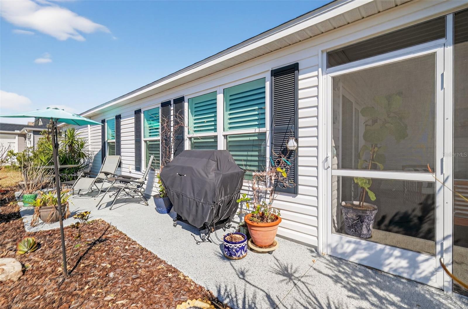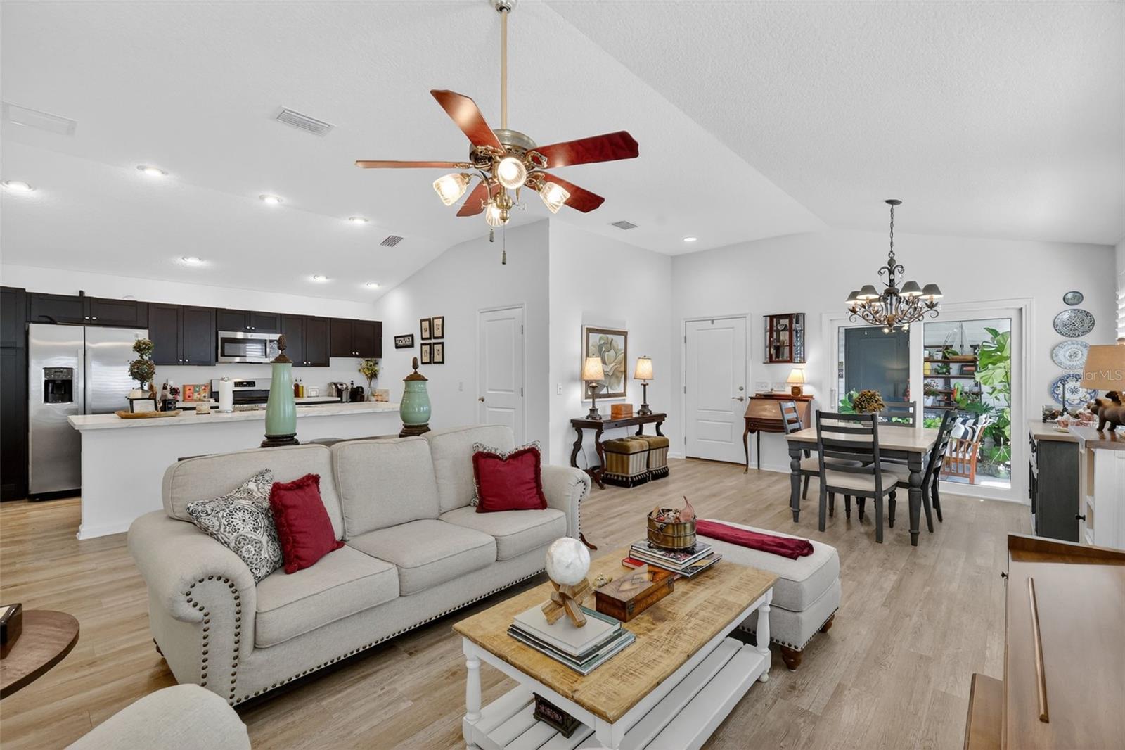 Built in 2023 and situated on a desirable CORNER LOT, this 2-Bedroom, 2-Bathroom Emerald model Patio VILLA in the Village of LAKE DENHAM offers modern design, thoughtful upgrades, and low-maintenance living in one of The Villages’ newest and most vibrant neighborhoods. A rare dual-garage configuration provides both an extended 1-car garage and a separate GOLF CART GARAGE —perfect for storage, convenience, and an active Villages lifestyle. From the moment you arrive, curb appeal impresses with a DECORATIVE coated driveway, enhanced landscaping, and added privacy afforded by the corner lot. Inside, the bright open-concept floor plan features Luxury Vinyl Plank flooring throughout the main living areas, creating a warm and inviting space ideal for entertaining. The spacious kitchen is highlighted by Shaker-style cabinetry, a center island with breakfast bar, STAINLESS STEEL appliances, and a gas range, all overlooking the living and dining areas for seamless flow. The Primary Suite serves as a peaceful retreat with a walk-in closet and a private ensuite bath featuring dual sinks and tub/shower combination. The guest bedroom includes a built-in closet and office space with convenient access to the guest bath with a tub/shower combination. Additional interior features include a storage closet, inside laundry with washer and dryer included, and tasteful furnishings throughout. This lightly lived-in home also offers a furniture package available outside of contract. Enjoy Florida living year-round in the fully screened patio lanai, accented with a beautiful shiplap ceiling, perfect for morning coffee or evening relaxation. Step outside to your private side yard and enhanced outdoor living space, offering tranquility and sunshine in your own corner retreat. Located in the highly desirable Lake Denham area, you’re close to recreation centers, walking trails, golf, and the dining and entertainment of Sawgrass Grove. Nearby amenities include Recreation Centers, Championship and Executive GOLF COURSES Golf Courses. Combining newer construction, modern finishes, and a hard-to-find dual-garage setup, this Emerald Villa delivers comfort, style, and exceptional access to The Villages lifestyle. Call today for a private showing.