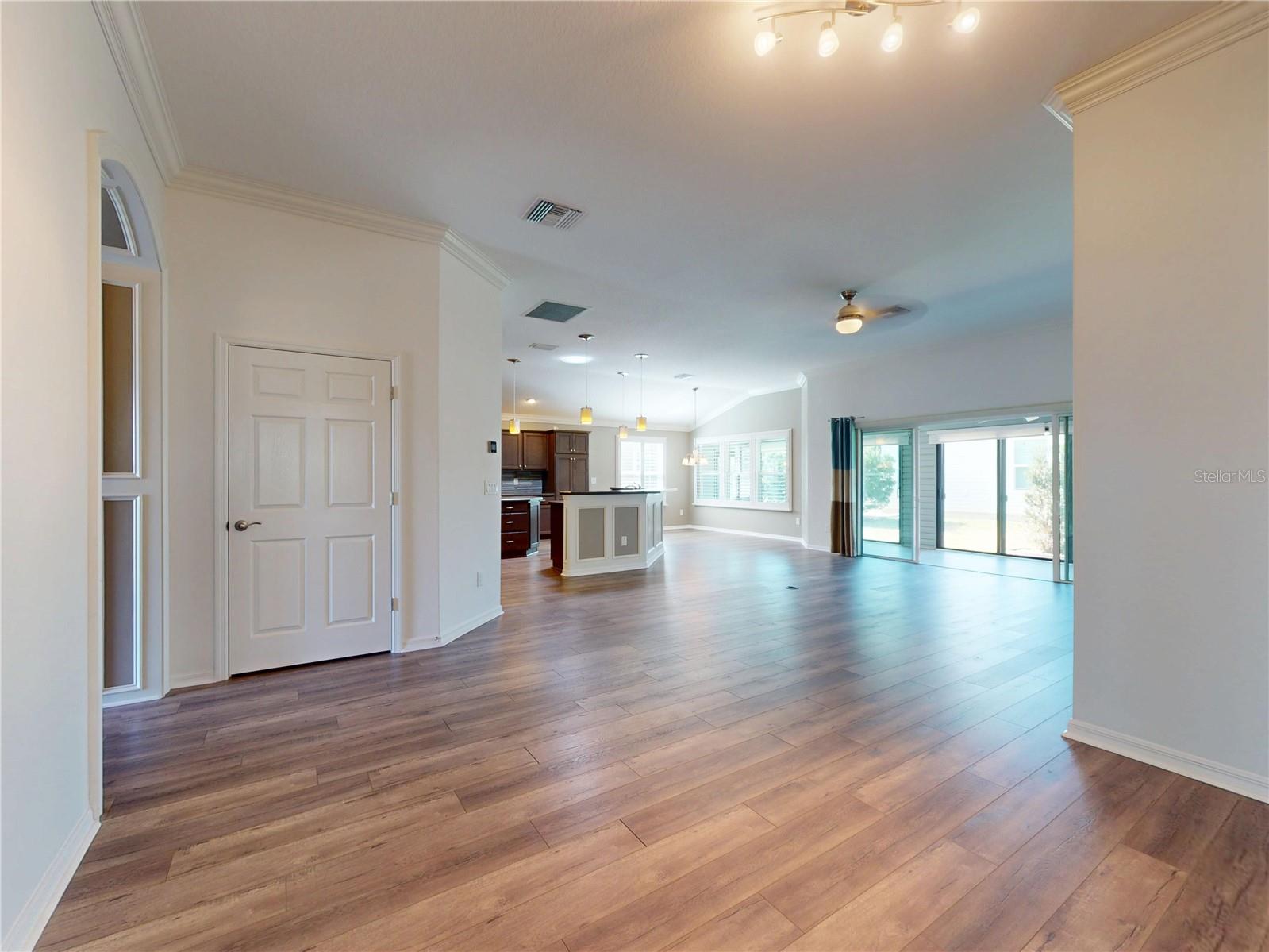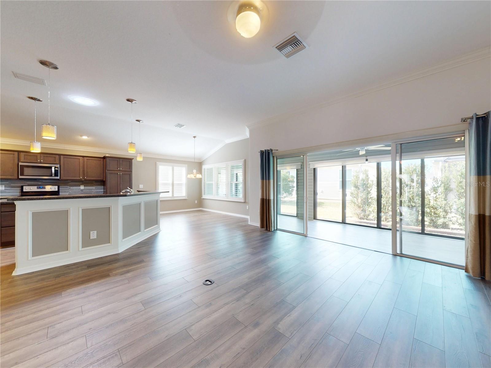 BREATHTAKING SYCAMORE DESIGNER in the VILLAGE OF OSCEOLA HILLS. You’re perfectly positioned close to BROWNWOOD PADDOCK SQUARE and SAWGRASS GROVE, two of The Villages’ most popular destinations for dining and entertainment. This home is packed with UPGRADES and designed for effortless FLORIDA LIVING! From the moment you arrive, you’ll appreciate the PROFESSIONAL LANDSCAPING, GUTTERS AROUND THE ENTIRE HOME, a painted driveway, and a welcoming decorative glass front door that sets the tone for what’s inside. Step into a light, bright, and truly OPEN FLOOR PLAN. Enjoy a spacious GREAT ROOM layout that combines living, dining, and kitchen into one large, inviting space. The home is styled in soothing, NEUTRAL COLORS, and the main living areas are elevated with CROWN MOLDING, HIGH/VOLUME CEILINGS, and PLANTATION SHUTTERS that add a timeless, cozy appeal. The kitchen is a showstopper with RICH CABINETRY with crown molding, elegant PENDANT LIGHTING, a BEAUTIFUL BACKSPLASH and STAINLESS STEEL APPLIANCES that completes the space, making it as functional as it is impressive. Unwind in the PRIMARY SUITE featuring BRAND NEW CARPET, an INDIRECT-LIT TRAY CEILING and a spacious WALK-IN CLOSET. The en-suite bath offers a large ROMAN WALK-IN SHOWER, delivering a clean, open, spa-like feel. The guest wing is thoughtfully arranged, with the GUEST SUITE POCKET DOOR offering extra privacy when friends or family visit. Don’t miss the GLASS-ENCLOSED LANAI! It is an ideal bonus space for morning coffee, evening cocktails, hobbies, or hosting. And yes, the garage checks the boxes too: a spotless EPOXY FLOOR plus PULL-DOWN ATTIC STAIRS for extra storage. This is the kind of home buyers LOVE to tour, SAVE, and come back to, because it delivers the lifestyle, the layout, and the upgrades in one complete package. COME EXPERIENCE OSCEOLA HILLS AND SEE WHY THIS HOME STANDS OUT!