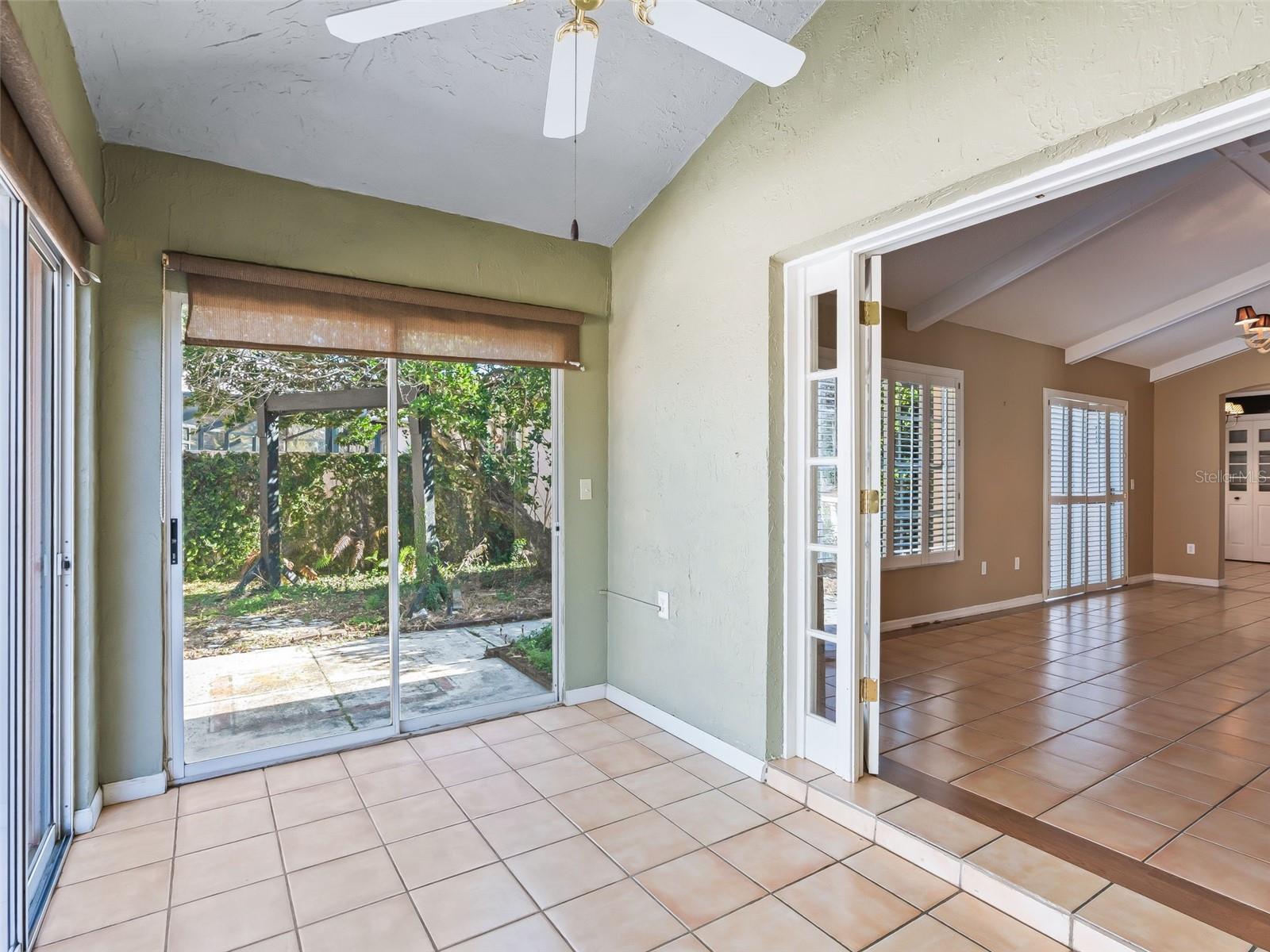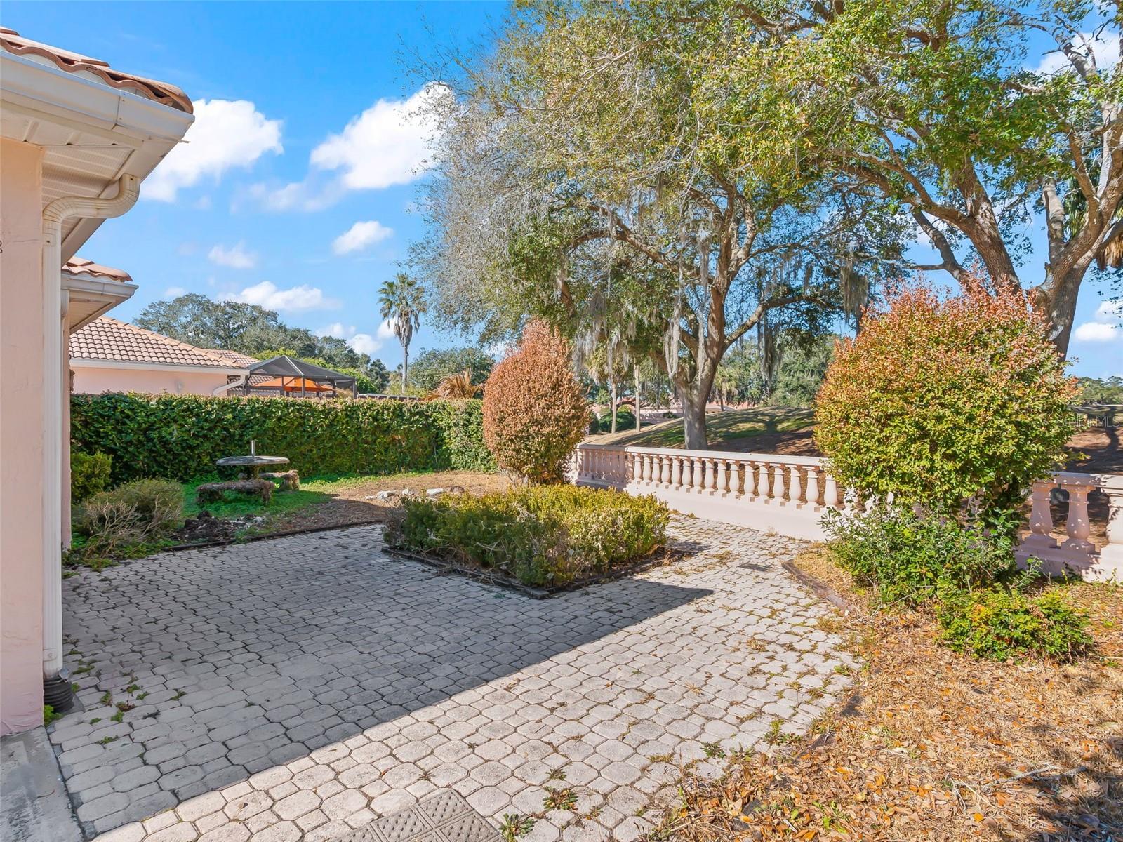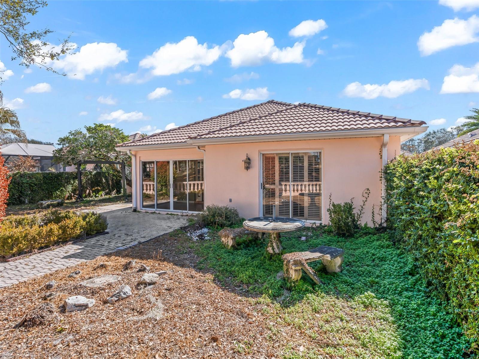 Welcome to this charming El Cancun Courtyard Villa offering privacy, character, and a beautiful golf course backdrop. The exterior showcases a classic Spanish tile roof, a two-car garage, and a spacious enclosed courtyard that opens to scenic views of the Hacienda Golf Course. Inside, the home features tile flooring throughout, crown molding, central vacuum system, plantation shutters, and striking ceiling beams in the living room. An electric fireplace creates a cozy focal point, while multiple glass sliding doors seamlessly connect the living space to the courtyard for effortless indoor-outdoor living. The kitchen offers abundant cabinetry, a newer refrigerator, and a pantry with glass doors and built-in shelving for added style and storage. The primary suite boasts high ceilings, a walk-in closet with built-ins, dual sinks, and a private water closet. The guest bedroom includes a built-in Murphy bed with crown molding and shelving on both sides, making it perfect for guests or a flexible office space. The guest bath features a tub/shower combo, vanity with elevated bowl sink, and a unique wood ceiling. Step outside to the private courtyard designed for relaxing and entertaining, with privacy walls on both sides and an open rear view overlooking the Hacienda Golf Course. Multiple seating areas provide plenty of room to enjoy the Florida lifestyle. Ideally located near shopping, dining, and all the amenities The Villages has to offer, this home combines comfort, convenience, and a picturesque setting.
