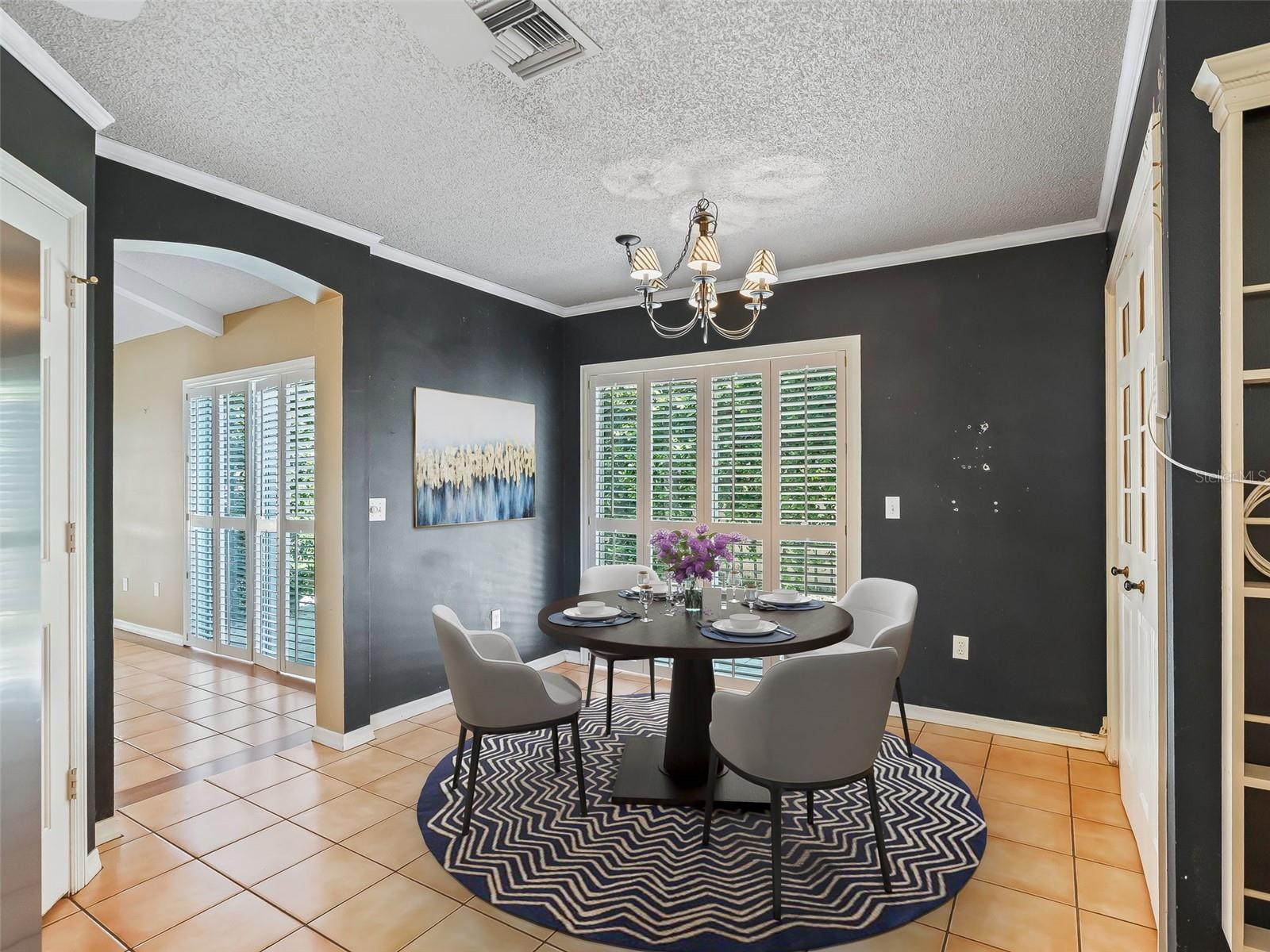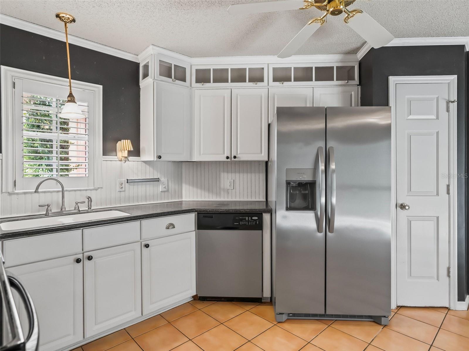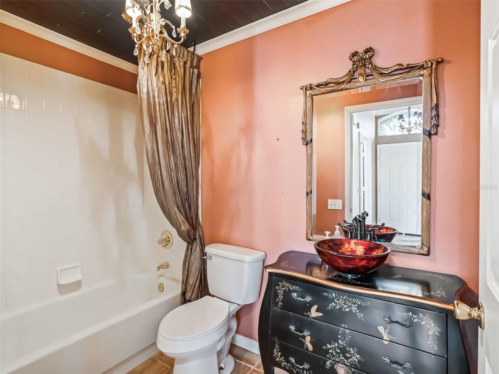 Welcome to this charming El Cancun Courtyard Villa offering privacy, character, and a beautiful golf course backdrop. The exterior showcases a classic Spanish tile roof, a two-car garage, and a spacious enclosed courtyard that opens to scenic views of the Hacienda Golf Course. Inside, the home features tile flooring throughout, crown molding, central vacuum system, plantation shutters, and striking ceiling beams in the living room. An electric fireplace creates a cozy focal point, while multiple glass sliding doors seamlessly connect the living space to the courtyard for effortless indoor-outdoor living. The kitchen offers abundant cabinetry, a newer refrigerator, and a pantry with glass doors and built-in shelving for added style and storage. The primary suite boasts high ceilings, a walk-in closet with built-ins, dual sinks, and a private water closet. The guest bedroom includes a built-in Murphy bed with crown molding and shelving on both sides, making it perfect for guests or a flexible office space. The guest bath features a tub/shower combo, vanity with elevated bowl sink, and a unique wood ceiling. Step outside to the private courtyard designed for relaxing and entertaining, with privacy walls on both sides and an open rear view overlooking the Hacienda Golf Course. Multiple seating areas provide plenty of room to enjoy the Florida lifestyle. Ideally located near shopping, dining, and all the amenities The Villages has to offer, this home combines comfort, convenience, and a picturesque setting.