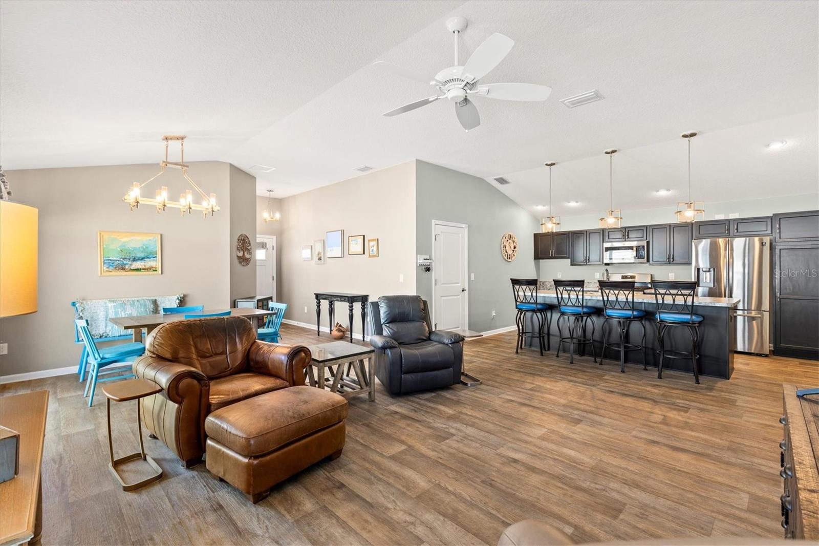 Fabulous RARE FIND 3-Bedroom 2-Bath EMERALD COURTYARD VILLA 1426 sq ft with a GARAGE + A GOLF CART GARAGE —tucked away in the beautiful Village of CITRUS GROVE, one of the most sought-after neighborhoods in all of The Villages! JUST MINUTES to SAWGRASS GROVE, EASTPORT (including the new Super Walmart), EZELL RECREATION CENTER, BROWNWOOD SQUARE, dining, banking, medical, and more—everything you need, right at your fingertips. Built in 2021, with a LOW BOND BALANCE OF $17,263.72, this nearly NEW home delivers low-maintenance luxury, contemporary finishes, and the peace of mind you’re looking for. Step inside to an inviting OPEN-CONCEPT layout with high VAULTED CEILINGS that's packed with upgrades, including VINYL FLOORING, upgraded LIGHT FIXTURES & Ceiling Fans, 2 BIDETS, WHIRLPOOL water softener system, INSULATED garage door and a NEW Quiet Garage Door Opener.. The chef’s kitchen features ONYX cabinetry w/hardware, PULL-OUTS, STAINLESS appliances (UPGRADED Refrigerator), BUILT-IN PANTRY and DESK, NEW Garbage Disposal, WHIRLPOOL water filtration and a LARGE CENTER ISAND with an EAT-IN breakfast bar—perfect for gatherings and casual dining. (Barstools convey with the home) From the dining area, sliding glass doors open onto a SPACIOUS SIDE PATIO—a wonderful year-round outdoor oasis. Back inside, the primary suite boasts a VAULTED ceiling, generous WALK-IN closet, en-suite bathroom with DUAL sinks, UPGRADED SHOWER DOORS, LINEN closet, and a separate water closet w/bidet. Bedroom two offers a VAULTED ceiling and built-in closet. The second bathroom has a tub/shower combination and a BIDET. The third bedroom has a built-in closet and is located near the front of the home offering an ideal space for a quiet home office, additional bedroom or a craft room. INTERIOR LAUNDRY: Washer/Dryer convey with the home, closet features additional shelving and a nook for EXTRA STORAGE needs. One of the standout features is TWO separate garages—a RARE FIND in villa living! A 14’x21’ one-and-a-half car garage and 11’x10’ side-load golf cart garage with a utility sink. IDEALLY LOCATED near SAWGRASS GROVE, EASTPORT & BROWNWOOD Paddock Square, ALL with LIVE NIGHTLY entertainment, shopping, and dining! SOUTHERN OAKS Championship golf course is MINUTES AWAY along with Recreation Centers, Dog Parks, Archery and so much more...DON’T MISS YOUR OPPORTUNITY to make this STUNNING VILLA YOUR OWN. 2020 YAMAHA GAS 4 SEATER GOLF CART AVAILABLE SEPARATELY! PLEASE WATCH THE VIDEO and CALL TODAY to schedule your Private Showing or Virtual Tour!