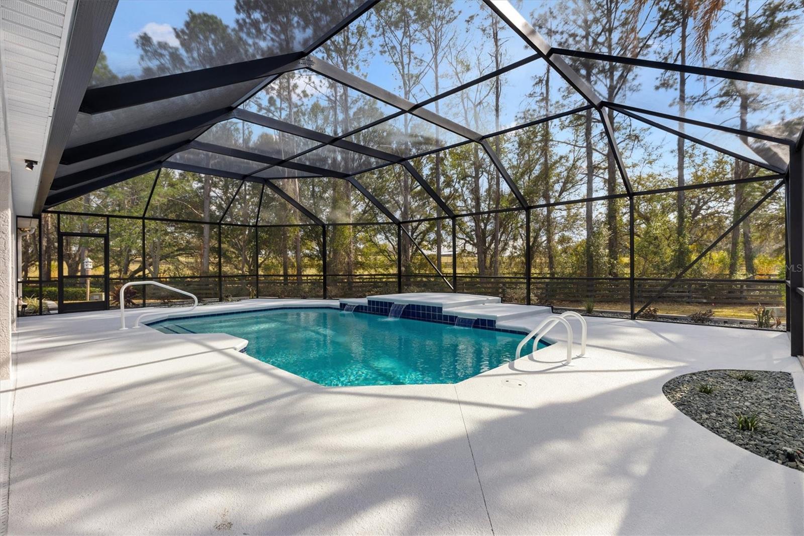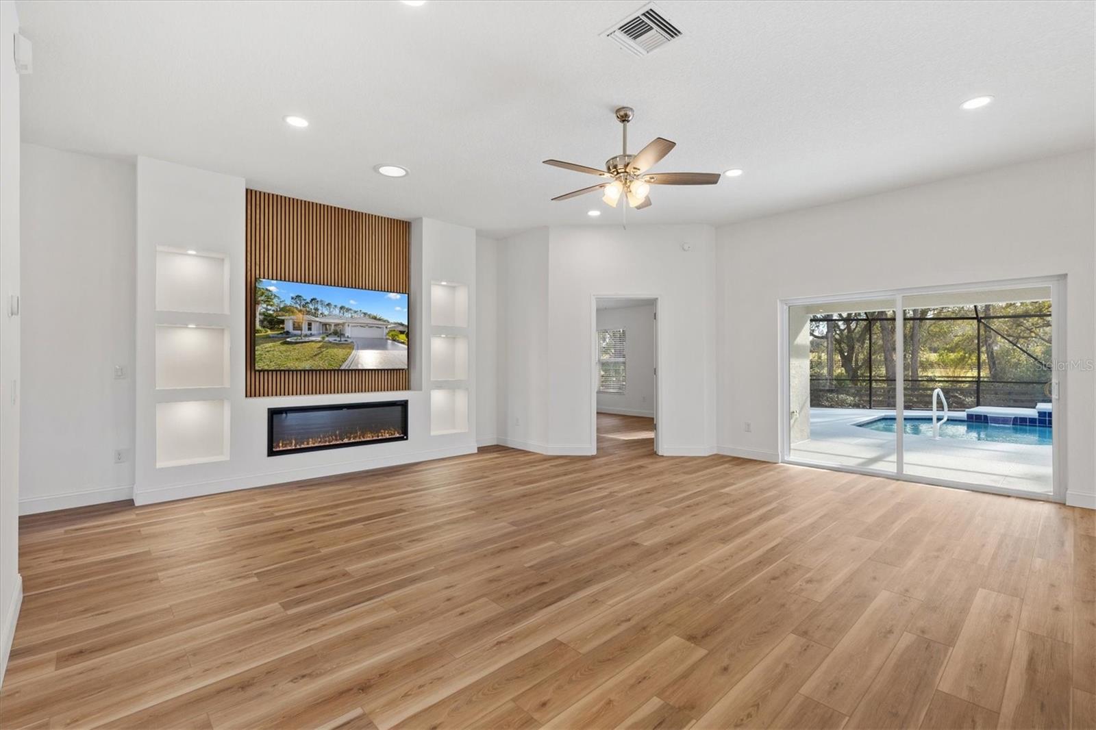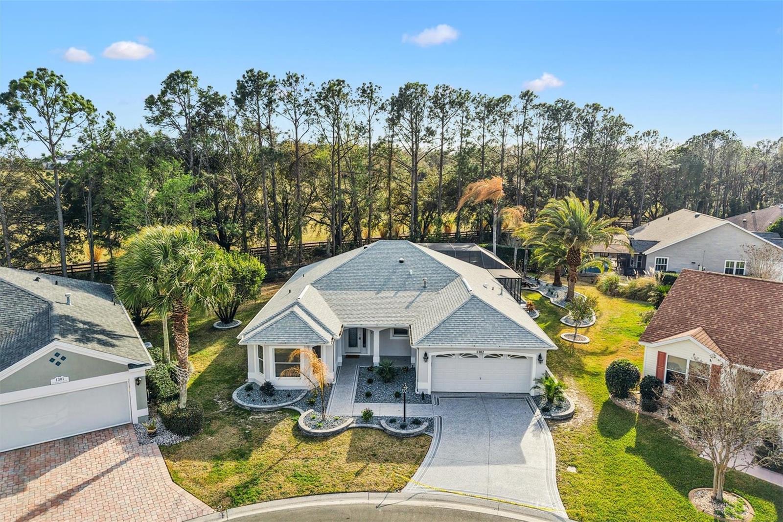 One or more photo(s) has been virtually staged. I am on a quiet cul-de-sac, and I’ve had a COMPLETE TRANSFORMATION, inside and out, and I honestly feel brand new, plus I come with NO BOND and a PRIVATE BACKYARD featuring a GORGEOUS RESURFACED POOL. Step through my LEADED GLASS FRONT ENTRY, and you’ll immediately notice the wide open feel. My LVP FLOORING runs seamlessly throughout, NO CARPET, NO PROJECTS, NO HONEY-DO LIST, and NO POPCORN CEILING. My kitchen was rebuilt from scratch with NEW CABINETS featuring SOFT-CLOSURE drawers and doors, upgraded QUARTZ COUNTERTOPS, and a full suite of brand new STAINLESS STEEL APPLIANCES. I’m ready for dinner parties, holiday gatherings, or just your morning coffee without a single update needed. Both bathrooms were completely renovated with a NEW SHOWER, NEW VANITIES, NEW TOILETS, and NEW LIGHT FIXTURES with LED lighting, clean, bright, and modern because everything is new. Don’t miss my CUSTOM ENTERTAINMENT CENTER, and yes, the TV and FIREPLACE STAY. Did you see my 5 1/4 inch BASEBOARDS? I’m not just pretty, I’m practical. My ROOF 2020, HWH 2021, and HVAC 2025. Translation: you get the upgrades without the surprise expenses. Now let’s go outside, because this is where I really show off. My POOL has been resurfaced and sparkles again, surrounded by a large BIRDCAGE so you can enjoy Florida living without the Florida bugs. The backyard opens to a peaceful PARK-LIKE SETTING with POLO GROUNDS behind me, which means NO REAR NEIGHBORS and real privacy. My PIE-SHAPED LOT gives you extra breathing room and the UPGRADED LANDSCAPING finishes the look. I even dressed up for you with FRESH EXTERIOR PAINT, a PAINTED DRIVEWAY, and an OVERSIZED 2 CAR GARAGE with EPOXY FLOORING that looks as clean as the inside of the home. I’m not a fixer-upper and not a someday project. I’m the home you move into and start living your Florida life right away. All I need now… is my next owner.