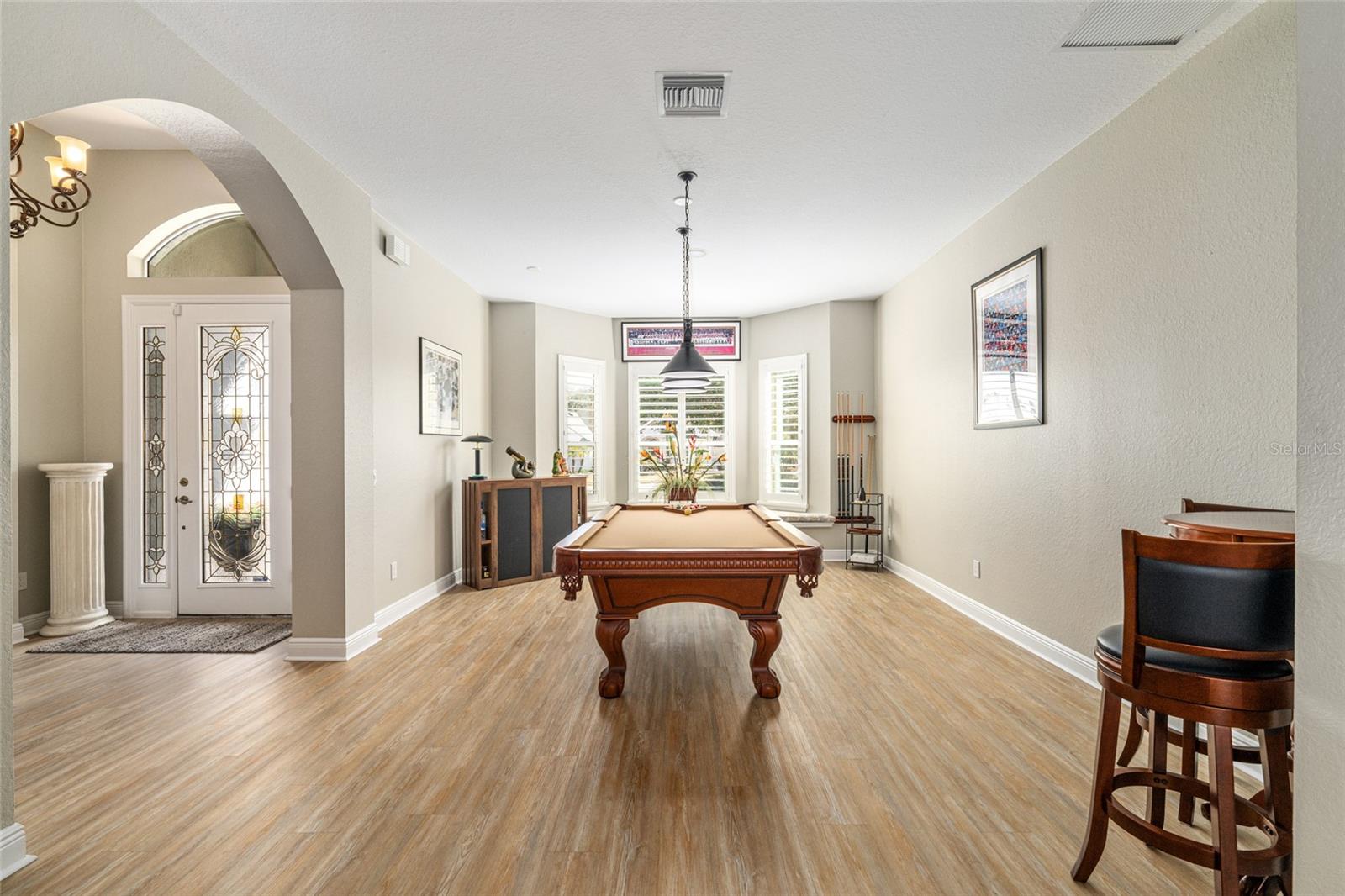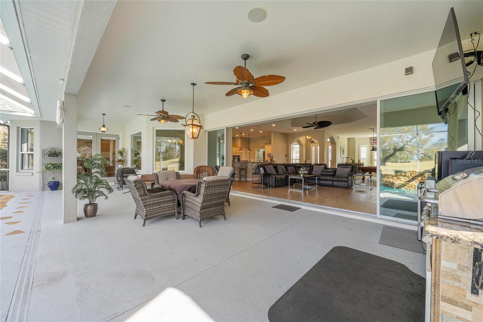 BOND PAID! Stunning Sanibel Premier with spectacular pool, spa, and summer kitchen overlooking the Championship Nancy Lopez Golf Course in the highly sought-after Village of Royal Oak at Springdale! Tucked away on a quiet cul-de-sac, this exceptional home offers outstanding curb appeal with a stamped driveway and walkway, upgraded landscaping, and elegant leaded glass front door with sidelights. Inside, you’ll find beautiful new vinyl planking flowing through the foyer, living and dining rooms, kitchen, laundry, hallways, and baths, with vinyl planking flooring in the guest bedrooms, and engineered wood flooring in the primary bedroom The spacious open kitchen is truly a showpiece featuring: • White bay stair-step cabinetry with crown molding • Granite countertops • New stainless appliances • Wall oven and gas cooktop • Pot drawers and pull-out pantry shelving • Separate ice maker • Under- and over-cabinet lighting • Center island with pendant lighting The casual dining area offers charming custom window seats and peaceful views of the pool. The living room opens seamlessly with stack-back sliding glass doors to your private outdoor oasis — a gorgeous heated pool and spa with stunning water feature, resurfaced in 2019, along with newer LED lighting, pool pump, and gas heater. The fully equipped summer kitchen and expansive birdcage enclosure make this the perfect space for entertaining while enjoying sweeping golf course views. Just outside the enclosure, a paved side patio with privacy hedge creates an additional serene retreat. The oversized primary suite features a tray ceiling, wall-mounted TV, and a luxurious en-suite bath with dual sinks, garden tub, Roman shower, private water closet, and a huge walk-in closet. Guest accommodations are equally impressive: • Front guest room with plantation shutters (featured across the front of the home) • Expanded second guest room with sliding glass doors to the pool and a queen-size Murphy bed • Guest bath with solar tube, tile-surround tub/shower, and new walk in shower. The laundry room includes built-in sink, additional cabinetry, newer washer and dryer, and open shelving. Car enthusiasts and hobbyists will appreciate the expanded 2-car garage plus golf cart garage with epoxy flooring, workbench, storage closet, and incredible overhead storage accessed by a 250-lb capacity electric freight elevator and electric attic stairs. Additional premium features include: • Surround sound in living area and lanai • HVAC with surge protection • Whole-house water filtration system and water softener. whole house Generac Generator. • Three solar attic fans • Lightning protection system • Hidden dog fence surrounding the property This is truly an exceptional, meticulously upgraded home in one of The Villages’ most desirable golf-front locations. And yes… THE BOND IS PAID! NEW ROOF 2022, 2 NEW HVAC SYSTEMS 2025 AED is here and shared by the neighbors in the cul de sac