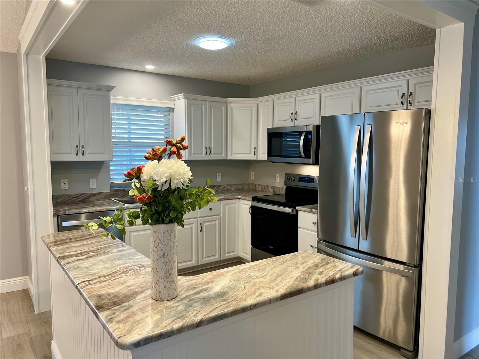 Discover this beautifully renovated Amarillo model, featuring 3 bedrooms, 2 baths, a Florida Room and a screened lanai - the perfect setting for morning coffee, a relaxing lunch or an evening drink with friends. Situated on a lovely lot on a peaceful road, this home offers privacy, tranquility, and scenic surroundings. Inside, you’ll find thoughtful, high-end upgrades throughout. Fresh paint, beautiful flooring (engineered hard wood and luxury vinyl tile) and elegant 5" base moldings enhance the living spaces; while soaring ceilings create an open, airy feel. The kitchen has been tastefully remodeled with timeless white cabinets, granite countertops and stainless-steel appliances, and both bathrooms have been fully updated, including beautiful showers that provide a clean, contemporary look. Other great features include a screened front porch, an interior laundry room and a full 2-car garage with epoxy-coated floor and a brand-new Carrier HVAC system in 2025. Living in this ideal location in the desirable Village of Rio Grande, you will be just a short golf cart ride from both Spanish Springs and Lake Sumter Landing, multiple golf courses, recreation centers, pools, shopping, dining, and entertainment — plus you will enjoy low Sumter County taxes and a fully paid BOND.