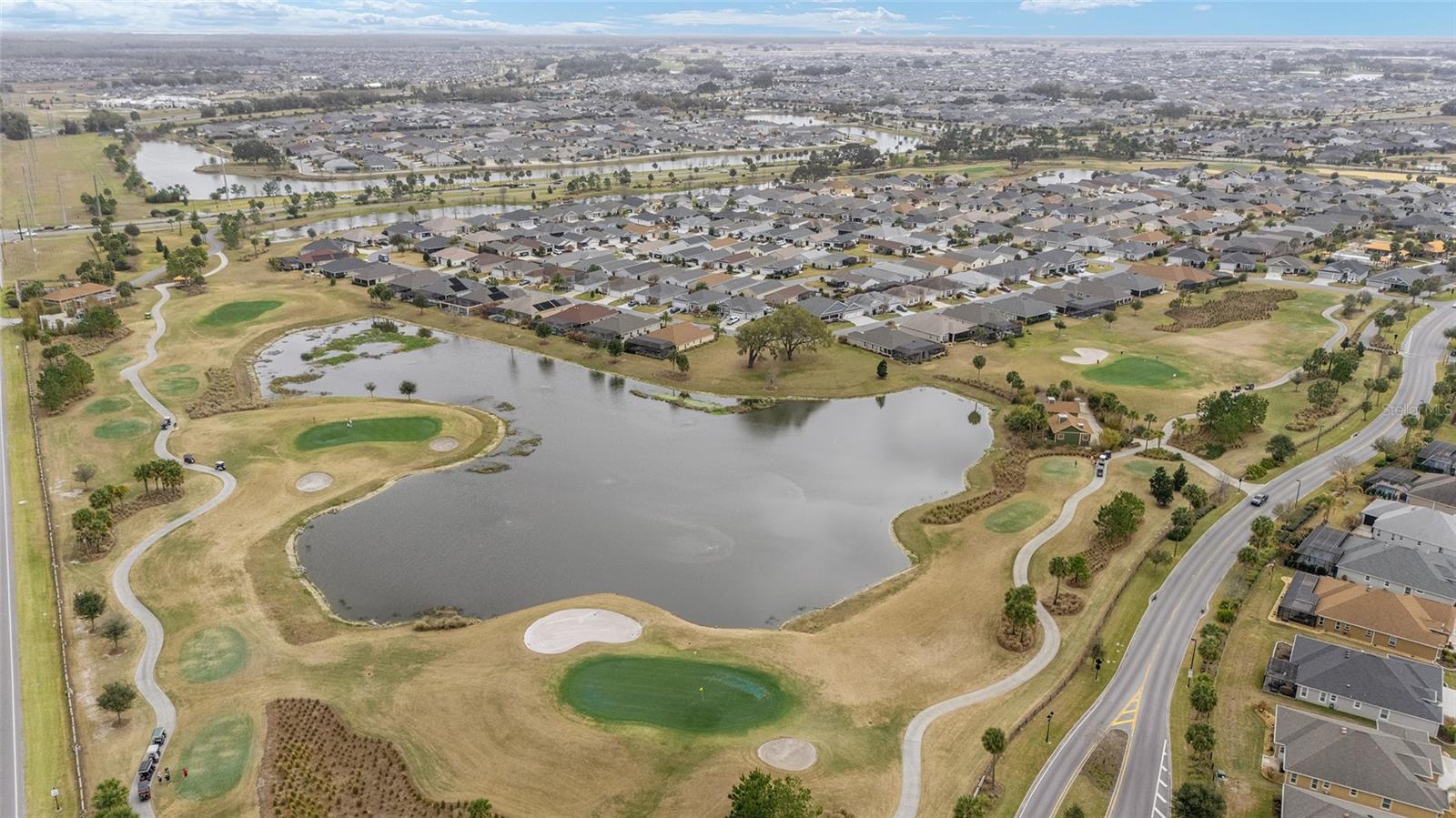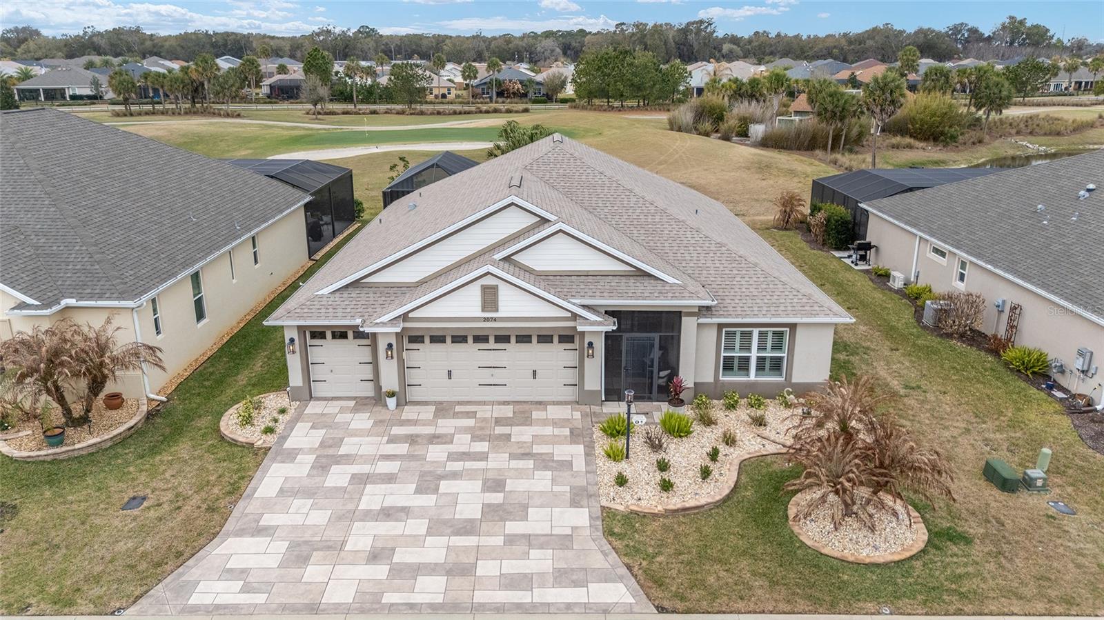 ~2019 ROOF/HVAC/HOT WATER HEATER~ ~HEATED SALTWATER POOL~ ~GOLF COURSE / WATER VIEW~ ~GOLF CART GARAGE~ Welcome to this exceptional LINDEN model in the desirable Village of MCCLURE, perfectly positioned on the 3rd green of the Loblolly Golf Course with stunning GOLF COURSE and WATER VIEWS. Surrounded by beautiful, mature landscaping and enhanced by a STAMPED CONCRETE DRIVEWAY, this home offers outstanding curb appeal and an unbeatable setting. Walk through the FRONT SCREENED-IN PORCH through a beautiful LEADED GLASS DOOR and step inside to a grand entry with HIGH VAULTED ceilings, CERAMIC tile flooring, and UPGRADED LIGHTING. The living room continues the open feel with CERAMIC tiles and an UPGRADED CEILING FAN, while the dining room features CERAMIC tiles, PLANTATION SHUTTERS and soaring 10’ ceilings—perfect for entertaining. The kitchen is beautifully appointed with GRANITE countertops, STAINLESS-STEEL appliances, TILE BACKSPLASH, CERAMIC tile flooring, a CLOSET PANTRY, and a center ISLAND designed for both functionality and style. The INSIDE LAUNDRY ROOM includes CERAMIC tile flooring, a utility sink, cabinetry, shelving, Whirlpool appliances, and a convenient BUILT-IN OFFICE AREA. The primary suite is a true retreat with plush carpeting, PLANTATION SHUTTERS, HIGH VAULTED ceilings, ceiling fan, and a CUSTOM OVERSIZED WALK-IN CLOSET. The luxurious ensuite bath offers a TILED ROMAN SHOWER, dual sinks, HIGH GRANITE countertops, a private commode area, and abundant cabinetry. 2 guest bedrooms provide comfortable accommodation, each featuring carpet, PLANTATION SHUTTERS, ceiling fans, and built-in closets. One guest room boasts a HIGH TRAY CEILING, adding architectural interest. The guest baths include CERAMIC tile, one with a tiled walk-in shower and HIGH GRANITE countertops, and the other with a tiled tub/shower combination, linen closet, and HIGH GRANITE countertops. Outdoor living shines with an L-SHAPED, SCREENED-IN LANAI featuring textured concrete flooring with blinds, 3 ceiling fans, and an outdoor grilling area surrounded with a lovely BRICK WALL. The lanai opens to a screened BIRDCAGE ENCLOSURE where you can enjoy the HEATED, SALTWATER POOL while taking in the breathtaking GOLF COURSE and WATER VIEWS. Additional exterior upgrades include new SOLAR LIGHTING for enhanced ambiance. The spacious 2-car plus GOLF CART GARAGE features EPOXY FLOORING, a workbench, and attic stairs for added storage. There is a SECO SURGE PROTECTOR on the meter, termite & pest protection for peace of mind. Furniture and artwork can be available separately. This remarkable home combines luxury, functionality, and spectacular views in one of The Villages’ premier locations. Minutes from Magnolia Plaza with shopping and dining. Close to the Willow Tree Rec Center and the Everglades Rec Center. This home is centered between Fenney, Sawgrass, Eastport and Brownwood, making everything a golf cart ride away!