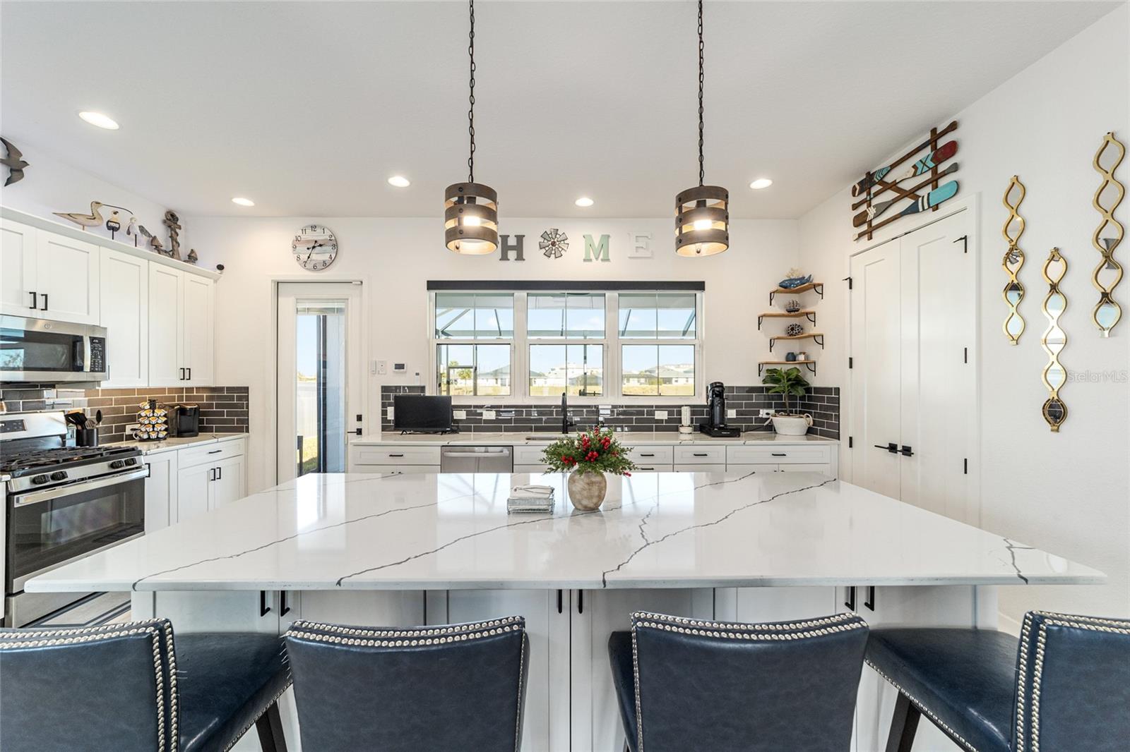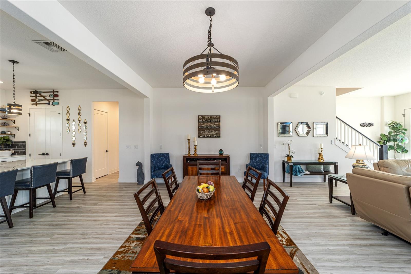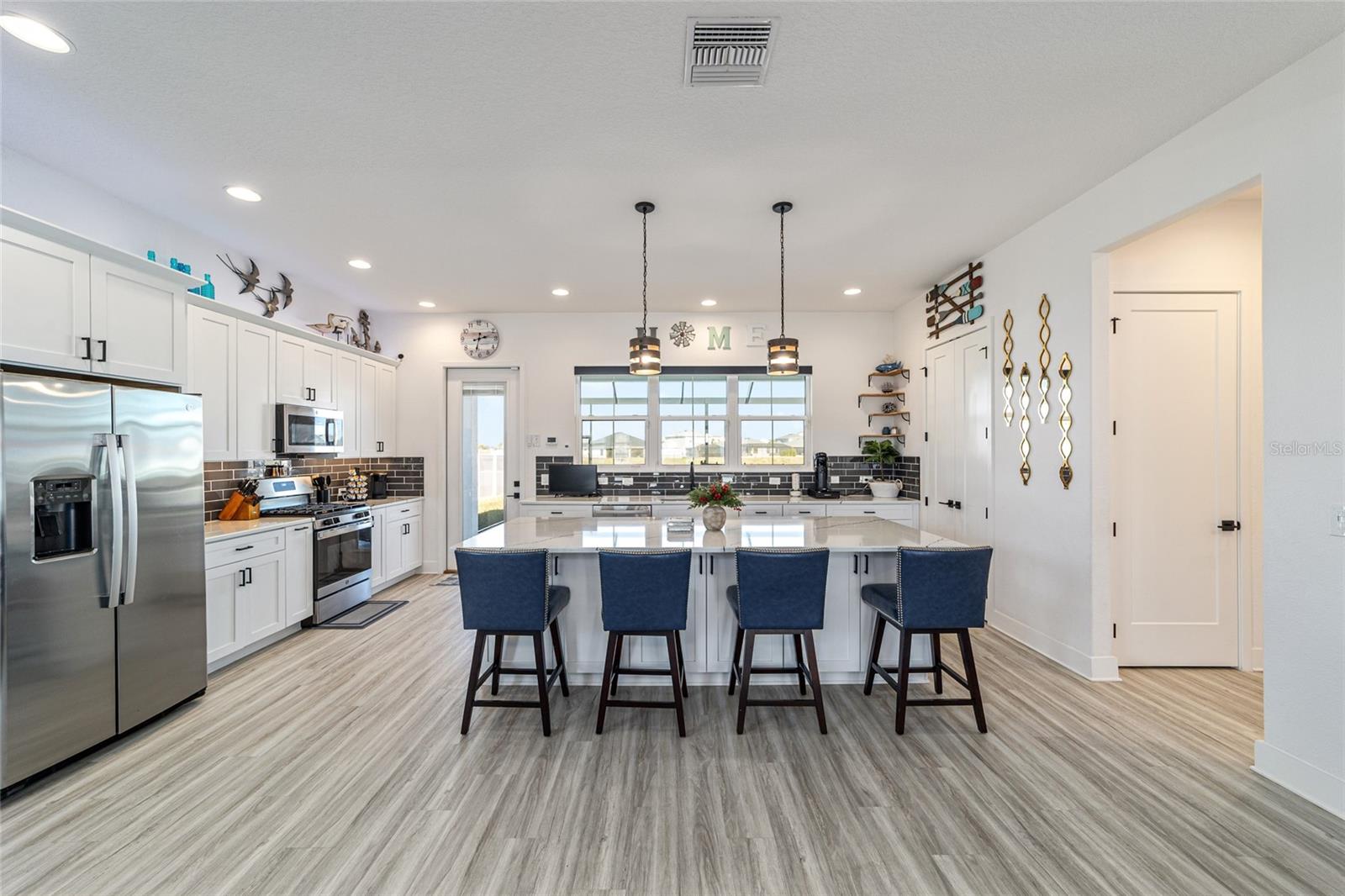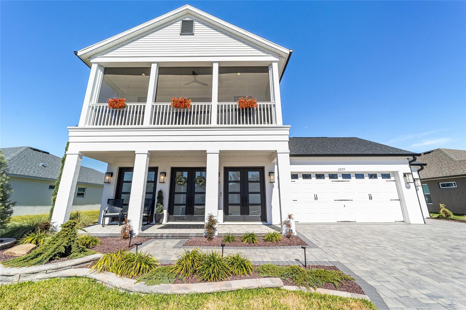~2023 ROOF/HVAC/HOT WATER HEATER~ ~HEATED SALTWATER POOL~ ~GOLF CART GARAGE~ ~WATER VIEW~ ~10’ CEILINGS~ Welcome to this stunning Double Play model in the Village of MIDDLETON in The Villages—an exceptional 2-story POOL home offering WATER VIEWS, upscale finishes, and impressive upgrades throughout. Situated on beautifully landscaped grounds with BRICK PAVER DRIVEWAY and WALKWAYS, this home delivers outstanding curb appeal and resort-style living. Ten-foot ceilings throughout the home enhance the open, airy feel, while LUXURY PLANK FLOORING spans the entire living space except for the 2 upstairs baths. The living room showcases UPGRADED LIGHTING, ceiling fan, and custom 3-way ELECTRIC FIRELPLACE with striking TV entertainment wall featuring decorative backsplash and recessed lighting. The dining room also features upgraded lighting, creating an elegant space for gatherings. The gourmet kitchen is beautifully appointed with UPGRADED CABINETRY, QUARTZ countertops, STAINLESS-STEEL appliances, TILE BACKSPLASH, and a large CENTER ISLAND—perfect for cooking and entertaining. Conveniently located on the main floor, the primary suite offers high ceilings, ceiling fan, FITTED WINDOW SHADES, CUSTOM CLOSET SHELVING in a walk-in closet. The luxurious ensuite bath features LVP, a TILED WALK-IN SHOWER, private commode area, UPGRADED CABINETRY, and QUARTZ countertops. Upstairs are 4 bedrooms, each pair connected by a JACK & JILL BATH providing flexibility for family and visitors. Every bedroom includes high ceilings, a ceiling fan, LVP flooring and built-in closet. Baths sport ceramic tile floors, QUARTZ countertops, and UPGRADED CABINETRY. One bath offers tiled tub/shower combination while the other has a tiled walk-in shower. The front bedroom, currently used as an office, opens to a screened balcony and houses a MURPHY BED. Additional interior highlights include a main-floor HALF BATH with upgraded finishes, an INSIDE LAUNDRY ROOM with luxury utility sink, custom frosted glass FRENCH DOORS, motion-sensor stairway lighting with a carpet runner, ELECTRIC WINDOW SHADE controls, a RETRACTABLE SCREEN on the balcony, air purification systems, Air Masters in both AC units, and an Eaton whole-house SURGE PROTECTOR. Outdoor living is equally impressive. SCREEN BIRDCAGE LANAI featuring an AWNING over a portion of the space and a sparkling 15-x 30 HEATED SALTWATER POOL with safety gate. The backyard is enhanced by custom landscaping, whole-house GUTTERS, irrigation flow filter, RainSoft water softening system, reverse osmosis water system, and fruit trees including mango and lime. spacious 2-car garage plus GOLF CART GARAGE features an insulated door, attic stairs, and 2 SOLAR ATTIC FANS for added efficiency. From second floor, there is another access to attic space. This extraordinary home combines space, luxury, and thoughtful upgrades in one of The Villages’ newest FAMILY communities. Don’t miss the opportunity to experience exceptional Florida living at its finest! You're near The Villages schools, Shallow Creek and Woodlands Championship Golf Courses. Eastport with live entertainment, shopping and restaurants is very convenient!