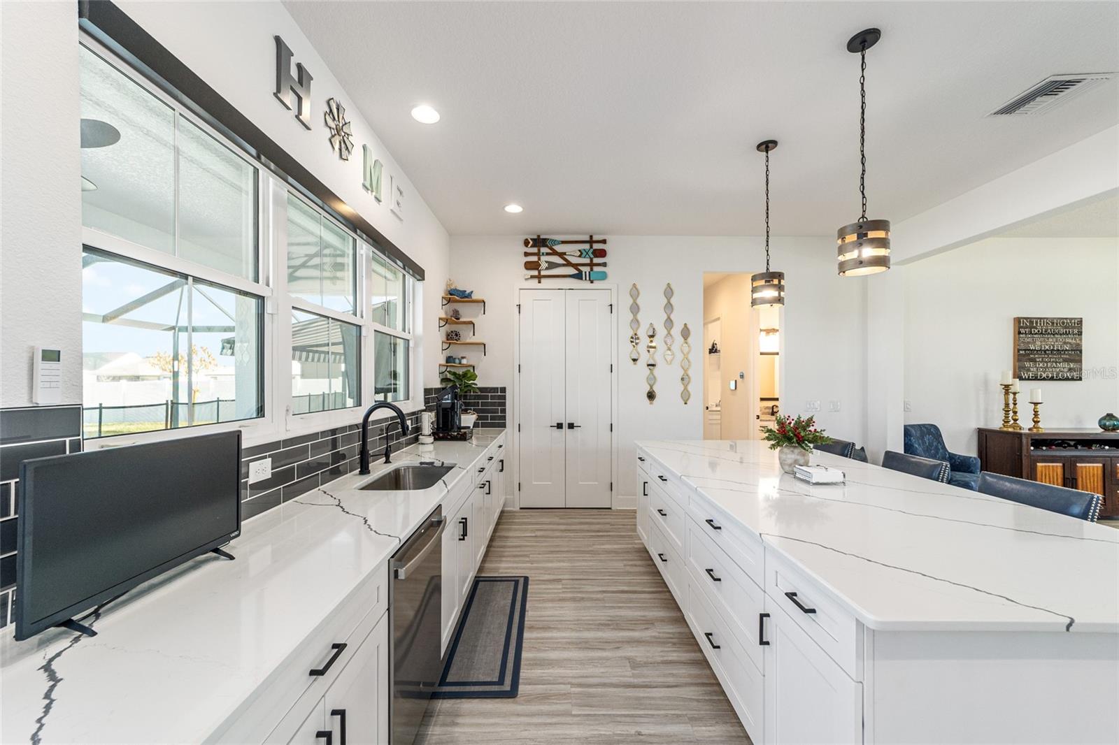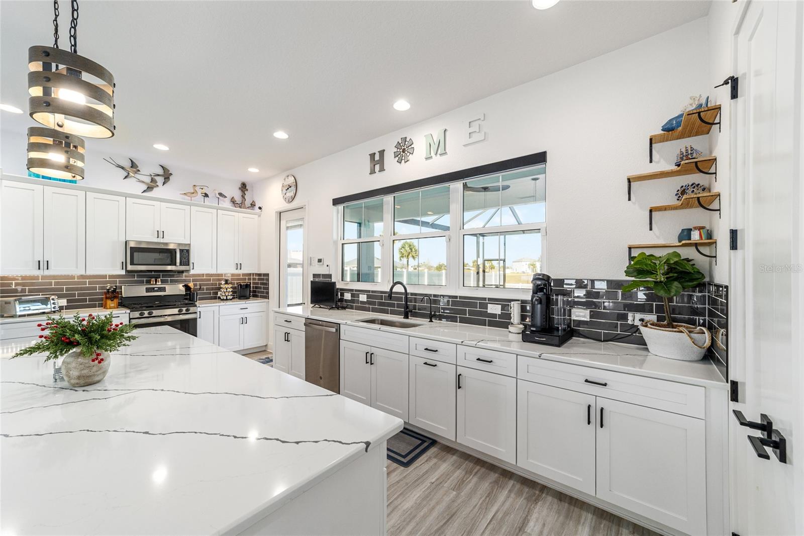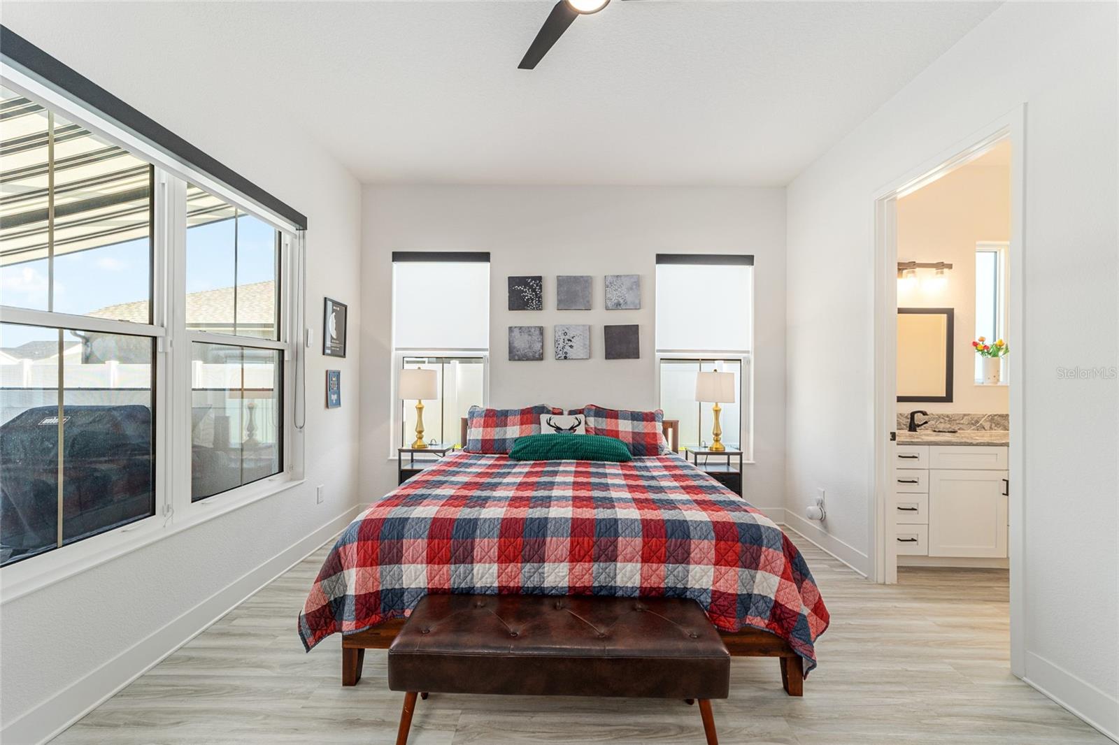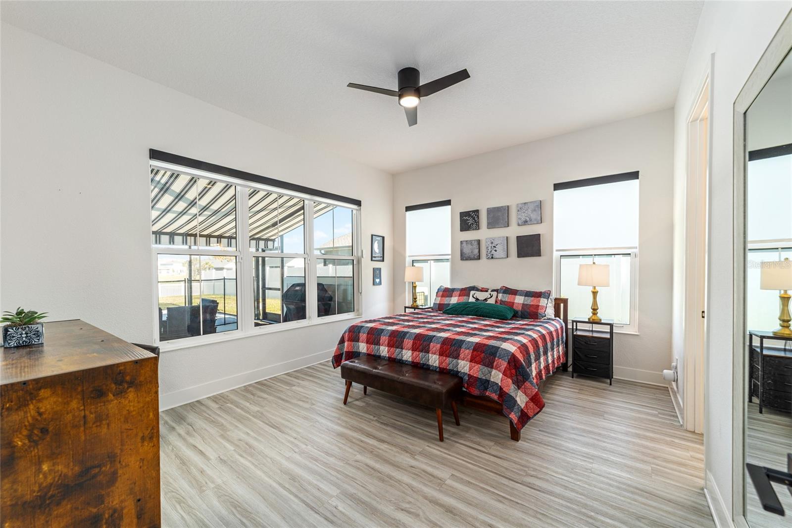 ~2023 ROOF/HVAC/HOT WATER HEATER~ ~HEATED SALTWATER POOL~ ~GOLF CART GARAGE~ ~WATER VIEW~ ~10’ CEILINGS~ Welcome to this stunning Double Play model in the Village of MIDDLETON in The Villages—an exceptional 2-story POOL home offering WATER VIEWS, upscale finishes, and impressive upgrades throughout. Situated on beautifully landscaped grounds with BRICK PAVER DRIVEWAY and WALKWAYS, this home delivers outstanding curb appeal and resort-style living. Ten-foot ceilings throughout the home enhance the open, airy feel, while LUXURY PLANK FLOORING spans the entire living space except for the 2 upstairs baths. The living room showcases UPGRADED LIGHTING, ceiling fan, and custom 3-way ELECTRIC FIRELPLACE with striking TV entertainment wall featuring decorative backsplash and recessed lighting. The dining room also features upgraded lighting, creating an elegant space for gatherings. The gourmet kitchen is beautifully appointed with UPGRADED CABINETRY, QUARTZ countertops, STAINLESS-STEEL appliances, TILE BACKSPLASH, and a large CENTER ISLAND—perfect for cooking and entertaining. Conveniently located on the main floor, the primary suite offers high ceilings, ceiling fan, FITTED WINDOW SHADES, CUSTOM CLOSET SHELVING in a walk-in closet. The luxurious ensuite bath features LVP, a TILED WALK-IN SHOWER, private commode area, UPGRADED CABINETRY, and QUARTZ countertops. Upstairs are 4 bedrooms, each pair connected by a JACK & JILL BATH providing flexibility for family and visitors. Every bedroom includes high ceilings, a ceiling fan, LVP flooring and built-in closet. Baths sport ceramic tile floors, QUARTZ countertops, and UPGRADED CABINETRY. One bath offers tiled tub/shower combination while the other has a tiled walk-in shower. The front bedroom, currently used as an office, opens to a screened balcony and houses a MURPHY BED. Additional interior highlights include a main-floor HALF BATH with upgraded finishes, an INSIDE LAUNDRY ROOM with luxury utility sink, custom frosted glass FRENCH DOORS, motion-sensor stairway lighting with a carpet runner, ELECTRIC WINDOW SHADE controls, a RETRACTABLE SCREEN on the balcony, air purification systems, Air Masters in both AC units, and an Eaton whole-house SURGE PROTECTOR. Outdoor living is equally impressive. SCREEN BIRDCAGE LANAI featuring an AWNING over a portion of the space and a sparkling 15-x 30 HEATED SALTWATER POOL with safety gate. The backyard is enhanced by custom landscaping, whole-house GUTTERS, irrigation flow filter, RainSoft water softening system, reverse osmosis water system, and fruit trees including mango and lime. spacious 2-car garage plus GOLF CART GARAGE features an insulated door, attic stairs, and 2 SOLAR ATTIC FANS for added efficiency. From second floor, there is another access to attic space. This extraordinary home combines space, luxury, and thoughtful upgrades in one of The Villages’ newest FAMILY communities. Don’t miss the opportunity to experience exceptional Florida living at its finest! You're near The Villages schools, Shallow Creek and Woodlands Championship Golf Courses. Eastport with live entertainment, shopping and restaurants is very convenient!