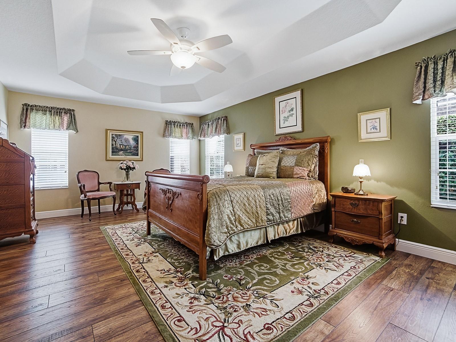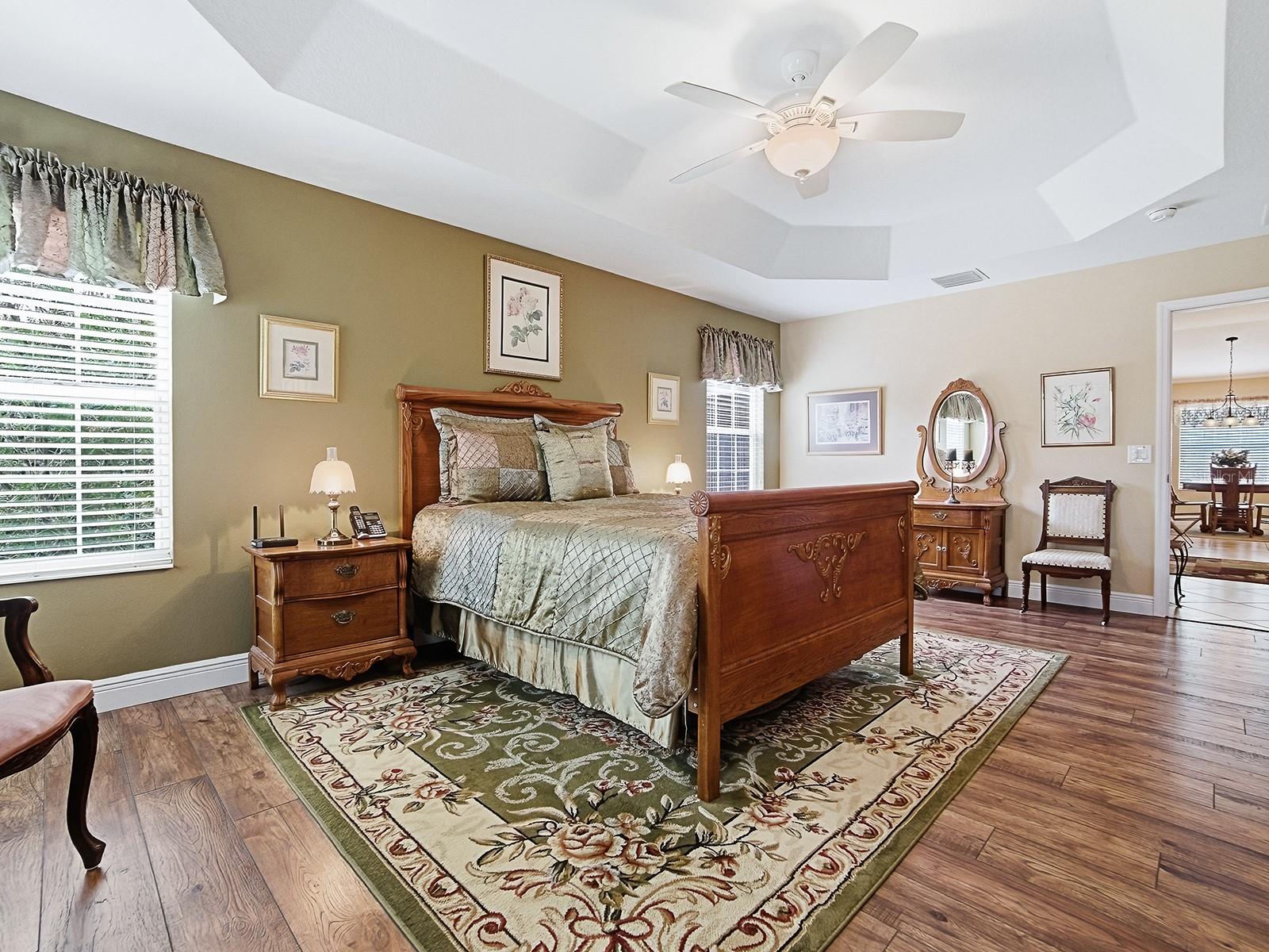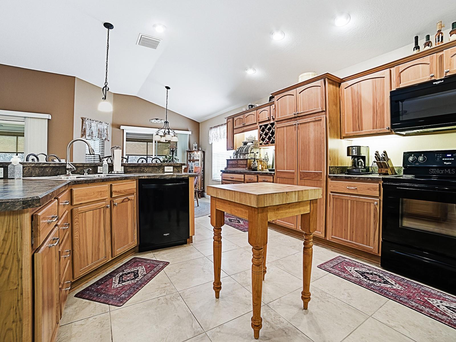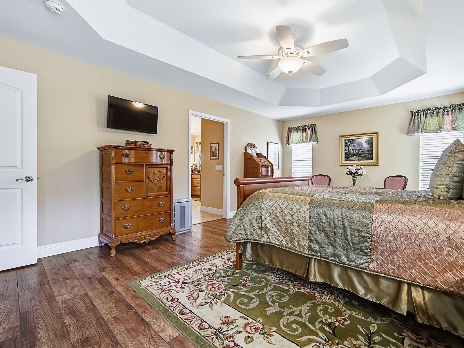 Welcome to this stunning BOND PAID Designer Lilac model home, perfectly situated in the Village of Gilchrist, a vibrant community in The Villages. Located just south of 466A, this central hub offers easy access to everything you need, from golf courses and restaurants to medical facilities and more. As you approach the home, you'll be impressed by the custom rock landscaping, which adds a touch of elegance and sophistication to the exterior. The entry foyer, complete with a coat closet, provides a formal entrance that sets the tone for the rest of the home. The front door, flanked by two sidelights, allows for added natural light. Inside, the home has been expertly expanded 2ft in all bedrooms (larger closets due to this) & primary bathroom create a spacious and airy feel throughout. The kitchen features Hickory cabinets, recessed lighting, distinct pendant lights, additional cabinetry, soft close hardware, a built-in wine rack & coffee bar addition, and large eat-at counter that's perfect for casual dining. The adjacent breakfast nook and formal dining room offer additional spaces for enjoying meals with family and friends. Remote controlled surround sound really pulls together your entertaining capabilities with all of this wonderful space or to settle in on the couch for your favorite movie. The guest quarters, located near the front of the house, feature a private pocket door and a shared bathroom, providing a comfortable and convenient space for visitors. The primary bedroom, situated towards the back of the house, is a serene retreat with a large walk-in closet and an en-suite bathroom featuring a double vanity, ample storage, and a walk-in Roman shower with wave-block privacy. The ease of no carpet can be appreciated with tile flooring throughout the main living areas, and scraped wood look luxury vinyl plank flooring in the office, spare bedroom & primary suite. The 5 and 1/4 inch baseboards tastefully separate the lovely flooring & neutral colored walls, while the tray ceilings in the office and primary bedroom create a sense of height and grandeur. The also expanded enclosed lanai, complete with custom privacy screens, a mini-split for heat and air conditioning, and paver stone flooring, is the perfect spot to relax and enjoy the setting of the outdoors in climate controlled comfort or simply open the windows for fresh air, and the private rear pavered grill area offers a secluded spot for grilling and enjoying quality time with loved ones. Enjoy ample parking and storage space with a spacious two-car garage, thoughtfully expanded to accommodate your golf cart with a dedicated golf cart garage edition. Plus, take advantage of additional storage areas & work bench to keep your belongings organized and within reach. A water filter is attached to the main line in the garage to get the water just how you like it throughout the house. A big ticket item of a 2024 HVAC system provides immediate savings & efficiency. The village of Gilchrist is surrounded by a wealth of recreational opportunities, including golf courses, clubs, and other activities, making it the perfect place to stay active, social, and connected. Be sure to come see this fabulous home today :-)