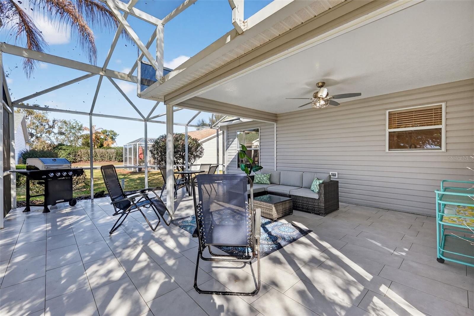 ***NEW ROOF COMING*** GORGEOUS 3/2 EXPANDED Amarillo with SPACIOUS UNDER-AIR BONUS ROOM and GORGEOUS LANAI and BIRDCAGE - strategically situated for PRIVACY and conveniently located in the heart of The Villages - close to Lake Sumter Landing and Spanish Springs Town Square in the highly sought after Village of Belle Aire! BOND PAID! As you approach this BEAUTIFULLY MAINTAINED home, you’ll be greeted by DECORATIVELY PAINTED drive and walk ways, CURBED and STONED landscaping beds, and a CHARMING SCREENED front porch. Step inside to discover the SPECTACULAR OPEN CONCEPT layout and HIGH VAULTED ceilings of the living, dining and kitchen areas. RICH, WARM-TONED LAMINATE floors grace the bedrooms and main living areas while THREE SOLAR TUBES flood the home with NATURAL LIGHT. The AMAZING kitchen boasts TILE floors, ALABASTER cabinetry, NEUTRAL countertops, Samsung Bespoke WHITE GLASS appliances—including a sleek Bespoke induction cooktop that cleans easily with just a quick wipe of a paper towel, TILE backsplash, built-in PANTRY, and a generous U-Shaped CENTER ISLAND with COUNTER HEIGHT EAT-IN area - perfect for entertaining. Just off the dining room, discover a FABULOUS, MULTIFUNCTIONAL, UNDER-AIR, FLORIDA ROOM with LAMINATE flooring and an ABUNDANCE of windows. This VERSATILE BONUS ROOM offers the ideal space for a den, media room, or home office. Step through an exterior French door into the EXPANSIVE 25’x20’ LANAI and EXTENDED BIRDCAGE featuring NEW TILE floors. This FABULOUS OUTDOOR SPACE is strategically situated for PRIVACY with gorgeous mature live oak making it ideal for ENTERTAINING friends and family or simply ENJOYING the beautiful Florida weather! Back inside, the primary bedroom offers a LARGE WALK-IN closet and LAMINATE floors. It’s EN-SUITE bathroom boasts an ALABASTER cabinetry with MAKE-UP vanity, WALK-IN shower, TILE floors, and a LINEN closet. Designed for privacy, the SPLIT FLOOR PLAN creates a SEPARATE GUEST WING with two additional bedrooms, each featuring built-in closets and LAMINATE floors. The second bathroom is thoughtfully appointed with an ALABASTER vanity, TILE flooring, tub and shower combination with GLASS DOORS, LINEN closet, and an additional hallway LINEN closet for added storage. Providing both functionality and convenience, an INTERIOR LAUNDRY room boasts WHITE CABINETRY, built-in PANTRY/STORAGE cabinet, and a UTILITY SINK. Completing the package is a two-car garage with attic access stairs and shelving. DON’T MISS YOUR OPPORTUNITY to make this INCREDIBLE HOME YOUR OWN! The village of Belle Aire is conveniently located between Spanish Springs Town Square and Lake Sumter Landing; Close to Glenview and Nancy Lopez Country Clubs and Championship Golf Courses; Savannah Center Performing Arts Theater and Recreation Complex; El Santiago and El Diablo Executive Golf Courses; multiple pools, golf, and pickle ball; and both County Road 466 and Highway 441/27 with an abundance of shopping, dining, banking, medical, and more! PLEASE WATCH OUR WALKTHROUGH VIDEO of this FABULOUS HOME in an IDEAL LOCATION and CALL TODAY to schedule your Private Showing or Virtual Tour!