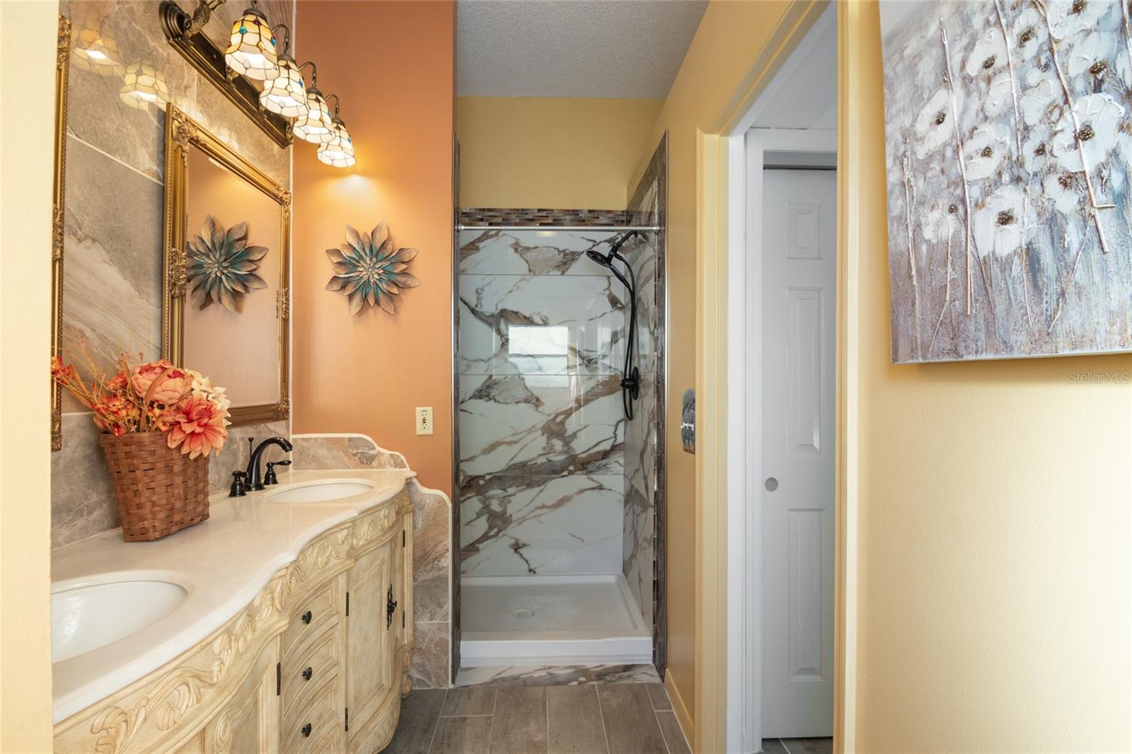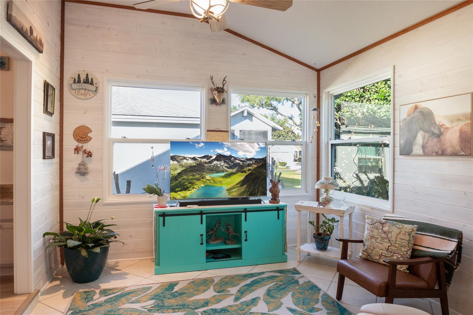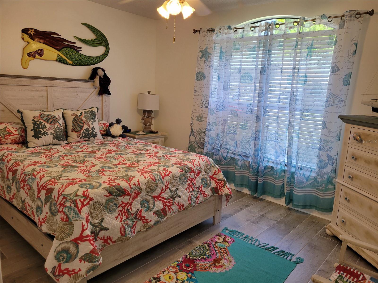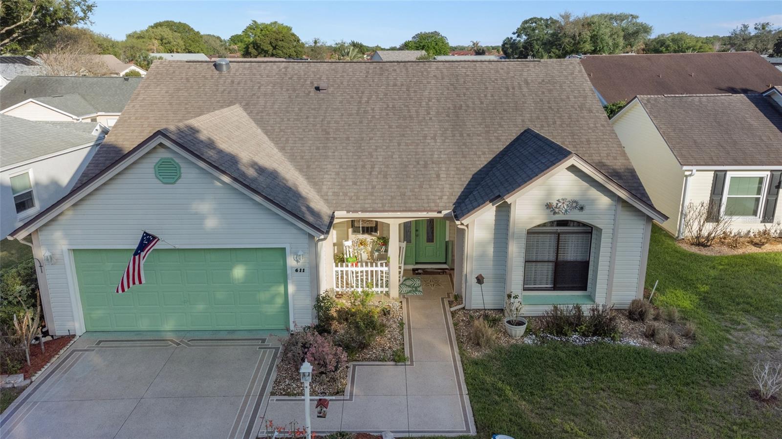 MUST SEE spacious, updated home near Spanish Springs and Lake Sumter Landing in The Villages, Florida. BOND PAID * NEW FLOORS * NEW AC * NEW HOT WATER HEATER * NEW WASHER * NEW DRYER * NEW DISHWASHER * NEW MICROWAVE *NEW PAINT. Enjoy your morning coffee on the covered front porch. Enter into your bright, large 20' x 27' entertaining area (living and dining room combination), perfect for family holidays or neighborhood gatherings. The functional kitchen has painted cabinets and granite counter tops. Cozy Florida room has new windows. The primary suite is 13' x 22' and spacious enough for a king size bed, night stands, and a seating area. Two walk in closets provide ample storage. One has been repurposed as an office space. This is a MUST SEE as it is unique and fun. The primary bathroom has been recently remodeled to include a tiled shower with seat, spectacular 2 sink cabinet, separate water closet. The guest bedroom is 13' x 11' with a large closet. This home is MOVE IN READY. FURNITURE AND GOLF CAR are available separately. Buy it all, move in and begin living your Florida dream!