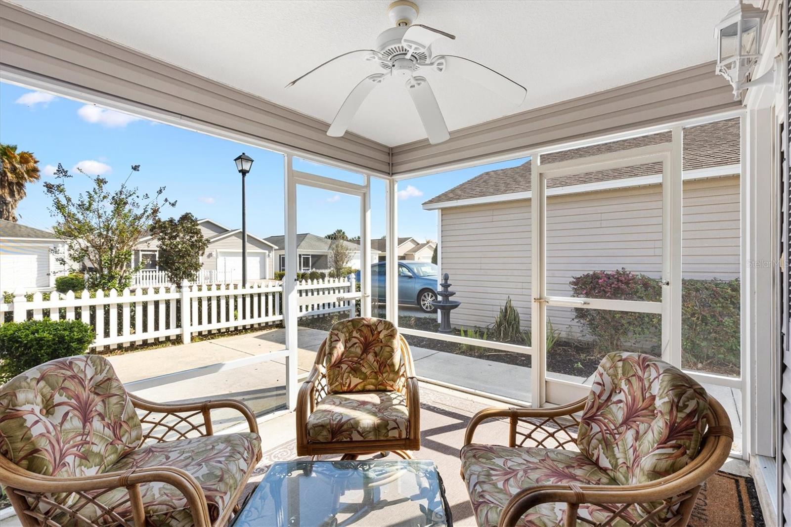 Beautifully maintained 2/2 Colony Patio Villa—NO BOND! Thoughtfully updated and move-in ready, this home offers both comfort and peace of mind with a new roof (2026), hot water heater (2023), and HVAC (2019). Close to Fish Hawk Recreation Center, Redfish Run and Tarpon Boil Executive Golf Courses, Cane Garden Country Club is just 5 minutes away for fine dining and 3 championship golf courses. You’ll be perfectly located between Lake Sumter Landing and Brownwood Paddock Square for dining, entertainment, and shopping. The front-facing screened lanai invites you to relax while the expansive outdoor patio is ideal for dining and grilling, making it a perfect space for entertaining friends and family. Inside, you’ll find an inviting open layout featuring luxury vinyl plank flooring in the main living and wet areas, knockdown ceilings, and new carpet in both bedrooms. The updated eat-in kitchen boasts newer stainless-steel appliances, including a stove and refrigerator, along with elegant quartz countertops and convenient pull-out cabinet shelves. The breakfast bar and large under-counter farm sink add functionality, while the pantry closet ensures ample storage for all your culinary needs. The primary suite offers a comfortable retreat with a walk-in closet and an ensuite bath featuring a walk-in shower (no tub). The guest bedroom is perfect for visitors or a home office. Additional features include a garage with laundry area, utility sink, workbench and attic stair kit, providing extra functionality and storage. This home checks all the boxes—updates, style, and location—making it the perfect place to start living the Villages lifestyle. Watch our Video and call to make your appointment to see this home today!