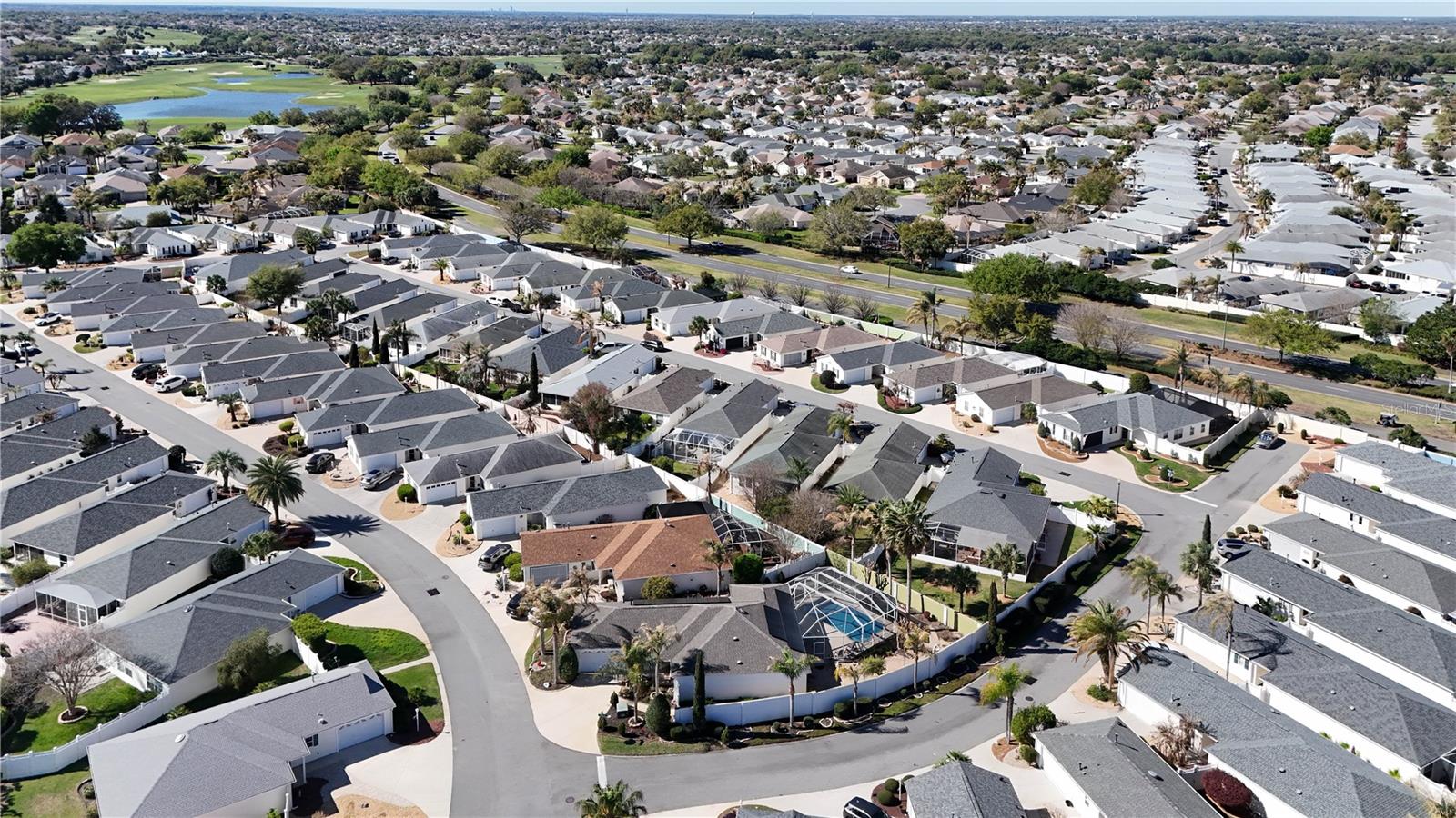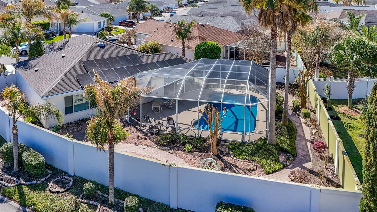 Careful… this one is loaded. Welcome to your very own Margaritaville—a truly one-of-a-kind courtyard villa ideally located in the highly sought-after Village of Caroline, just across from Lake Sumter Landing. This stunning 3-bedroom, 2-bath pool home offers the ultimate Florida lifestyle, featuring a full-size heated saltwater pool, spacious pool deck, awning, and an in-wall privacy fence that creates a serene, resort-style retreat. Situated on an oversized corner lot, the property includes two private courtyard gates and beautifully designed paver walkways that wrap around the pool enclosure for seamless access and flow. The backyard is a tropical oasis, with lush landscaping, a stone waterfall feature, and a side patio with awning—perfect for entertaining. A natural gas-connected barbecue grill adds convenience for outdoor gatherings. Inside, the Margaritaville-inspired décor creates a relaxed, inviting atmosphere from the moment you enter through the elegant leaded glass front door. A charming stone waterfall greets you at the entry, setting the tone for the unique character found throughout the home. The thoughtfully designed floor plan offers privacy for guests, with two bedrooms and a full bath located at the front of the home. The spacious kitchen is a standout, featuring custom wood cabinetry with slide-outs, gorgeous granite countertops, a center island, convection microwave, electric oven, composite double sink. The dining area flows seamlessly from the kitchen and opens to the lanai with sliders showcasing peaceful pool and garden views. The great room boasts vaulted ceilings, crown molding, and large sliders plus a picture window overlooking the pool, creating a bright and airy living space. The primary suite is a true retreat with its own picture window overlooking the tropical landscape and pool. The En Suite bath features dual sinks granite vanity and a large custom walk-in closet. Recent updates and features include: Roof (2023) Solar package with Generac power system 3-ton A/C (2017) Pella windows (2013) Pool resurfaced with Eco Finish (March 2026) New sprinkler system (2025) Gas pool heater (approx. 2 years old) Tankless water heater Lightning rods Central vacuum system DIRECTV satellite The garage is equally impressive with Chattahoochee flooring, built-in storage closets, and Generac system components. This exceptional property combines luxury, privacy, and tropical charm in one unforgettable package. Whether you’re entertaining guests or enjoying a quiet evening by the pool, this home delivers the perfect blend of comfort and island-inspired living.