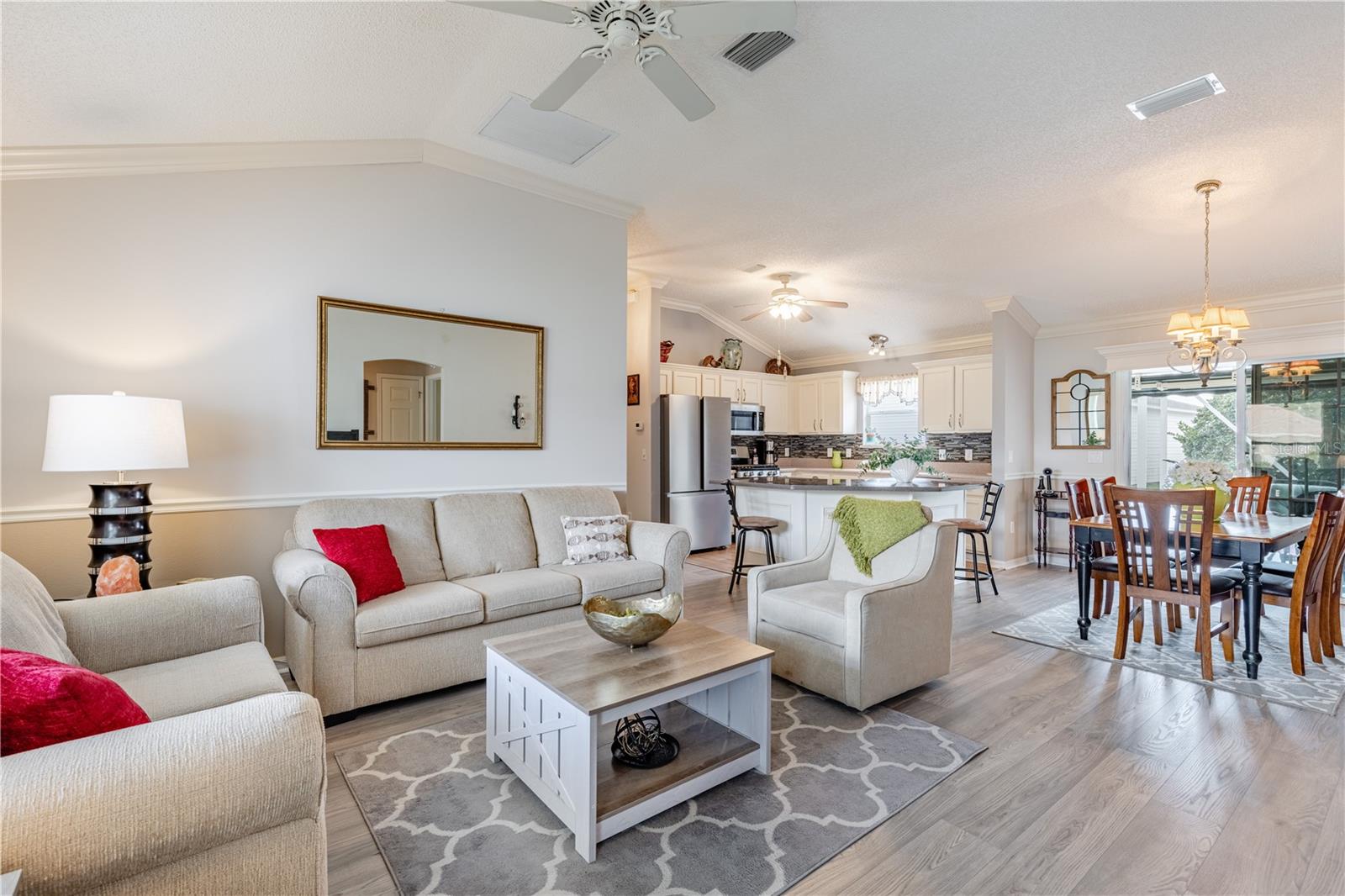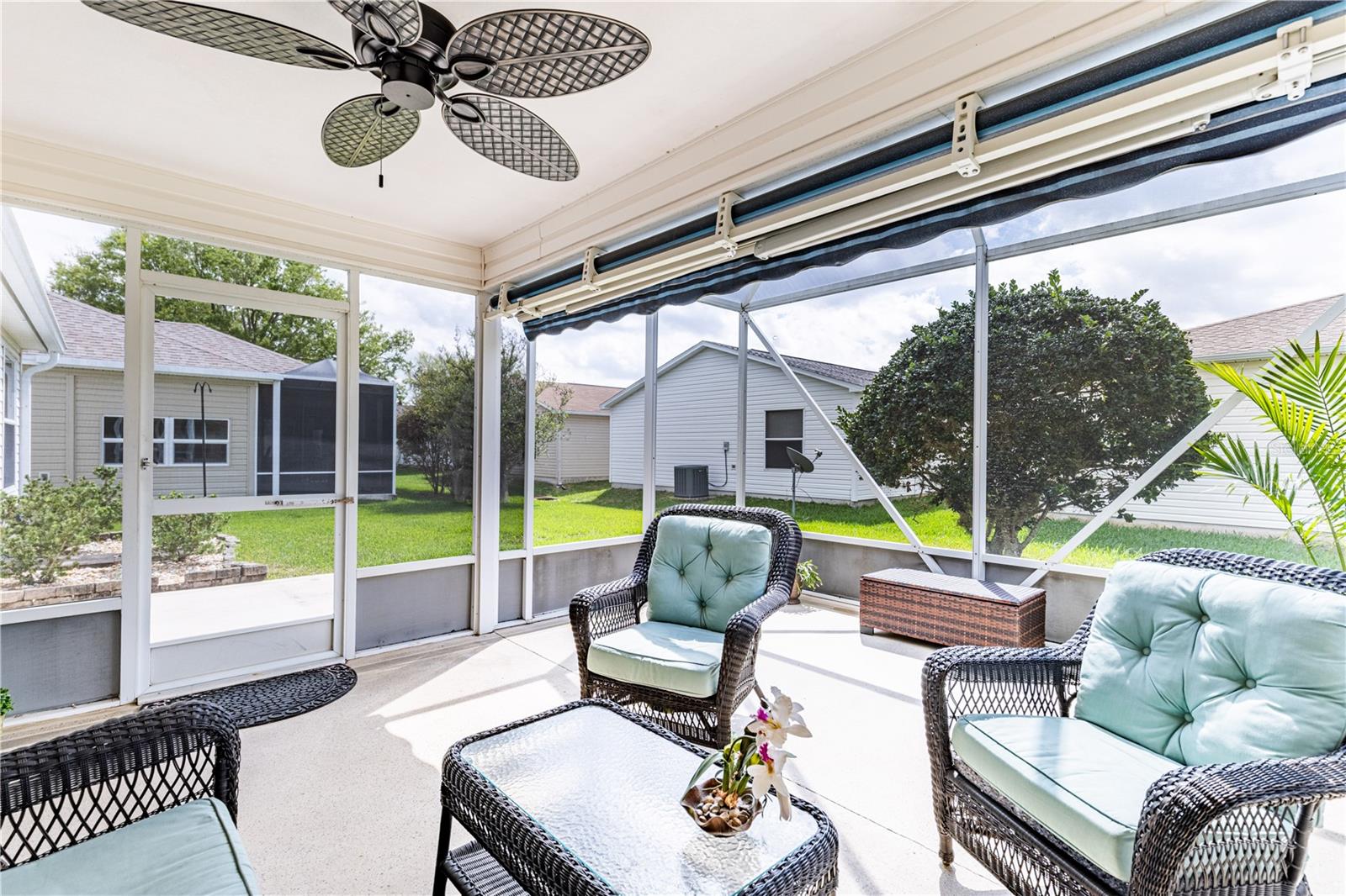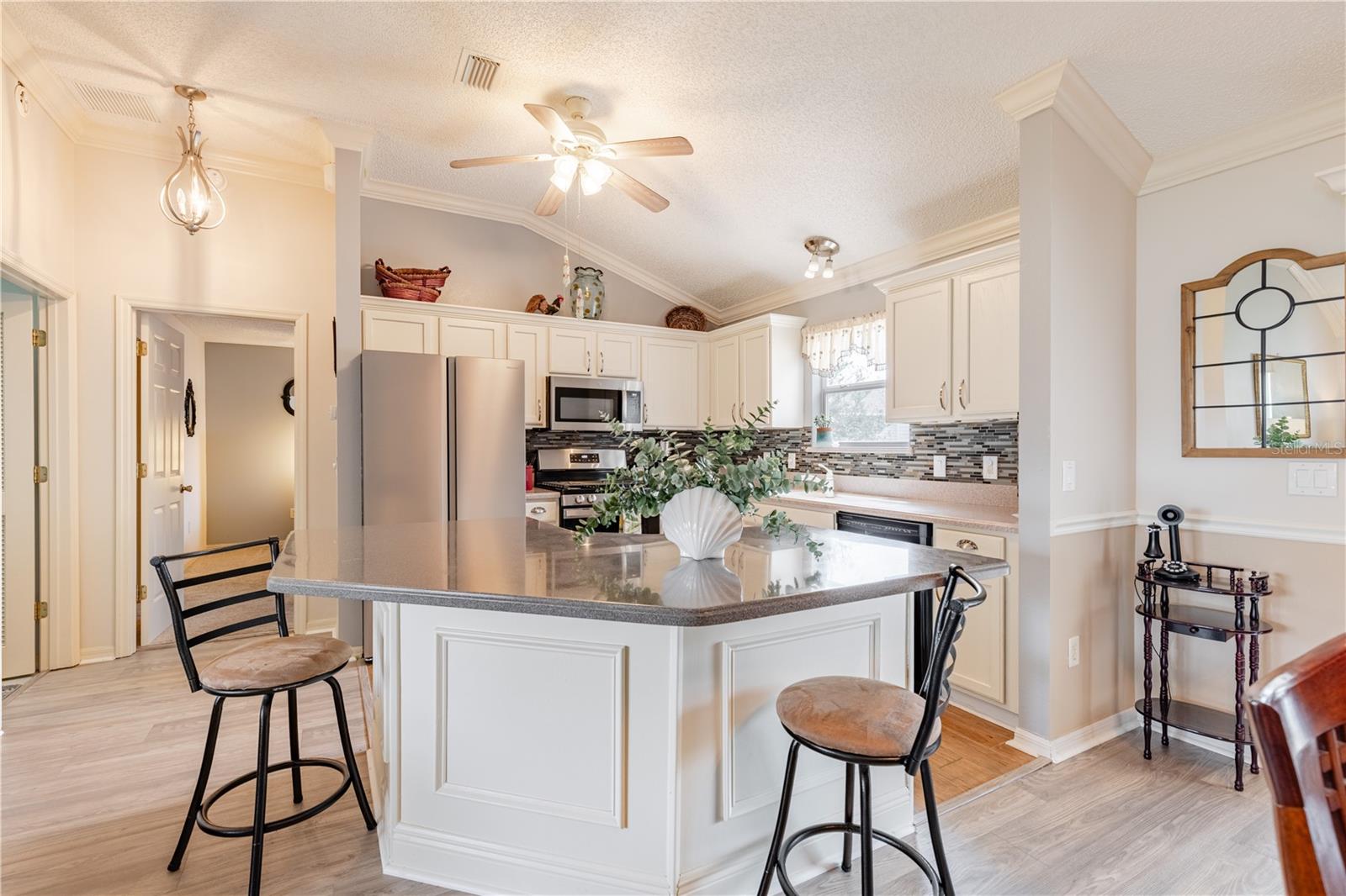 Step into this beautifully updated 3-bedroom two bathroom Bougainvillea model in the highly desirable Village of Bonnybrook—with NO BOND. 2021 ROOF & GOLF CART INCLUDED —From the moment you enter through the elegant glass front door, you’ll appreciate the light-filled interior, enhanced by a neutral palette and luxury vinyl plank flooring throughout. The kitchen shines with CORIAN Countertops, a stylish backsplash, upgraded cabinetry, CROWN MOLDING, and brand-new appliances including a refrigerator, dishwasher, and faucet. High ceilings and custom finishes add to the home’s open, refined feel. The spacious primary suite features a large walk-in closet, while the expanded lanai invites you to relax or entertain with its extended birdcage, retractable awning, and additional concrete grilling area—perfect for enjoying Florida living year-round. Additional highlights include attic stairs in the garage for added convenience. Ideally located, you’re just minutes by golf cart to Pimlico and Saddlebrook Recreation Centers, nearby executive golf courses, and the Bonnybrook pool. Enjoy quick access to Lake Sumter Landing for waterfront dining, shopping, and nightly entertainment, along with everyday conveniences including Costco, Walmart, Publix, HomeGoods, and a wide variety of restaurants and retail along the 466 corridor. This is The Villages lifestyle at its best.