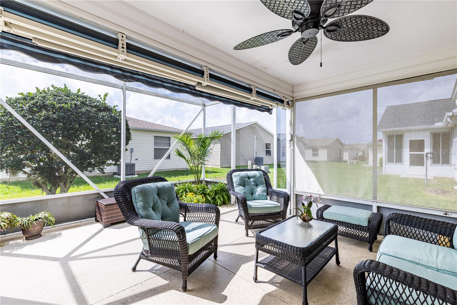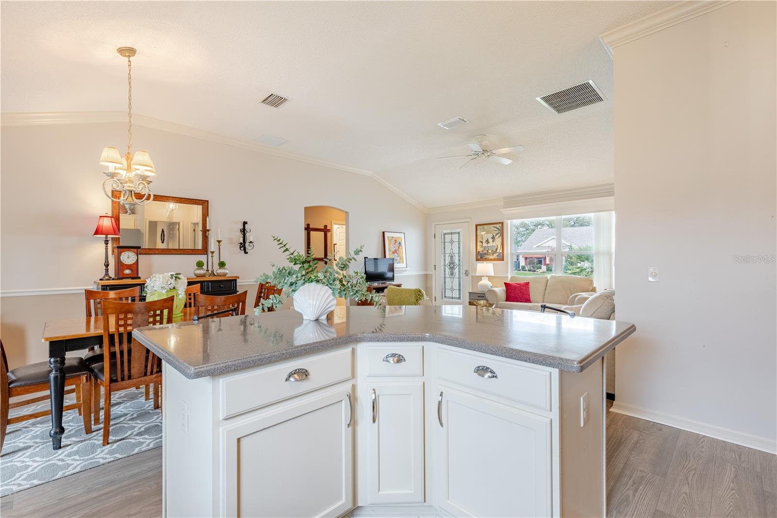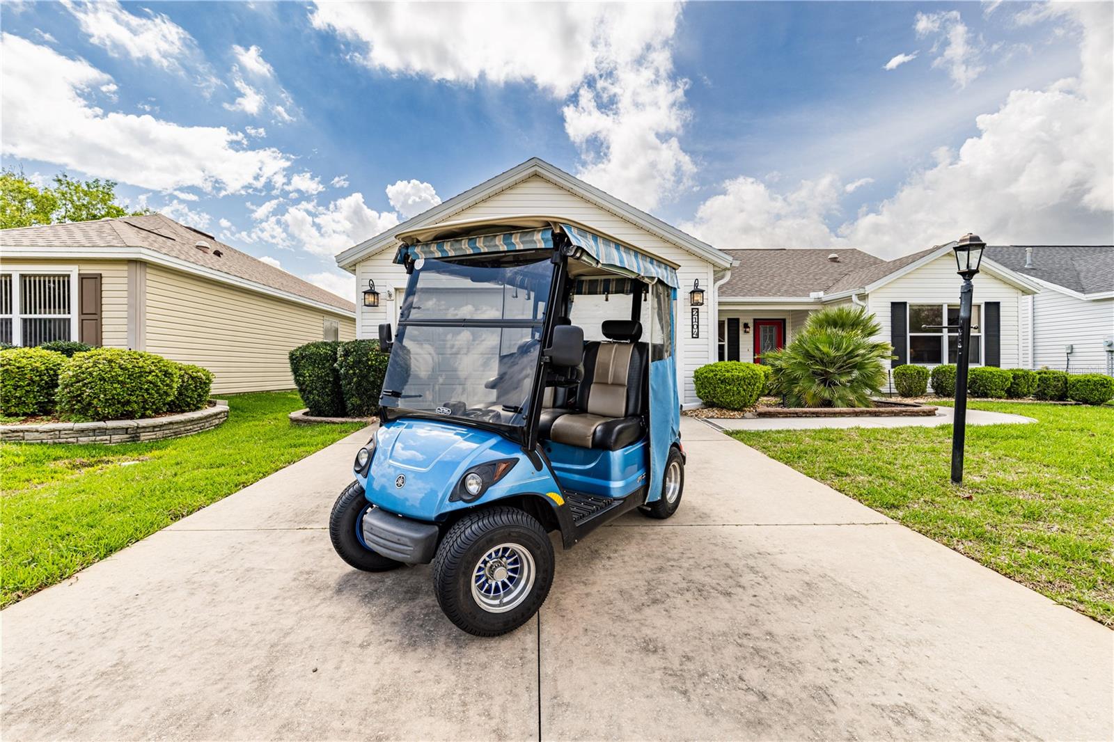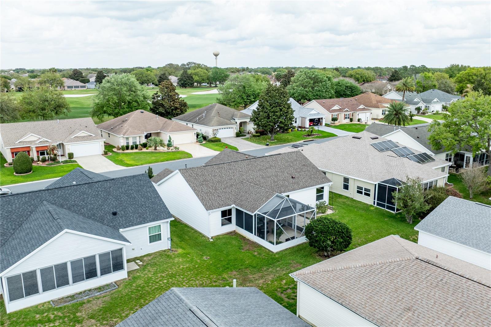 Step into this beautifully updated 3-bedroom two bathroom Bougainvillea model in the highly desirable Village of Bonnybrook—with NO BOND. 2021 ROOF & GOLF CART INCLUDED —From the moment you enter through the elegant glass front door, you’ll appreciate the light-filled interior, enhanced by a neutral palette and luxury vinyl plank flooring throughout. The kitchen shines with CORIAN Countertops, a stylish backsplash, upgraded cabinetry, CROWN MOLDING, and brand-new appliances including a refrigerator, dishwasher, and faucet. High ceilings and custom finishes add to the home’s open, refined feel. The spacious primary suite features a large walk-in closet, while the expanded lanai invites you to relax or entertain with its extended birdcage, retractable awning, and additional concrete grilling area—perfect for enjoying Florida living year-round. Additional highlights include attic stairs in the garage for added convenience. Ideally located, you’re just minutes by golf cart to Pimlico and Saddlebrook Recreation Centers, nearby executive golf courses, and the Bonnybrook pool. Enjoy quick access to Lake Sumter Landing for waterfront dining, shopping, and nightly entertainment, along with everyday conveniences including Costco, Walmart, Publix, HomeGoods, and a wide variety of restaurants and retail along the 466 corridor. This is The Villages lifestyle at its best.