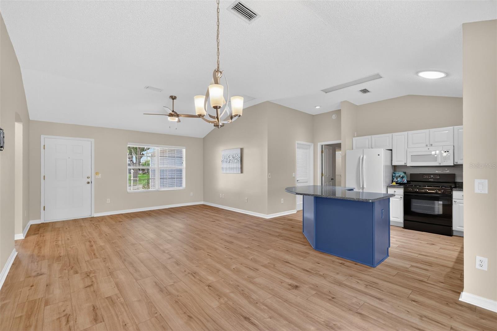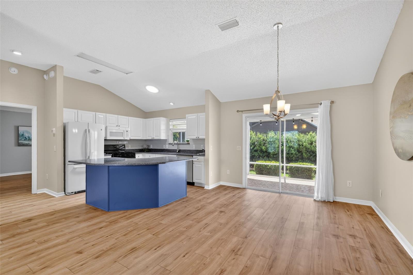 BOND PAID! Don’t miss this BEAUTIFULLY maintained Banyan Designer model (also known as the Bougainvillea) located in the desirable Village of Woodbury. This tastefully upgraded home offers inviting curb appeal with rock landscaping, a painted driveway and walkway, and a welcoming covered front patio with storm door entry. Step inside to discover laminate flooring and vaulted ceilings that create an open, airy feel. The spacious living room flows seamlessly into the dining area, featuring a chandelier with dimmable lighting and sliding glass doors that lead to the impressive outdoor space. The OVERSIZED screened lanai is truly a standout, showcasing decorative stone flooring and an expanded birdcage, perfect for relaxing or entertaining year-round. The UPGRADED kitchen features granite countertops, tiled backsplash, freshly painted cabinetry with pull-outs, a solar tube for natural light, and a window over the sink overlooking the lanai. The inside laundry room offers abundant storage along with a built-in ironing board for added convenience. The spacious primary suite includes dual walk-in closets and an en-suite bath with tile flooring, tall vanity with granite countertop, step-in shower with bench seat, and a separate commode room. Guest accommodations are ideal for visitors, with a front bedroom featuring a Murphy bed, bay window, and double-door closet, plus a second guest bedroom with its own double-door closet. The guest bathroom includes a granite countertop and tub/shower combo with glass door. LOCATION, LOCATION! Enjoy being less than 10 minutes by golf cart to Mulberry Grove Recreation Center, First Responders Regional Recreation Center, Nancy Lopez Legacy Championship Golf Courses, and the VA Clinic, with convenient access to CR 42 and US Hwy 441 for shopping, dining, and everyday essentials. This home checks all the boxes, schedule your showing today!
