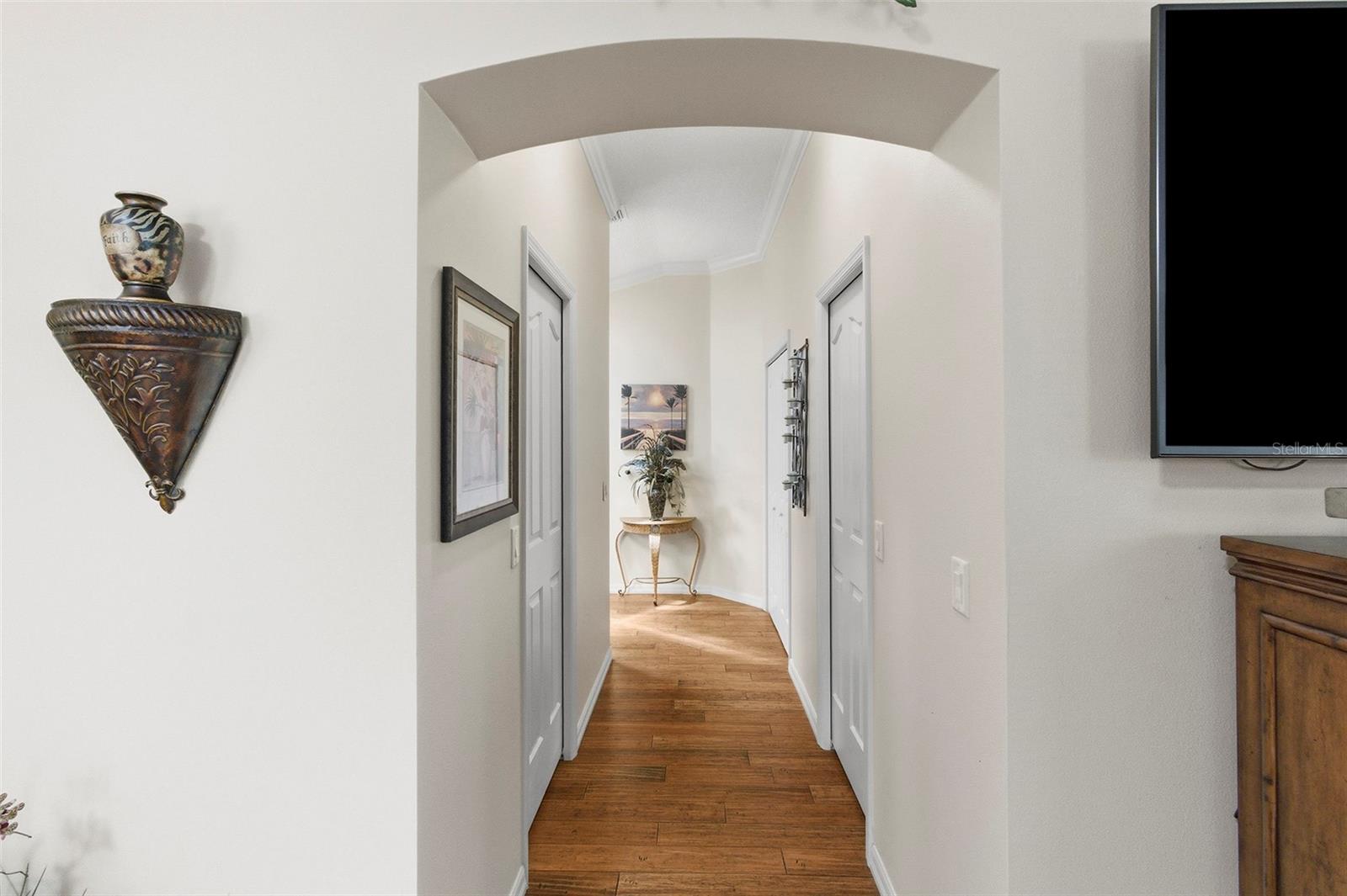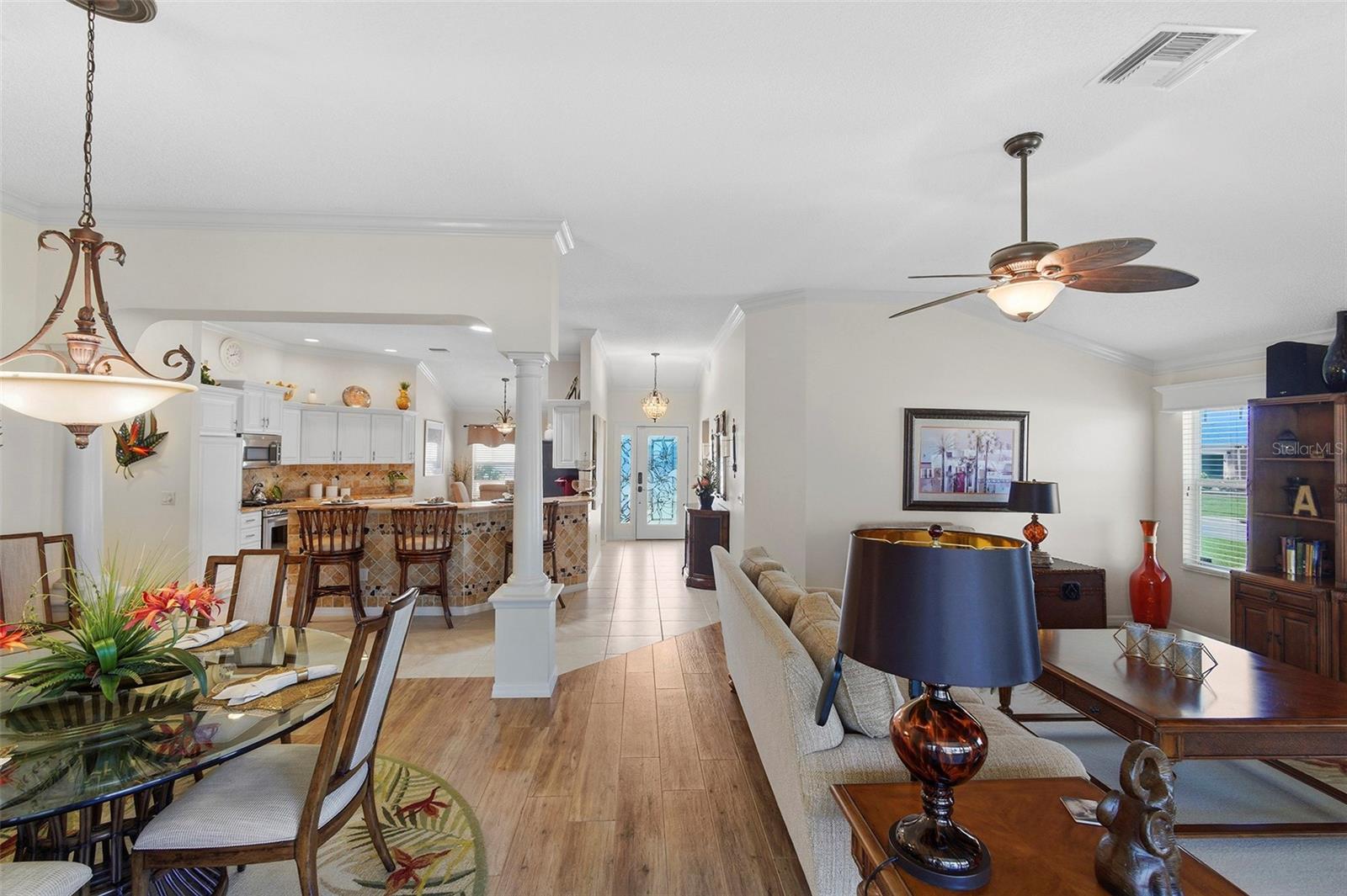 STUNNING CAMELLIA MODEL IN THE VILLAGE OF BONNYBROOK | CORNER LOT | DESIGNER UPGRADES | MOVE-IN READY Welcome Home to this beautifully UPGRADED Camellia model in the highly sought-after Village of Bonnybrook next to the 466 Shopping and Dining Corridor, Minutes from Lake-Sumter Landing. This home offers 1,915 sq. ft. of thoughtfully designed living space on a prime landscaped corner lot. From the moment you arrive, you’ll be impressed by the ENHANCED CURB APPEAL , featuring a pavered driveway and front patio, lush mature landscaping, and a welcoming entry with a lead glass front door. Step inside to discover a home filled with natural light and architectural elegance, including: *CROWN MOLDING throughout *VAULTED CEILINGS for an open, airy feel *SOLAR TUBES for abundant natural light *Large neutral 18” tile and tile wood plank flooring in main living areas *Custom wood cornices and DESIGNER FINISHES throughout The open-concept kitchen is a chef’s dream, showcasing: *Stainless Steel Appliances with gas GE range *Undermount Stainless Sink *Stone Backsplash *Travertine trim on the Breakfast Bar *Ample cabinetry and prep space - pullouts in cabinets The spacious layout includes 3 bedrooms / 2 bathrooms, with one bedroom ideal as a den or home office (no closet), perfect for today’s flexible lifestyle. Relax and unwind in the enclosed rear lanai, featuring Chattanooga River Rock flooring , creating a serene indoor-outdoor retreat for year-round enjoyment. The Primary Suite offers a luxurious escape with: *Dual granite vanities *Double walk-in closets *Renovated walk-in shower with seamless glass enclosure *Updated lighting and fixtures The Guest Bathroom has also been tastefully updated with a tiled shower and newer glass doors, ensuring comfort for family and visitors alike. Additional highlights include: *NEWER AC (2018) *Immaculate 2-car garage *Meticulously maintained interior and exterior Located just minutes from golf, shopping, dining, recreation centers, and all the lifestyle amenities that make The Villages one of the most desirable active adult communities in the country. PLEASE NOTE: Current Washer and dryer do not convey. Don’t miss your opportunity to own this beautifully upgraded home in one of the most desirable Villages locations—schedule your private showing today! TAKE A MOMENT TO WATCH THE VIDEO TOUR BY CLICKING ON THE TOUR LINK ABOVE.