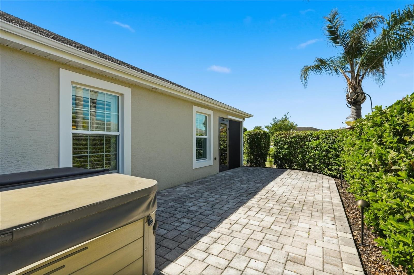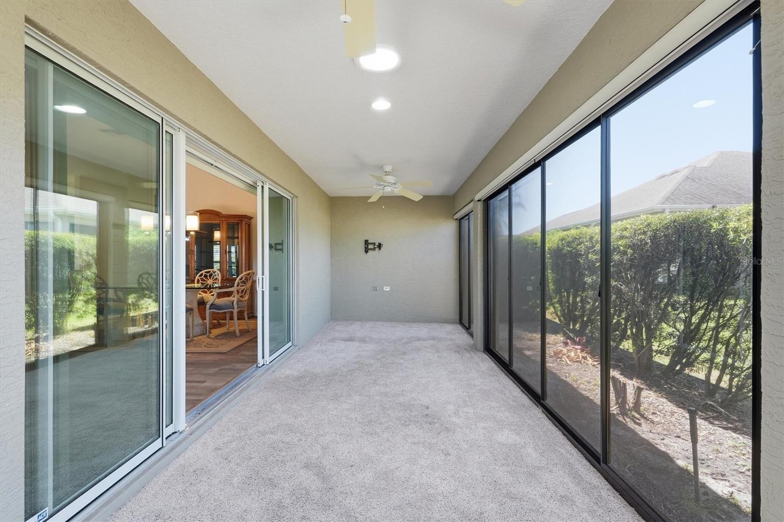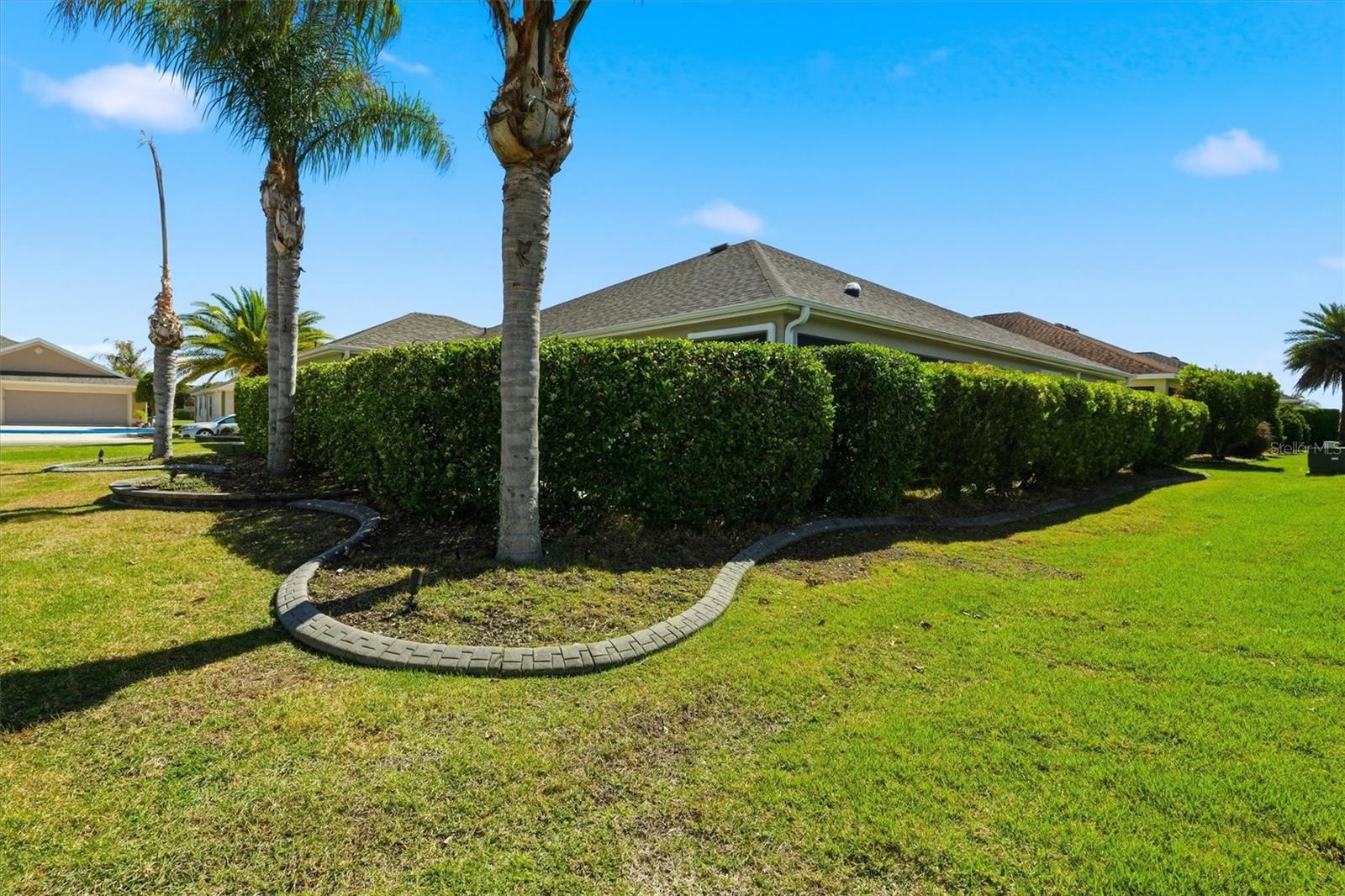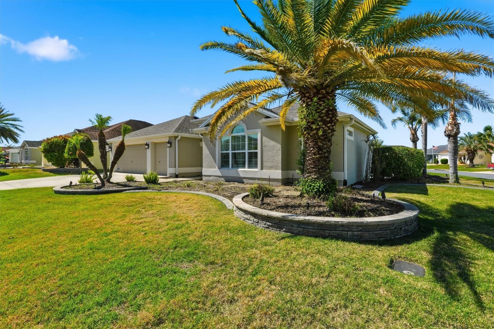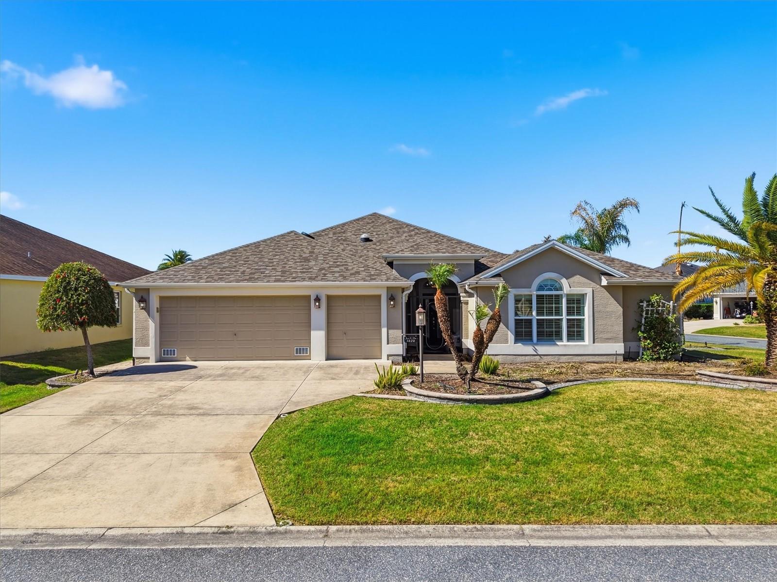 Welcome to this beautifully appointed 3/3 with golf cart garage, Begonia Designer Home in the Village of Dunedin, perfectly situated on a desirable corner lot and designed for both comfort and style. From the moment you arrive, the screened front porch and stunning stained glass front door with matching side panel and transom window create a warm and elegant first impression. Step inside to a welcoming entry foyer, where a privacy door leads to two guest bedrooms—ideal for hosting family and friends. The open and split floor plan offers both spaciousness and functionality, enhanced by plantation shutters, ceiling fans throughout, and wood-look laminate flooring in the main living areas, with soft carpeting in the bedrooms. The upgraded eat-in kitchen is a true centerpiece, featuring stainless steel appliances, a breakfast bar with pendant lighting, dining nook, and both under and over cabinet lighting for added ambiance. A solar tube fills the space with natural light, while thoughtful details make this kitchen as practical as it is beautiful. This home boasts two master suites, providing exceptional flexibility. The primary master bedroom features a tray ceiling, his and hers walk-in closets, and an ensuite bath with dual split vanities, a private water closet, and a walk-in shower (no tub). The second master suite also includes its own ensuite bath with a walk-in shower—perfect for guests seeking privacy. The third bedroom offers versatility as a home office, den, or craft room, while the guest bath includes a convenient shower/tub combination. Enjoy year-round relaxation in the enclosed, temperature-controlled lanai with pull-down shades, or step outside to the private paver patio complete with a jacuzzi and lush privacy hedge—your own personal retreat. Additional highlights include a whole-home water filtration system, custom closets,interior lanundry room, and a spacious 2-car plus golf cart garage—providing ample room for vehicles, storage, and all your lifestyle needs. With thoughtful upgrades and inviting indoor and outdoor living spaces, this home offers the perfect blend of elegance and everyday comfort. Close to Manatee Village Recreation center, Evans Prairie Country Club and Executive Golf courses. Brownwood town center is just a short golf car ride for dining, entertainment and shopping. It’s the perfect place to start living the Villages lifestyle. Watch our Video and call to make your appointment to see this home today!