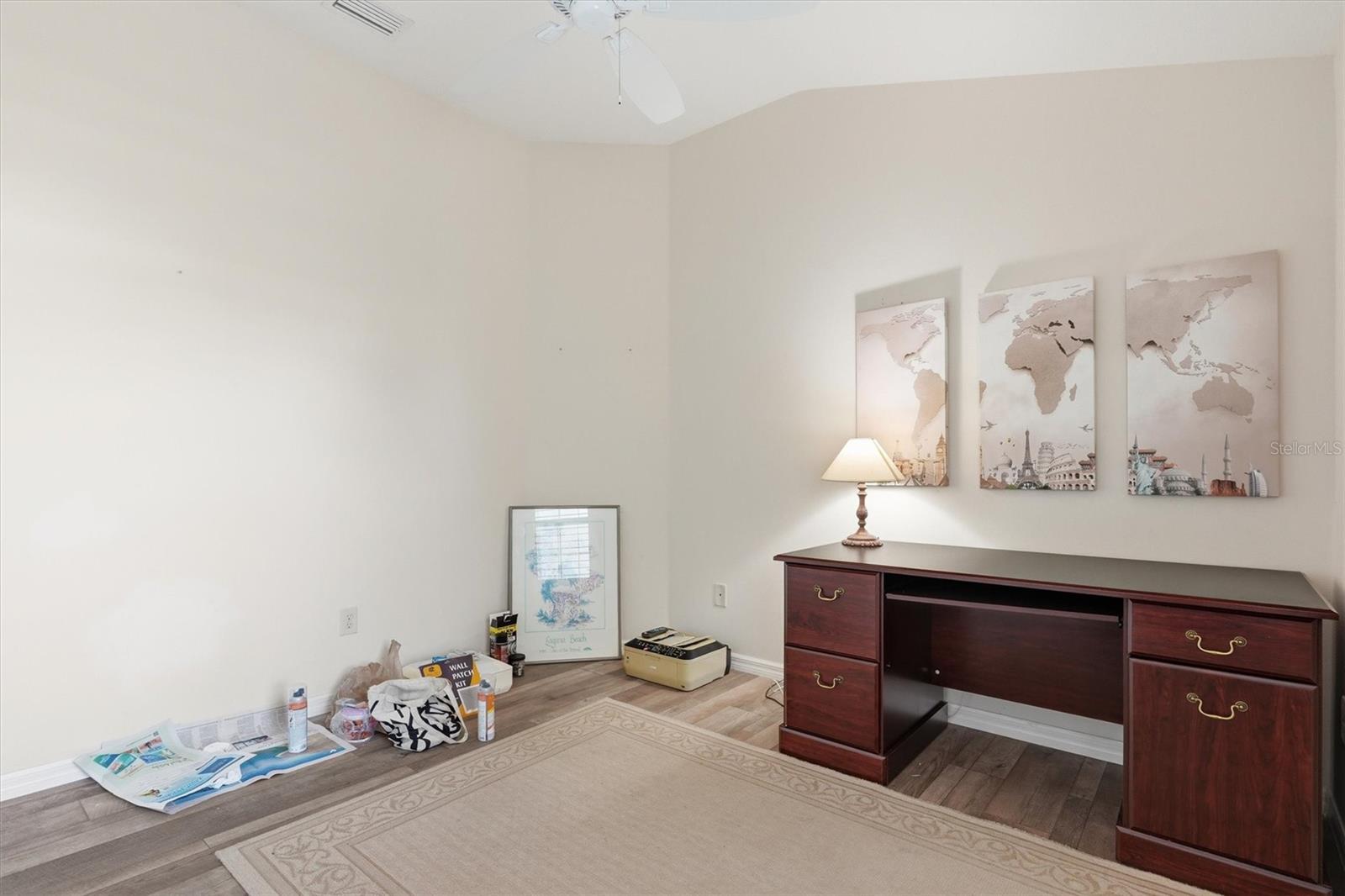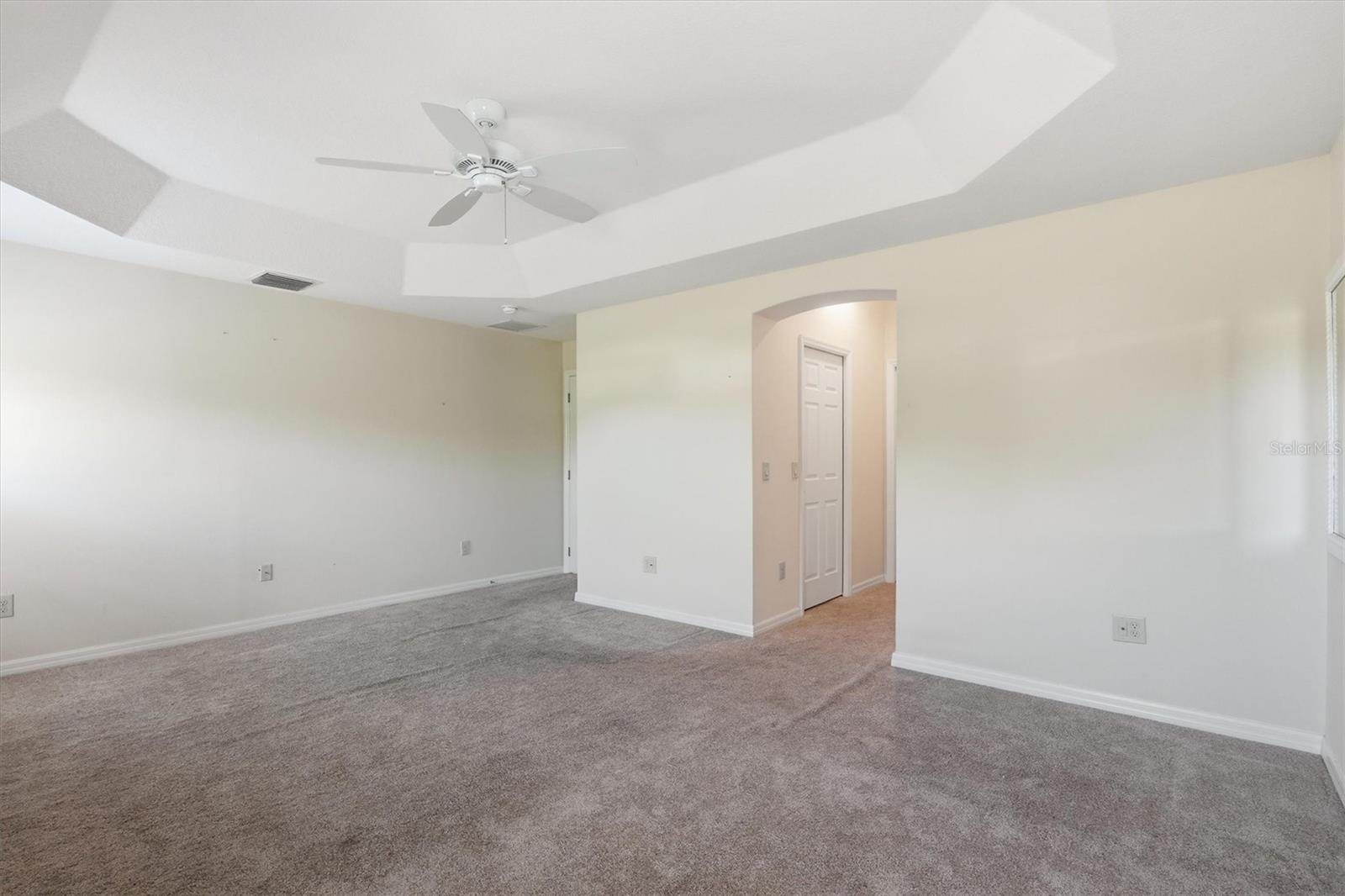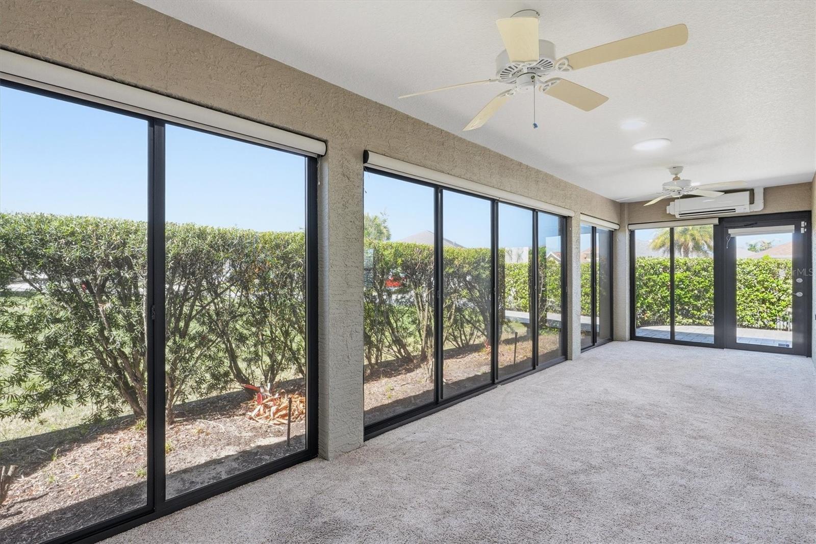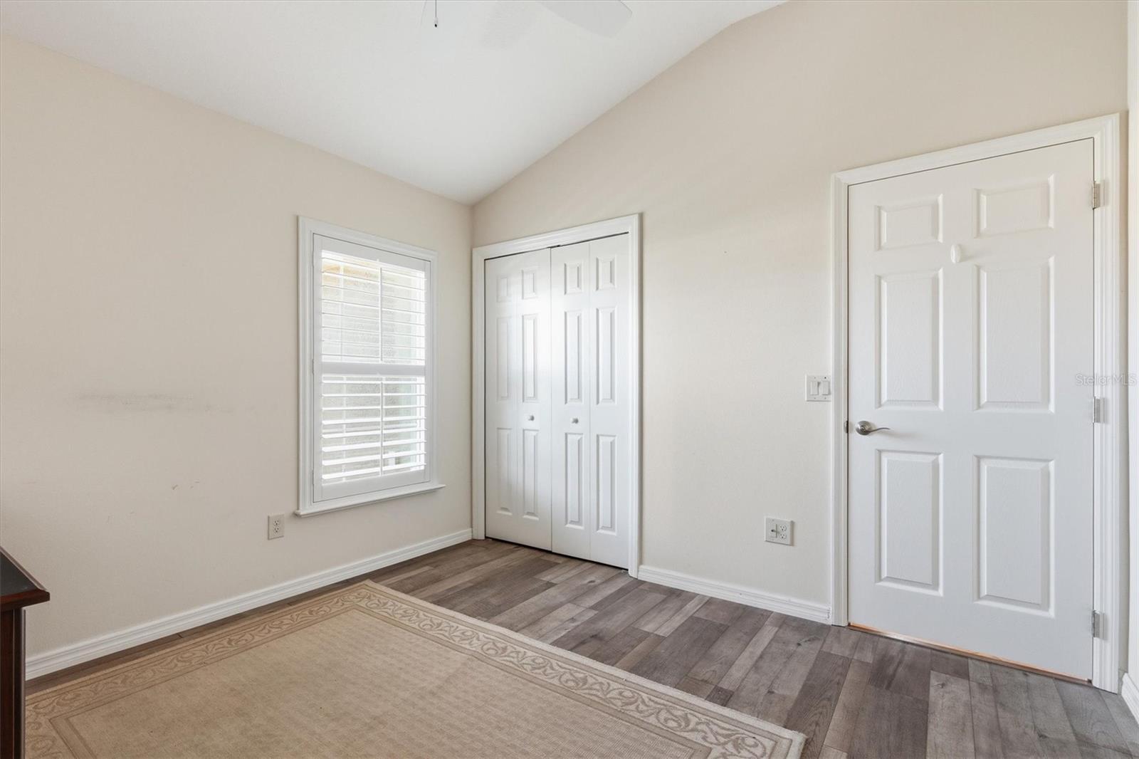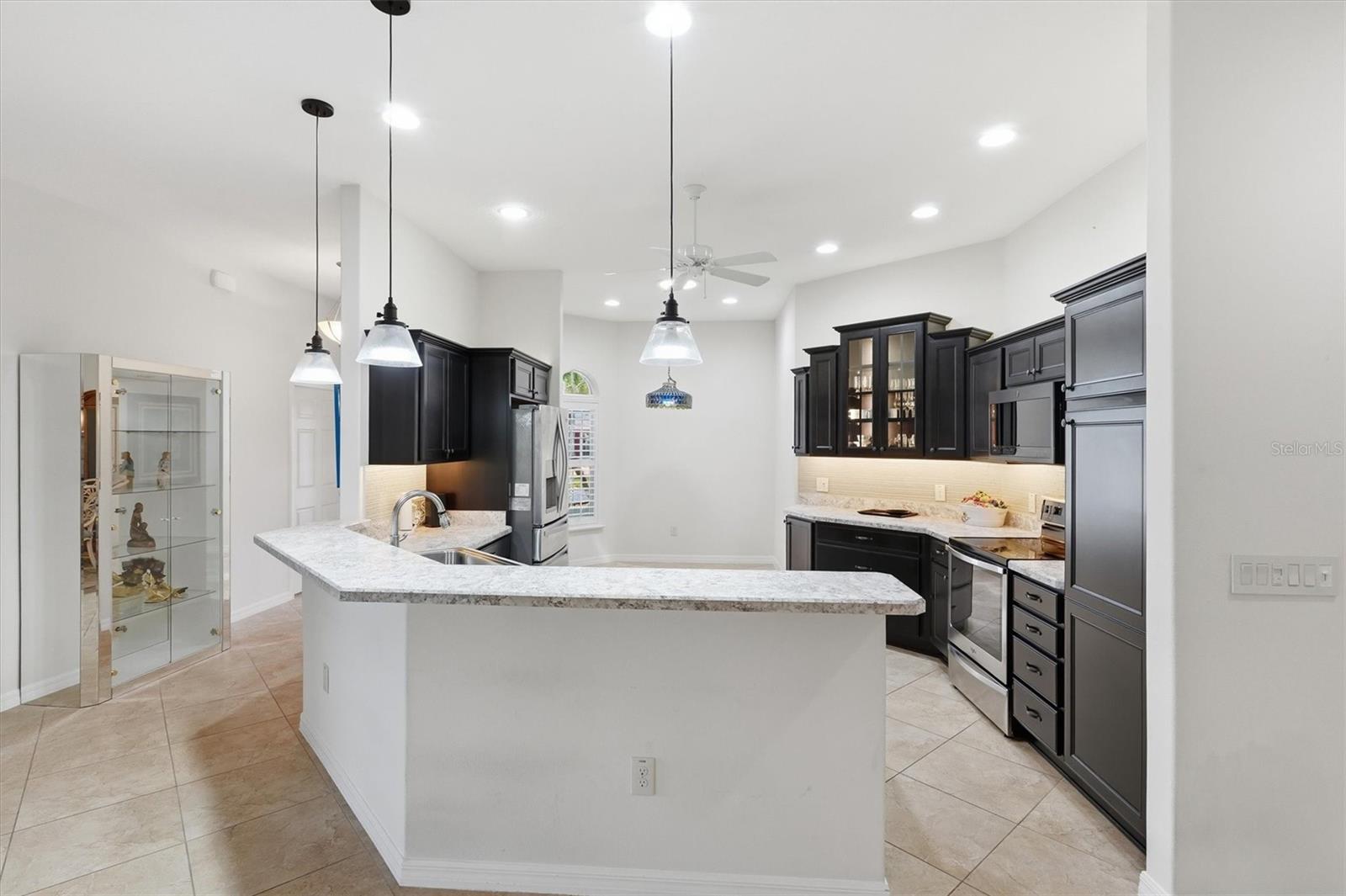 Welcome to this beautifully appointed 3/3 with golf cart garage, Begonia Designer Home in the Village of Dunedin, perfectly situated on a desirable corner lot and designed for both comfort and style. From the moment you arrive, the screened front porch and stunning stained glass front door with matching side panel and transom window create a warm and elegant first impression. Step inside to a welcoming entry foyer, where a privacy door leads to two guest bedrooms—ideal for hosting family and friends. The open and split floor plan offers both spaciousness and functionality, enhanced by plantation shutters, ceiling fans throughout, and wood-look laminate flooring in the main living areas, with soft carpeting in the bedrooms. The upgraded eat-in kitchen is a true centerpiece, featuring stainless steel appliances, a breakfast bar with pendant lighting, dining nook, and both under and over cabinet lighting for added ambiance. A solar tube fills the space with natural light, while thoughtful details make this kitchen as practical as it is beautiful. This home boasts two master suites, providing exceptional flexibility. The primary master bedroom features a tray ceiling, his and hers walk-in closets, and an ensuite bath with dual split vanities, a private water closet, and a walk-in shower (no tub). The second master suite also includes its own ensuite bath with a walk-in shower—perfect for guests seeking privacy. The third bedroom offers versatility as a home office, den, or craft room, while the guest bath includes a convenient shower/tub combination. Enjoy year-round relaxation in the enclosed, temperature-controlled lanai with pull-down shades, or step outside to the private paver patio complete with a jacuzzi and lush privacy hedge—your own personal retreat. Additional highlights include a whole-home water filtration system, custom closets,interior lanundry room, and a spacious 2-car plus golf cart garage—providing ample room for vehicles, storage, and all your lifestyle needs. With thoughtful upgrades and inviting indoor and outdoor living spaces, this home offers the perfect blend of elegance and everyday comfort. Close to Manatee Village Recreation center, Evans Prairie Country Club and Executive Golf courses. Brownwood town center is just a short golf car ride for dining, entertainment and shopping. It’s the perfect place to start living the Villages lifestyle. Watch our Video and call to make your appointment to see this home today!