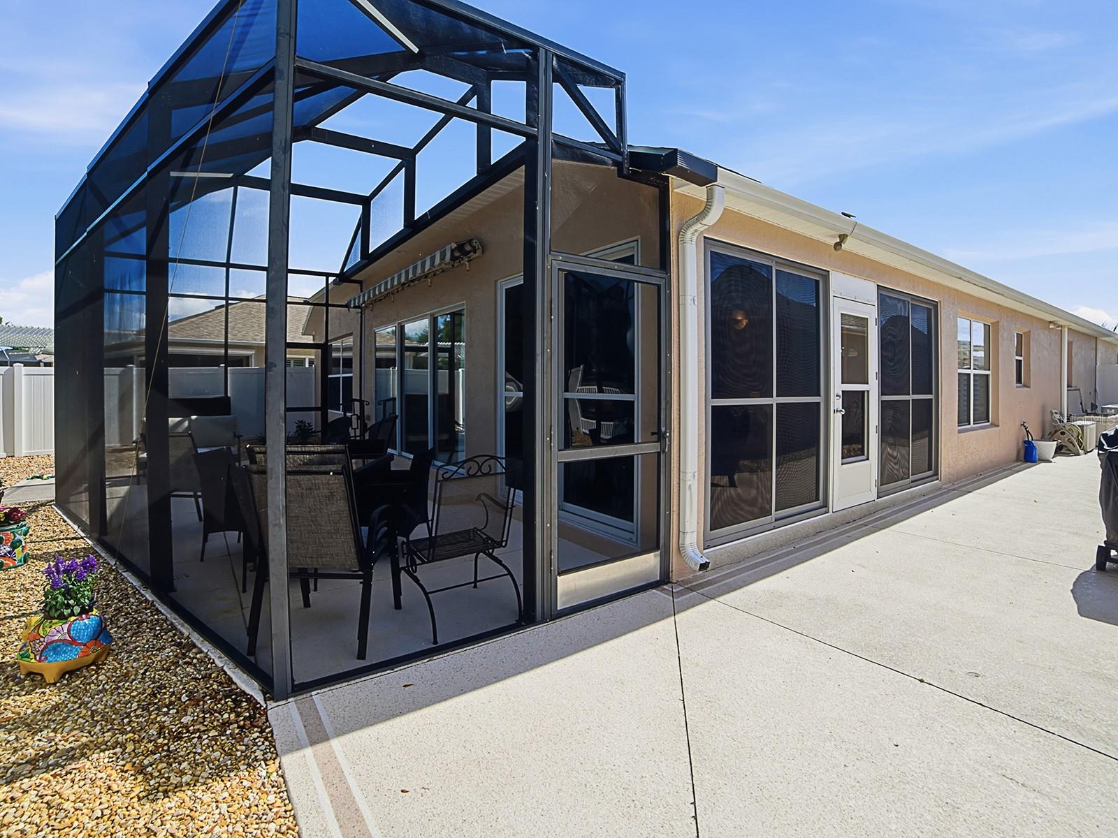Welcome to your dream courtyard villa situated on the beautiful Jacaranda Championship Golf Course. This stunning three-bedroom, two-bath home offers a perfect blend of luxury and comfort. Step inside to brand new luxury vinyl plank flooring, complemented by six-inch baseboards throughout, creating a sleek, modern feel. Fresh paint graces every wall and ceiling, and the kitchen dazzles with brand new LG stainless steel appliances, quartz countertops, new stainless steel sink, and new garbage disposal. Enjoy upscale remote-controlled custom window treatments in the living room. The primary bath has been beautifully updated with a new vanity featuring dual sinks, quartz top & new mirrors. The home boasts a new roof (2025), a new water heater with a recirculating pump (2026), an insulated garage door, and a mini-split AC in the glass-enclosed lanai. Relax under the power awning in the expansive birdcage while enjoying the panoramic golf course view and phenomenal sunsets. Plantation shutters adorn bedroom #2, #3, the dining room, and garage. Plus, brand new low-maintenance landscaping was installed in April 2026. This villa is part of the larger “Jacaranda Island” neighborhood, celebrated as one of the friendliest and most social neighborhoods in The Villages. Nestled in the Altamonte Villas community, it is ideally located between Lake Sumter Landing and Brownwood Paddock Square with all the conveniences you desire nearby. This is a rare opportunity you won't want to miss!
