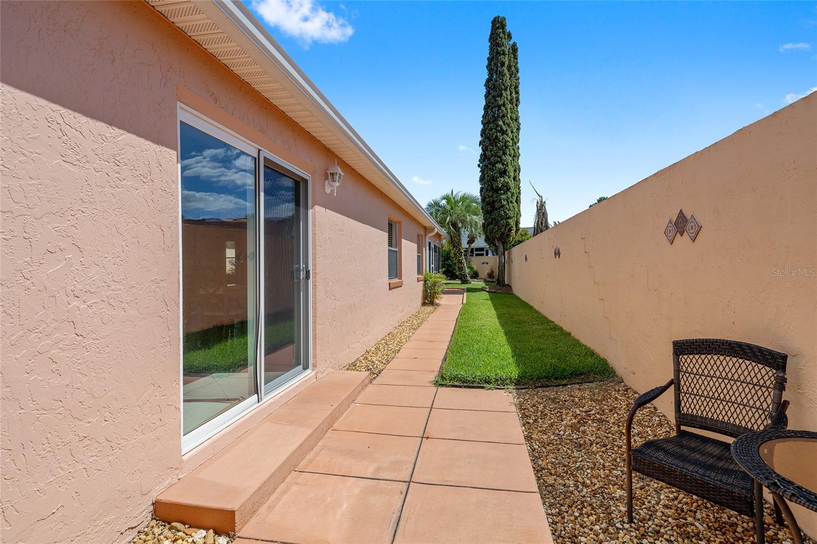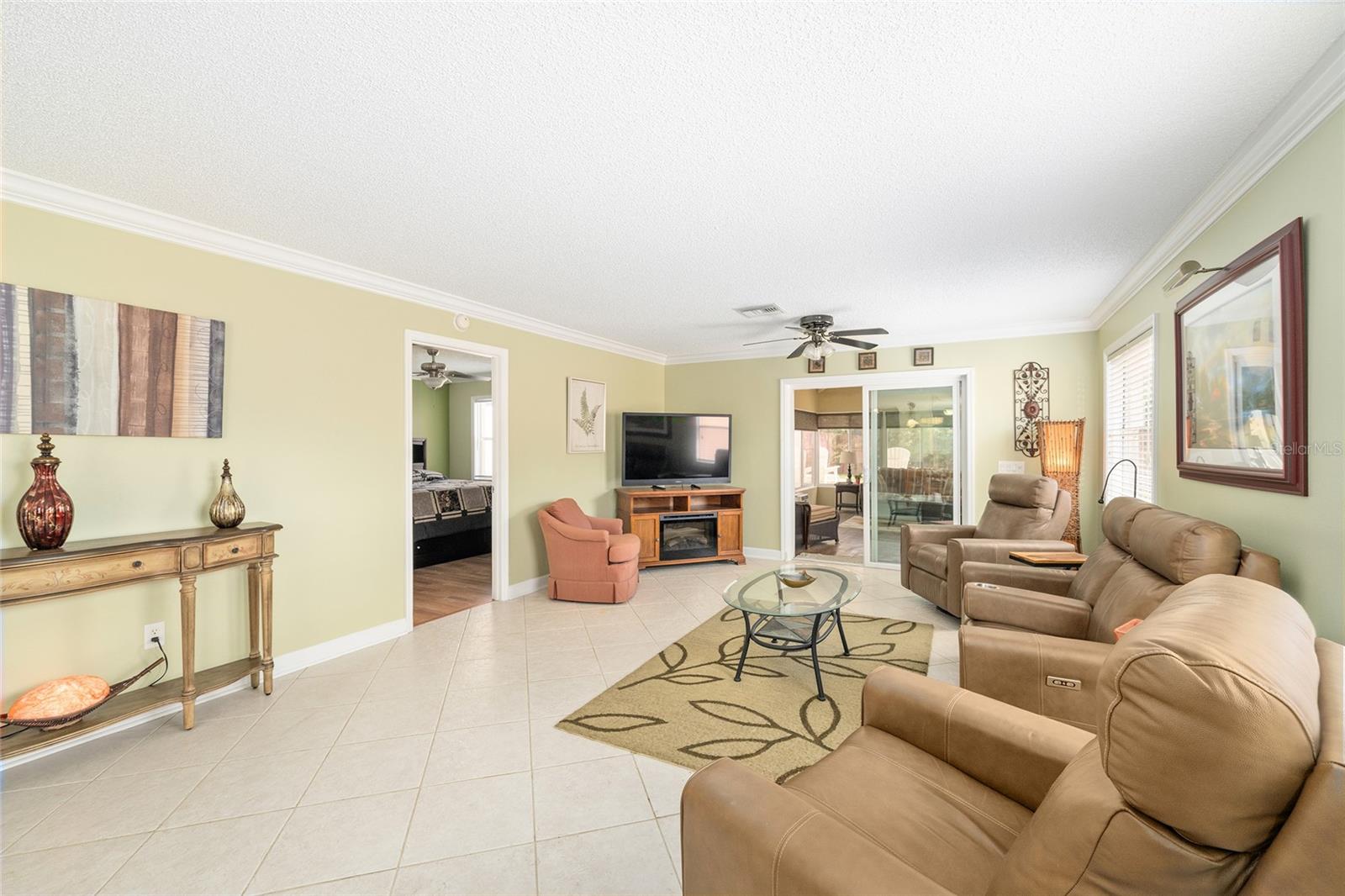 Welcome to this EXPANDED BAJA COURTYARD VILLA, a 2-bedroom, 2-bathroom TURN-KEY home with NO BOND & GOLF CART INCLUDED! Step inside to find TILE FLOORING throughout the living areas and CROWN MOLDING adding an elegant touch throughout the home. The front of the home features ROCK LANDSCAPING for easy curb appeal with minimal upkeep. The kitchen is sure to impress with CROWNED WHITE CABINETS, GRANITE COUNTERTOPS, a TILE BACKSPLASH, PENDANT LIGHTING, and an extended island with cabinets, making it as stylish as it is functional. The primary suite features a WALK-IN CLOSET and an attached EN SUITE bathroom appointed with an UPGRADED VANITY, CHAIR RAIL detailing, and a TILED WALK-IN SHOWER, providing a private and relaxing retreat. The guest bedroom offers a BUILT-IN CLOSET, and the guest bathroom is well appointed with WHITE CABINETS, GRANITE COUNTERTOPS, and a TUB/SHOWER COMBO. The FLORIDA ROOM is a true bonus space, complete with a MINI SPLIT for year round comfort and VAULTED CEILINGS. Step outside to your PRIVATE BACKYARD with LUSH GRASS, surrounded by a PRIVACY WALL, featuring a PATIO PAD and a dedicated SIDE PATIO AREA perfect for grilling and outdoor entertaining. Roof (2021) HVAC (2017) Enjoy all The Villages lifestyle has to offer with recreation centers, shopping and dining, and just minutes from Spanish Springs and Lake Sumter Landing Town Squares!