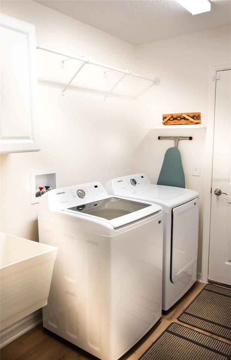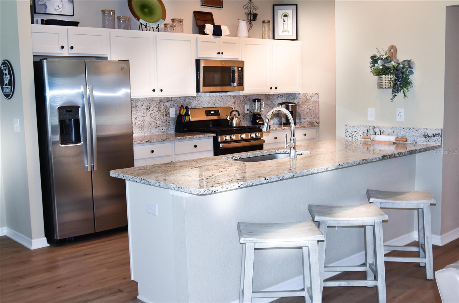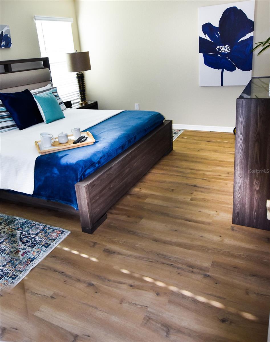UPSCALE LUXURY meets comfortability in this "just turned three" year old, WATERFRONT, LIGHT and BRIGHT home, vinyl flooring throughout!! With a fully enclosed huge yard, your furry pets will have a place to freely romp and you have to space for a HUGE POOL!! Additionally there is a large dog park just down the street. Whether you are looking for an investment property, a full-time residence, or a mix of both, this highly sought after home is the answer. We have had it rented EVERY DAY for 18 months, with 5 different leases ranging from short to mid-term, October '24-March '26. Turnkey package available to simplify your transition to living in "The Friendliest Hometown in Florida" The MILES of GRANITE countertops and back splash in the kitchen and both bathrooms as well as the in-mount sinks assist in simplified cleaning. An upscale kitchen does not disappoint with a large pantry, immense peninsula and four-burner gas stove with removable stove-top griddle, and pull-out cabinets are a chef's delight. The split floor plan allows your guests their own space. Open concept, vaulted ceiling in main living areas create plenty of room for warm memories to be made. Enhanced landscaping and serene view from the epoxied lanai make this a perfect oasis. The expanded patio with brick pavers with additional patio add to the ambiance. Enhanced landscaping literally wraps it warmth around you both as you approach the front door and as you melt into your own back yard resort....Did we mention there is room for a POOL!!! An epoxied garage boasts a bump-out allowing for a work bench. The attic pull down stairs partially reinforced flooring give added storage. Gutters and surveillance cameras are around the entire perimeter.