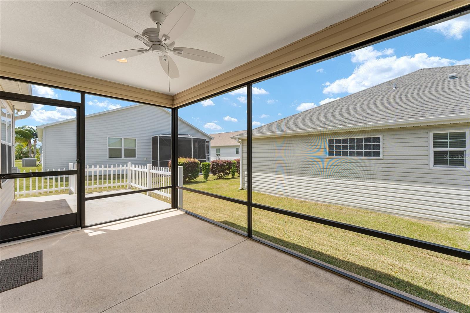 One or more photo(s) has been virtually staged. The charm is in this beautiful cottage At Ease III model home located in The Village of Pine Ridge. You will notice the enhanced landscaping and painted driveway, setting the tone for the rest of this incredible home. Upon entering, your eyes are immediately drawn to the vaulted ceilings that create an open and spacious atmosphere throughout. Laminate Plank Flooring flows seamlessly through the main living area, complemented by updated fans and lights that add a touch of warmth. The kitchen is any chef's dream with its Whirlpool appliances, ample cabinets, large pantry, and breakfast nook. Imagine preparing meals while enjoying your family and friends. The oversize primary suite boasts an extra spacious closet and ensuite complete with double sinks and a walk-in shower. The second bedroom is located at the front of the house, providing endless possibilities as an office, craft room or reading area. The third bedroom is perfect for family or guests and conveniently located next to the second bathroom. You will be impressed with the screened-in Lanai where you can enjoy morning coffee or evening cocktails. You will also discover off the Lanai a patio surrounded by a charming picket fence. This prime location offers easy access to executive and championship golf courses as well as Colony Cottage Recreation Center for activities like swimming or pickleball tournaments. For delicious meals out or live entertainment (weather permitting), take a short golf cart ride over to Brownwood Paddock Square or Lake Sumter Landing Market Square - both just minutes away! Don't miss out on this opportunity to own a stunning cottage At Ease model home in The Village of Pine Ridge located in The Villages, FL. Schedule a showing today before it's too late!