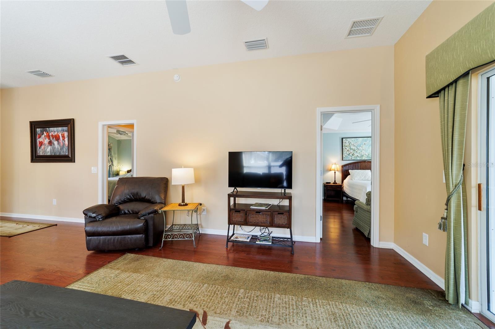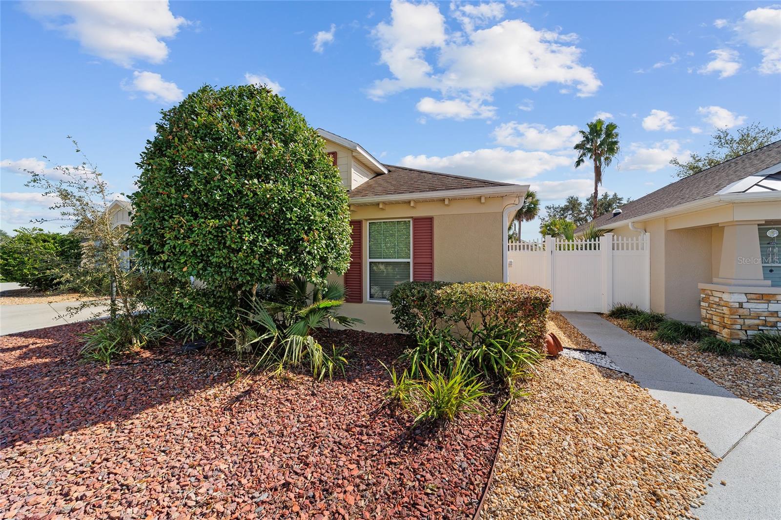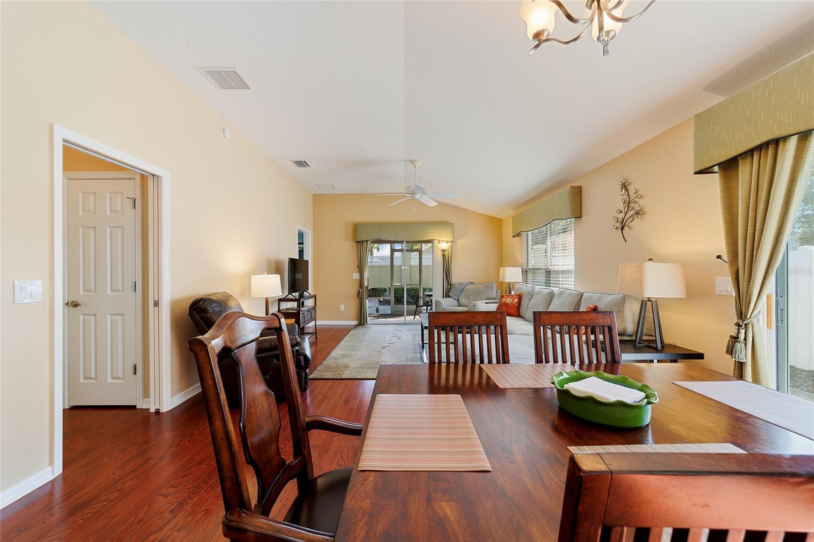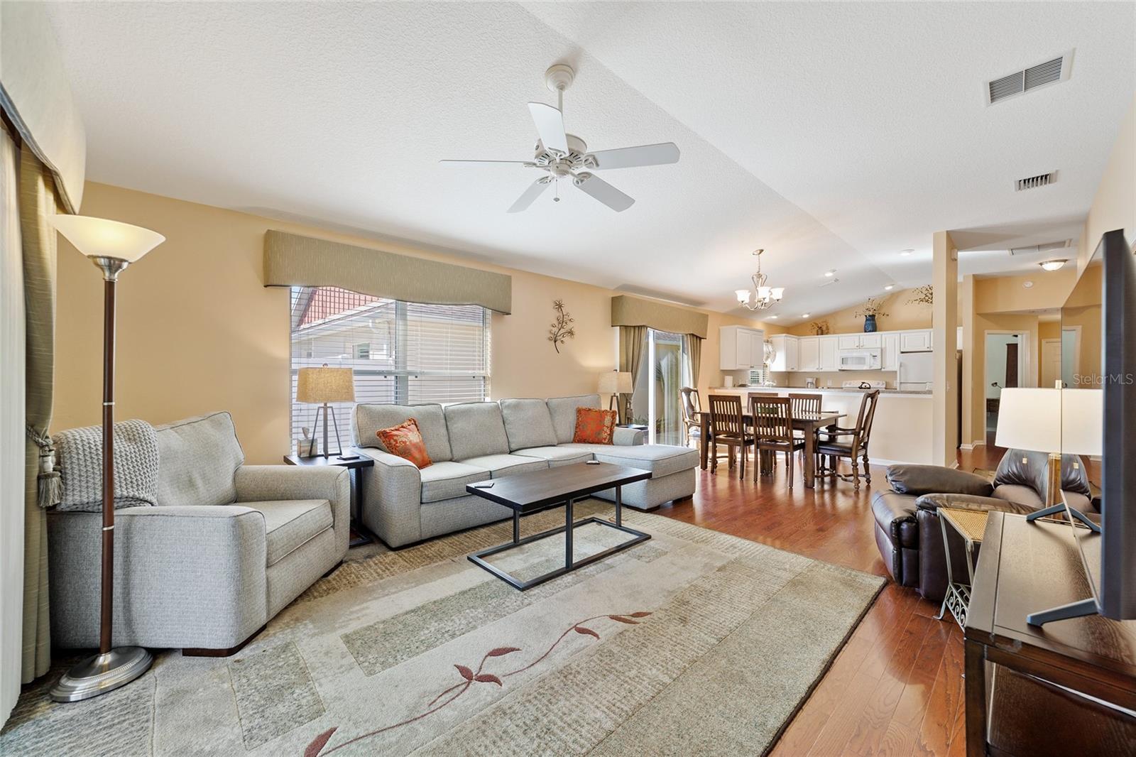 Walk to Sumter Landing in THE VILLAGES. Immediate occupancy in this BUNGALOW that is TURN KEY! 3 bedrooms and 2 baths. Vaulted ceilings. Beautiful wood flooring throughout and Tile in the baths. Enjoy your private screen enclosed Lanai for relaxation or a nice place for your pet(s). Breakfast bar offering casual dining in kitchen area plus a dining area. Kitchen features white cabinets. Sliders out to patio for convience to Grilling. Primary bedroom with a tray ceiling and a walk in closet plus sliders to the Lanai. 3rd bedroom is currently be used as an office. Square footage information is taken from the Public Record and is deemed reliable, but not guaranteed. Room and garage dimensions are approximate: buyer to verify. The BOND balance is $5925. This is truly LOCATION! LOCATION! LOCATION! Movies, restaurants ...everything just a short walk or cart ride away.