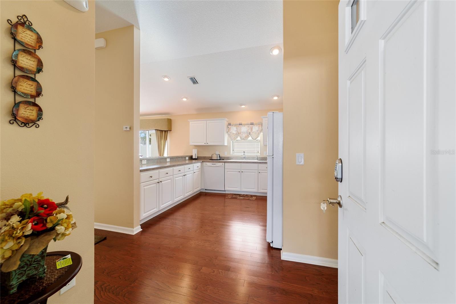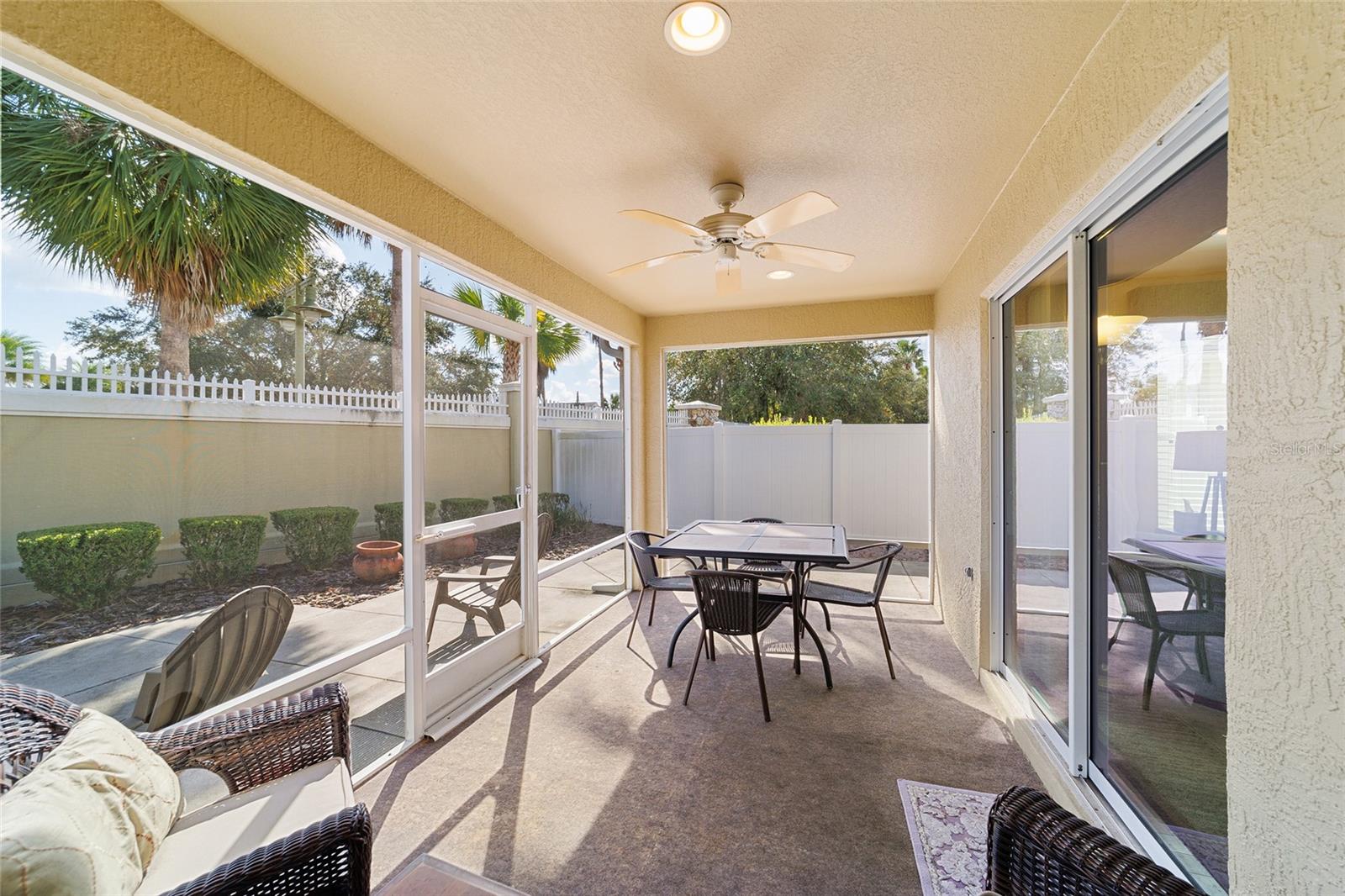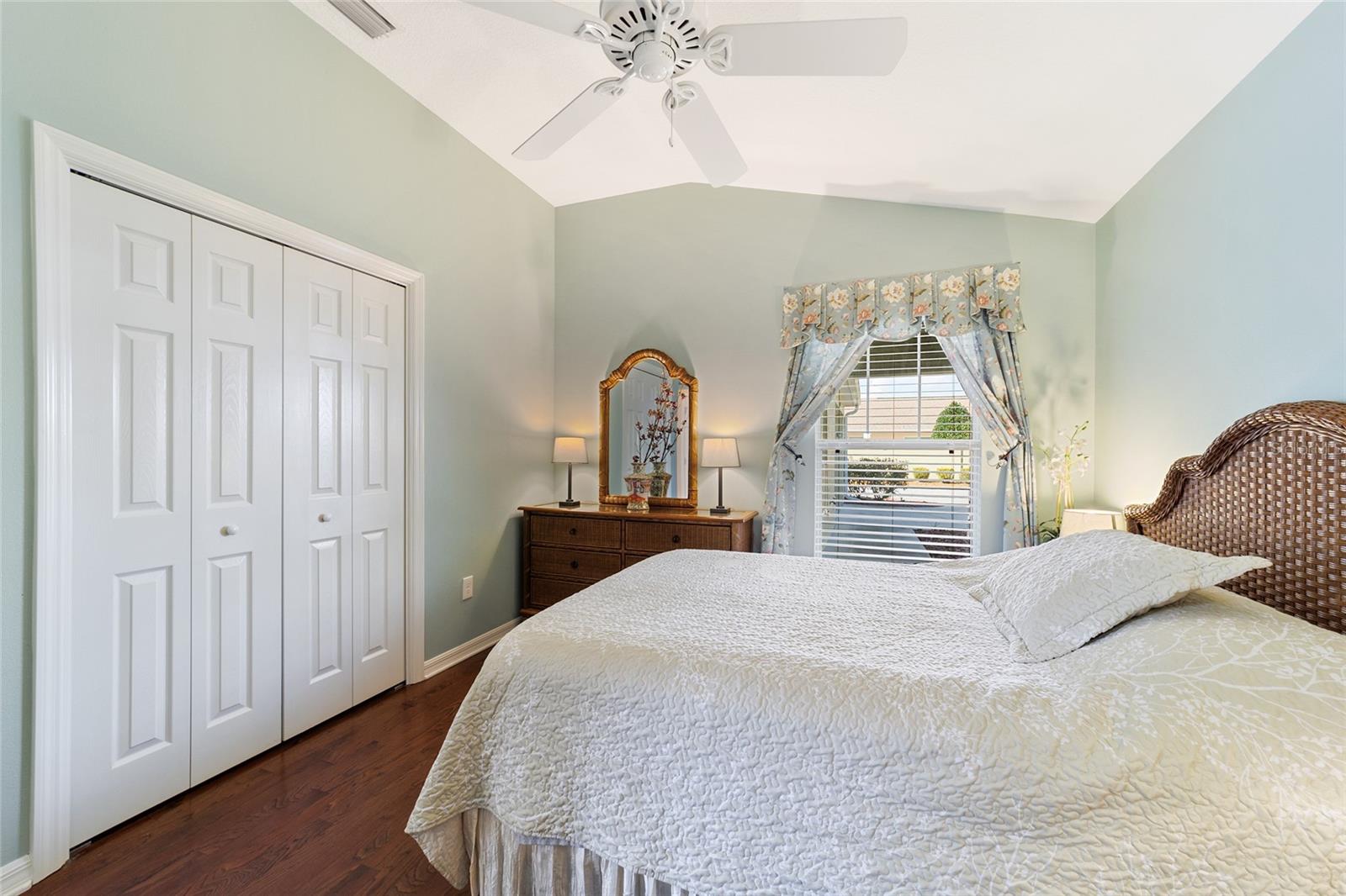 Walk to Sumter Landing in THE VILLAGES. Immediate occupancy in this BUNGALOW that is TURN KEY! 3 bedrooms and 2 baths. Vaulted ceilings. Beautiful wood flooring throughout and Tile in the baths. Enjoy your private screen enclosed Lanai for relaxation or a nice place for your pet(s). Breakfast bar offering casual dining in kitchen area plus a dining area. Kitchen features white cabinets. Sliders out to patio for convience to Grilling. Primary bedroom with a tray ceiling and a walk in closet plus sliders to the Lanai. 3rd bedroom is currently be used as an office. Square footage information is taken from the Public Record and is deemed reliable, but not guaranteed. Room and garage dimensions are approximate: buyer to verify. The BOND balance is $5925. This is truly LOCATION! LOCATION! LOCATION! Movies, restaurants ...everything just a short walk or cart ride away.
